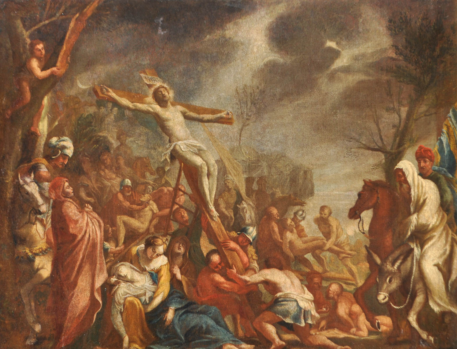 Maler der 1. Hälfte des 18. Jh., wohl venezianisch Innalzamento della croce;Olio su tela, 62 x 81,5 cm, rintelato, piccoli ritocchi, in cornice