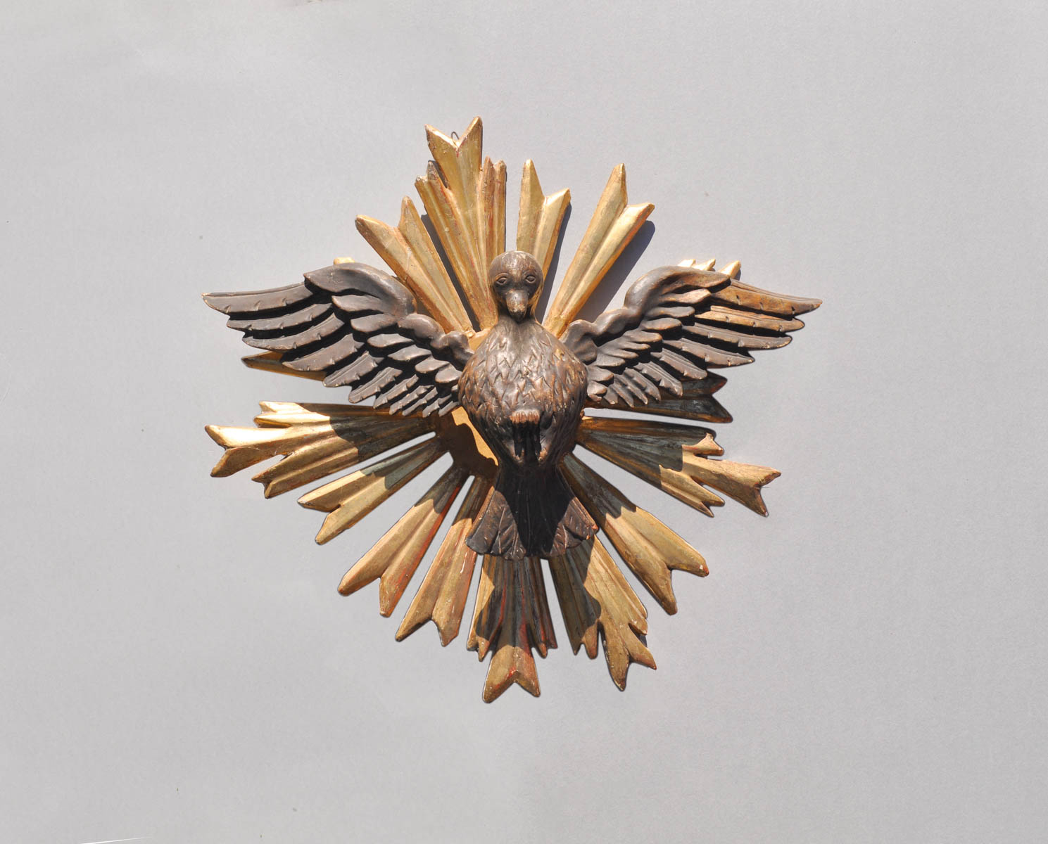 Anonym/Anonimo Colomba dello Spirito Santo con raggiera, area alpina, XIX secolo;Legno, scolpito a tutto tondo e dipinto, raggiera dorata,