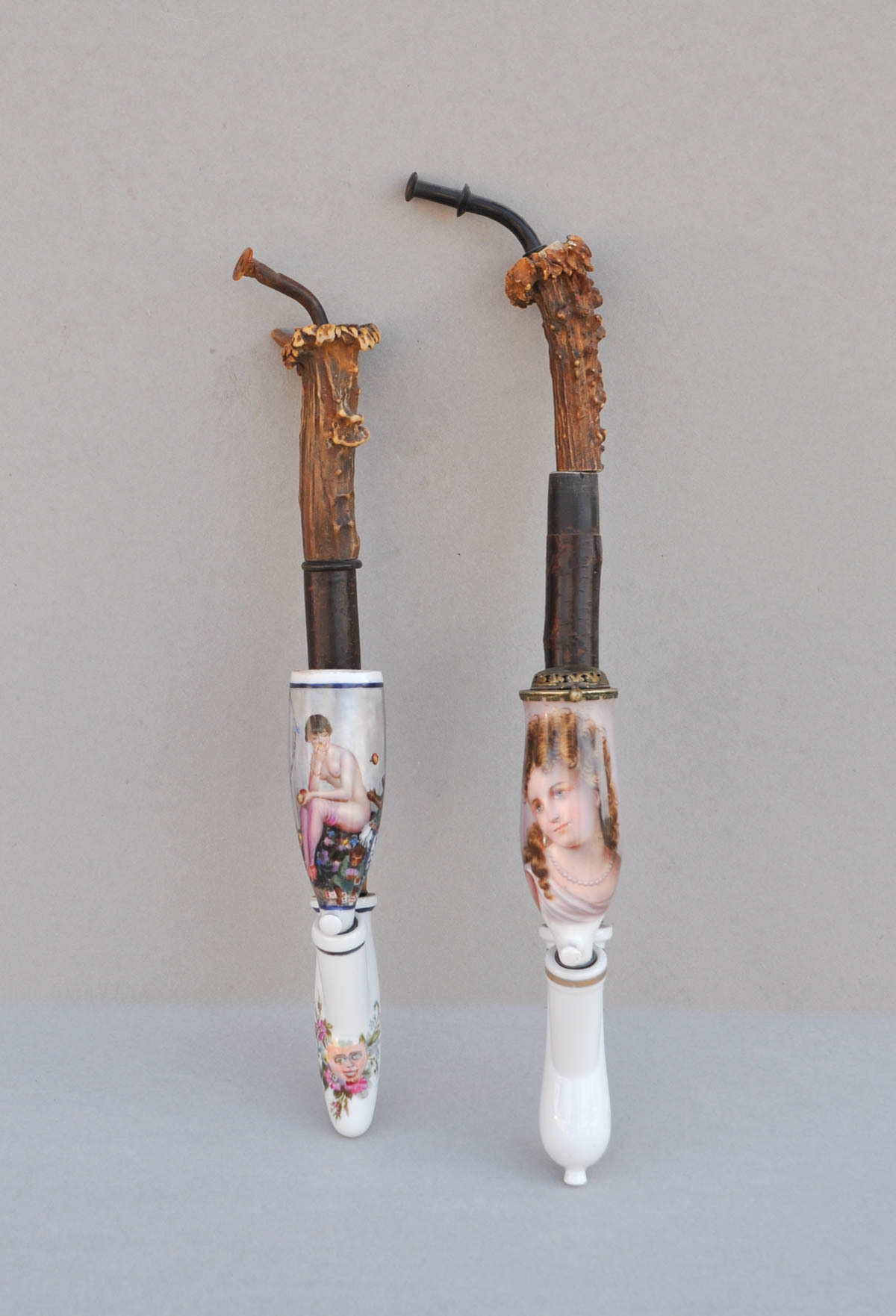 Anonym/Anonimo 2 pipe da riservista "weiblicher Akt" e "Mädchen", 1900 ca.;Ciascuna composta dalla pipa con bocchino, dalla ciotola decorata