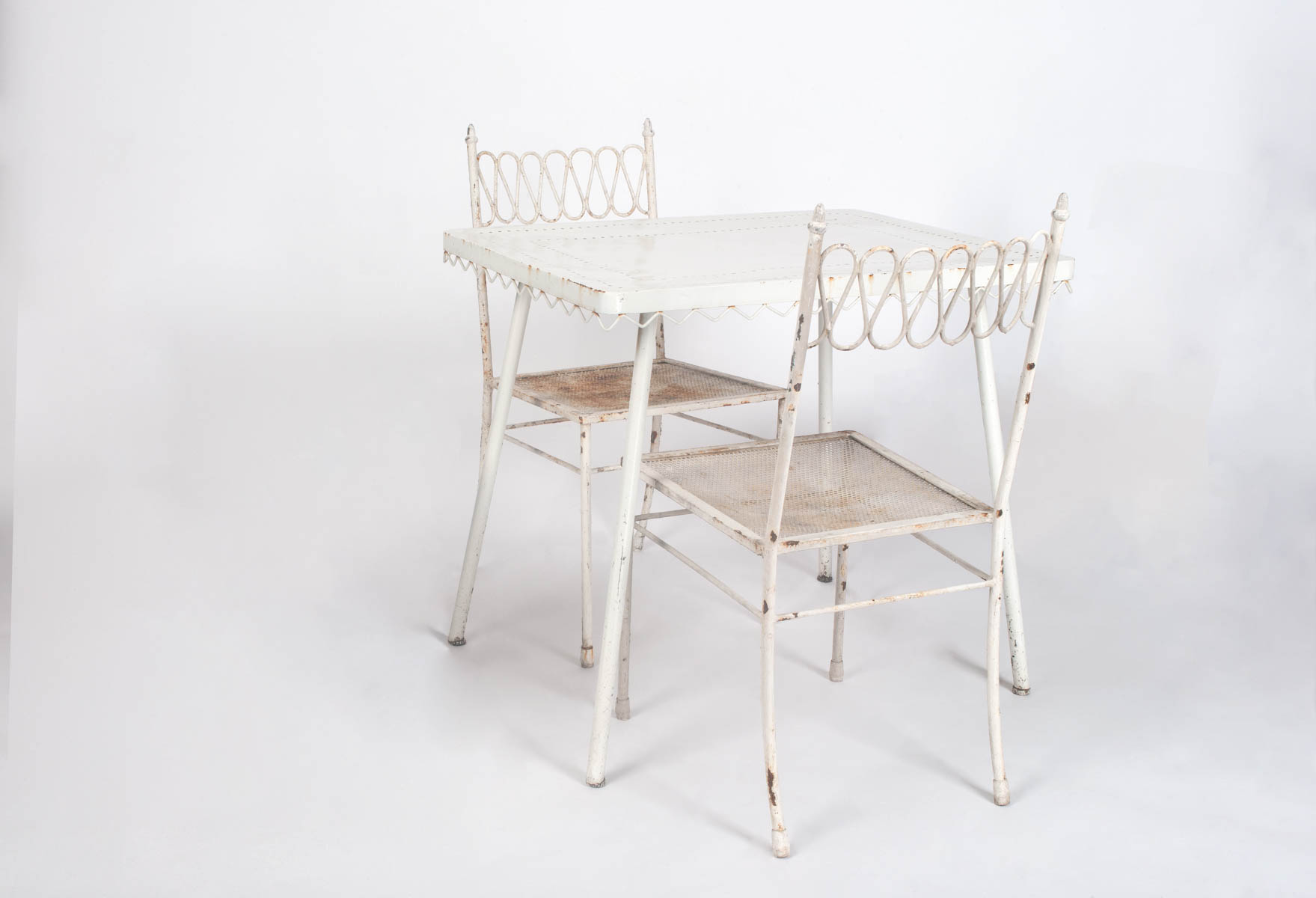 Italienische Manufaktur/Manifattura italiana Tavolo con 2 sedie Hotel Bristol Merano, 1953/1954;Ferro laccato color bianco, tavolo H. 80 x 60 cm, segni del tempo, da riverniciare; Provenienza: