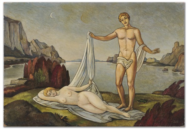 Alberto Martini "Adone sveglia la bellezza" 1942 olio su tavola cm 38x56 Firmato