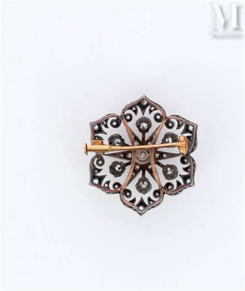 Spilla in oro giallo 18 carati (750 millesimi) e argento (800 millesimi) raffigurante una rosetta traforata centrata con una stella, il tutto incastonato di diamanti taglio vecchio e taglio rosa.