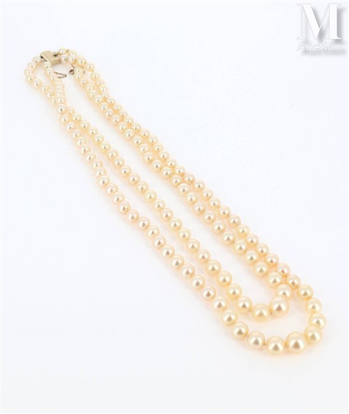 Collier formé de deux rangs de perles de culture disposées en chute. Fermoir boîte en or blanc 18k (750 millièmes) à décor d'un semis.