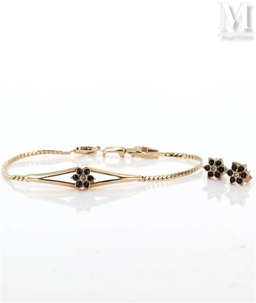 Demi parure en plaqué or comprenant un bracelet et une paire de clous d'oreille, chaque élément réhaussé de fleurettes serties de petits saphirs ronds.