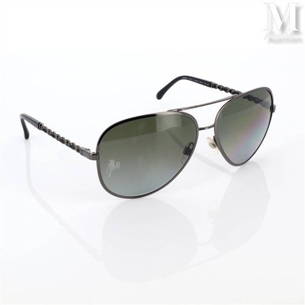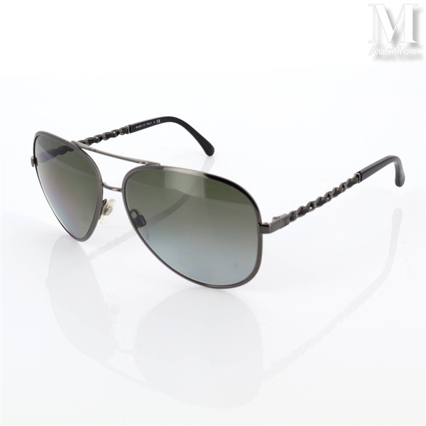 Paire de lunettes de soleil, branche en métal et cuir caractéristique du modèle de chaîne de la marque.