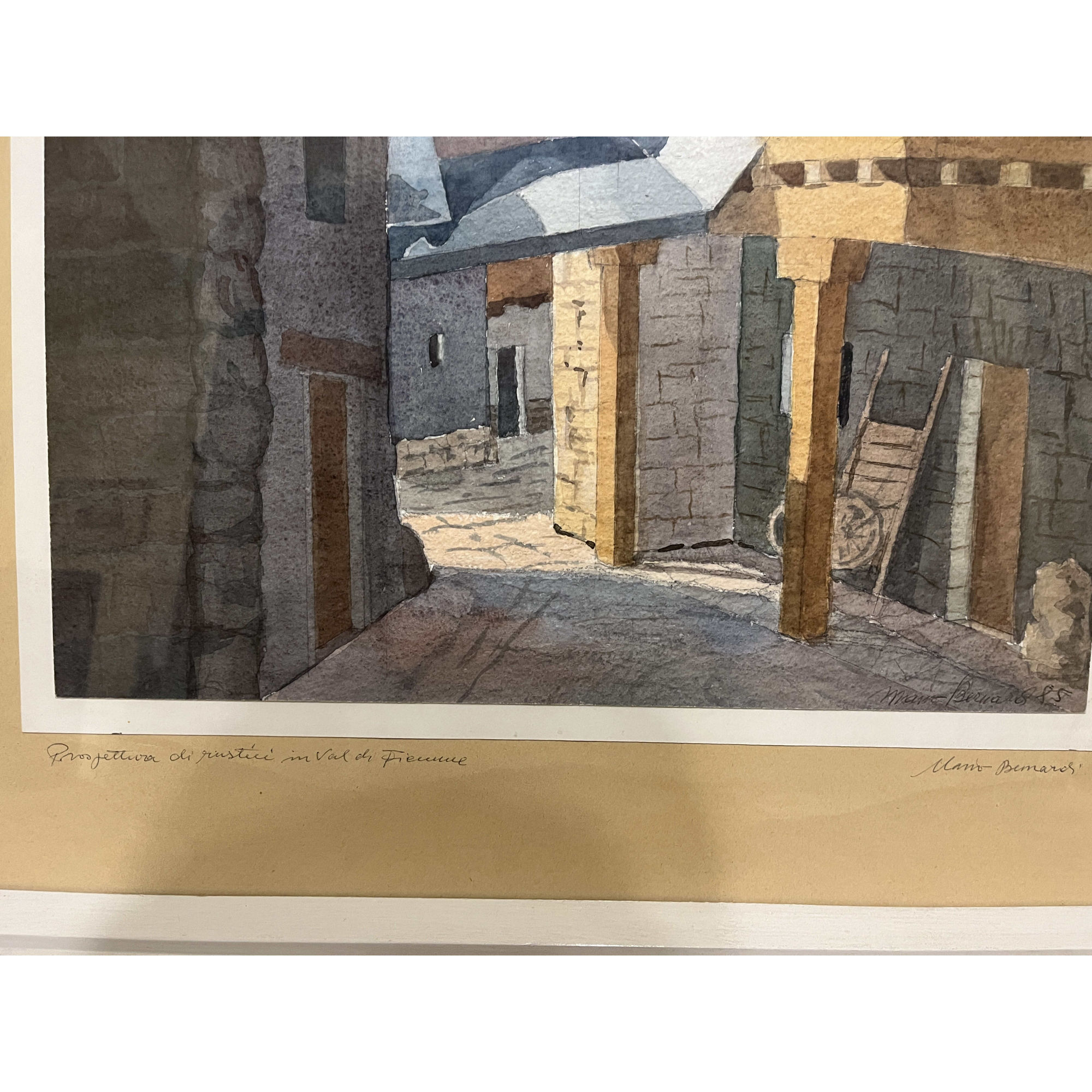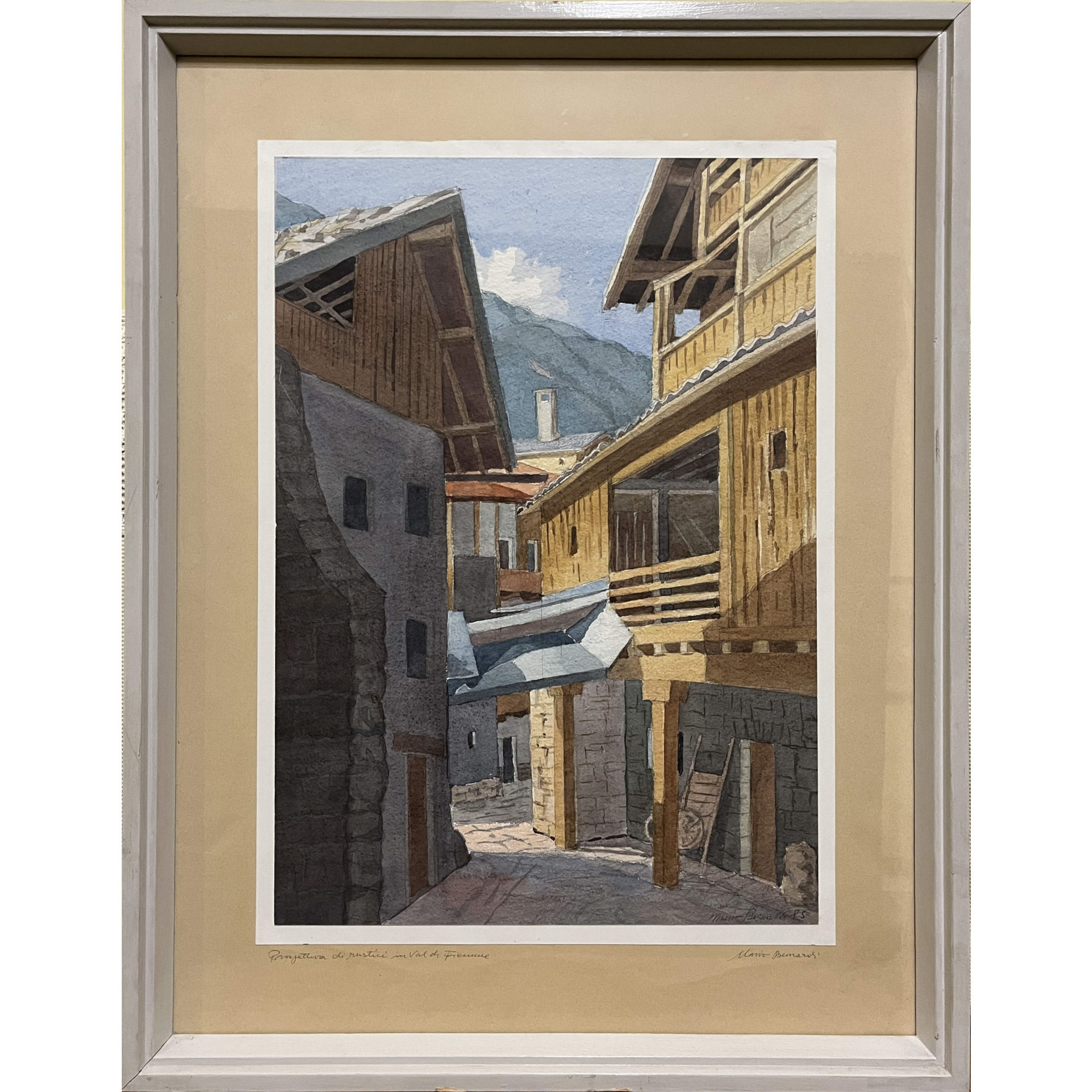 Mario Bernardi (1985), Prospettiva di rustici in val di Fiemme, acquerello su carta, cm 51x36. In cornice. Firmato in basso a dx.