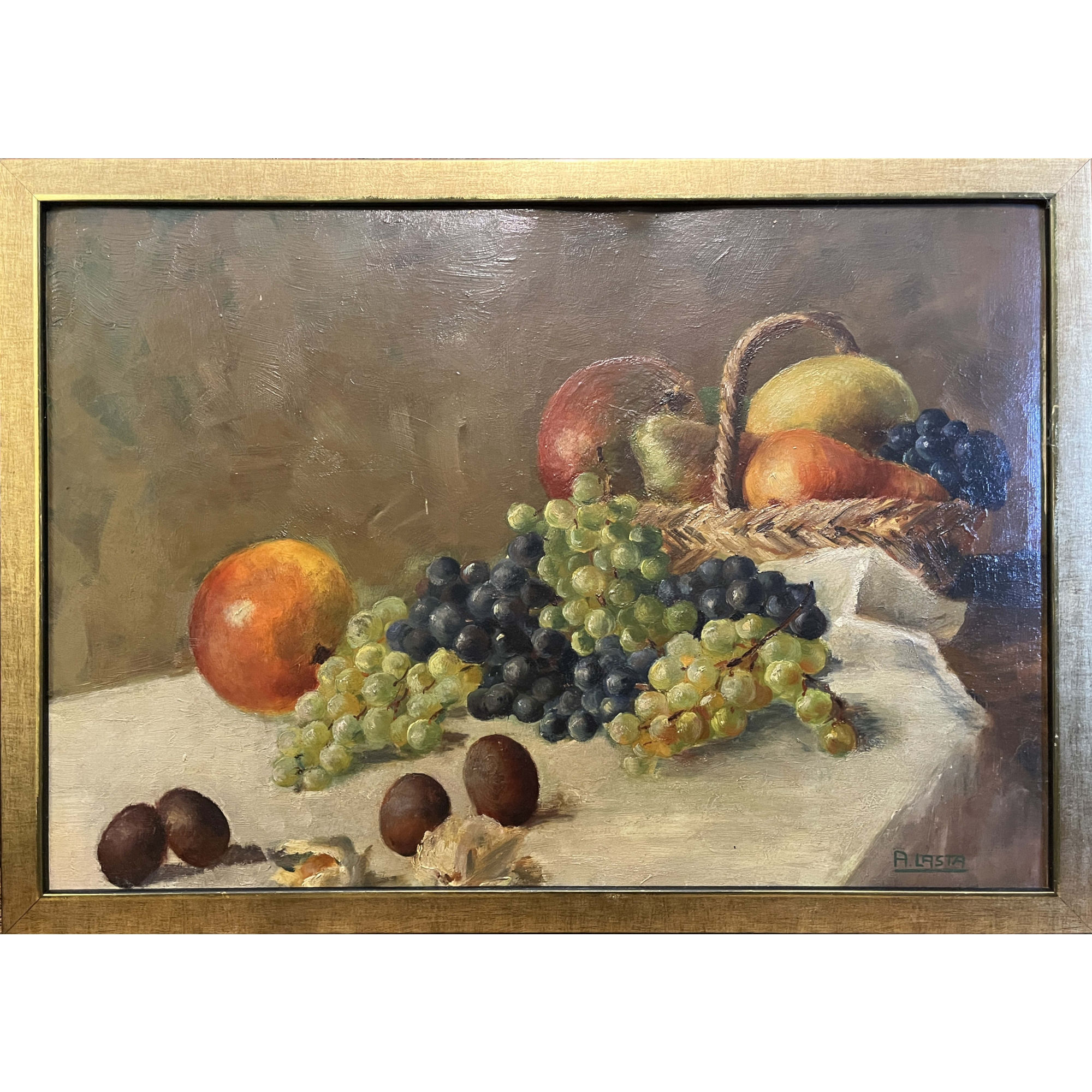 Attilio Lasta (anni '40), Natura morta con frutta, olio su cartone, cm 38x56, in cornice. Opera esposta nel 2018 in occasione della mostra "Il tempo delle Mele" - Cles(TN.