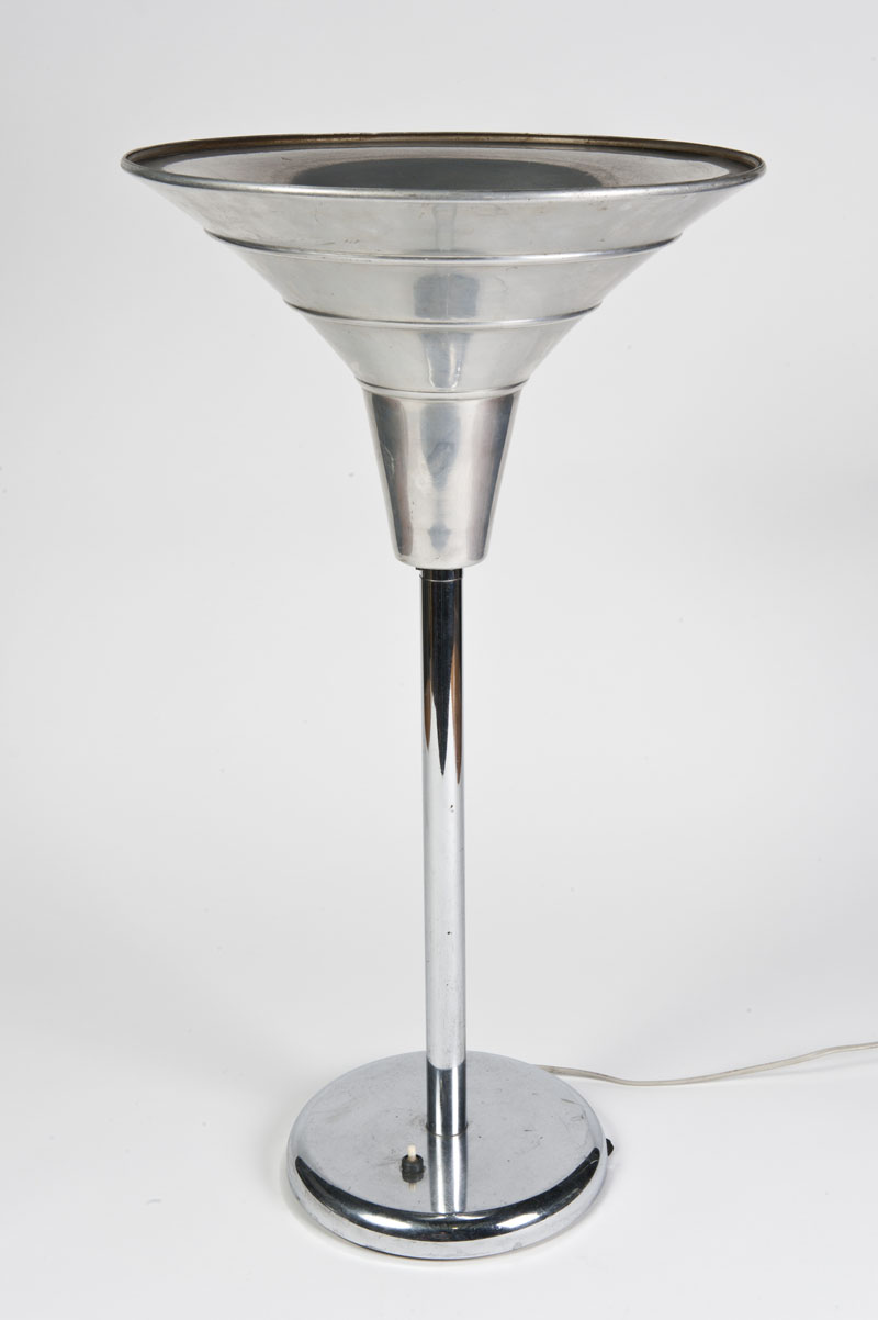 Luminator da scrivania in metallo cromato con paralume in anticorodal, produzione italiana anni ’30 del sec. XX (h cm 75) (lievi difetti)