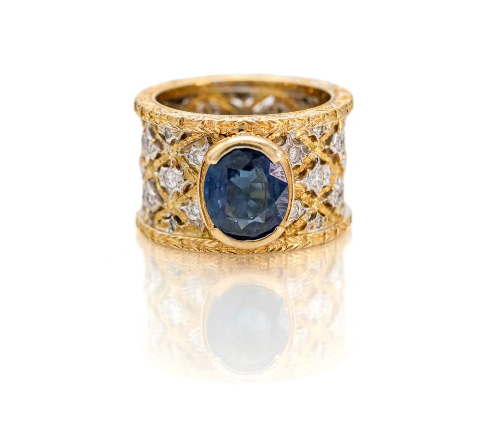 Mario Buccellati, anello veretta in oro, brillanti e zaffiro centrale Misura 12 Oro giallo e bianco 750/000. Zaffiro in taglio ovale ct. 3 ca. Peso complessivo gr. 12,60.