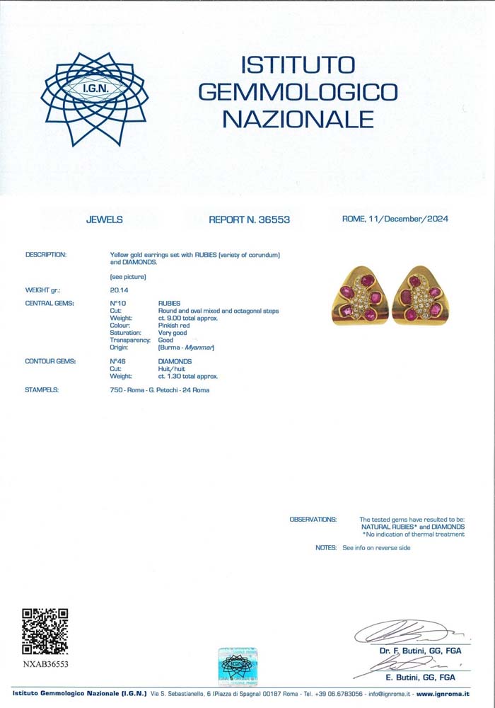 Petochi coppia di orecchini in oro giallo, brillanti e rubini cm 2,5 x 2 Oro giallo 750/000. Rubini in taglio rotondo e ovale ct. 9, BURMA - MYANMAR, SENZA INDICAZIONE DI TRATTAMENTO TERMICO. Diamanti in taglio huit/huit ct. 1,30. Peso complessivo 20,10 gr. Corredati di certificazione gemmologica IGN n° 36553 del 11/12/2024.