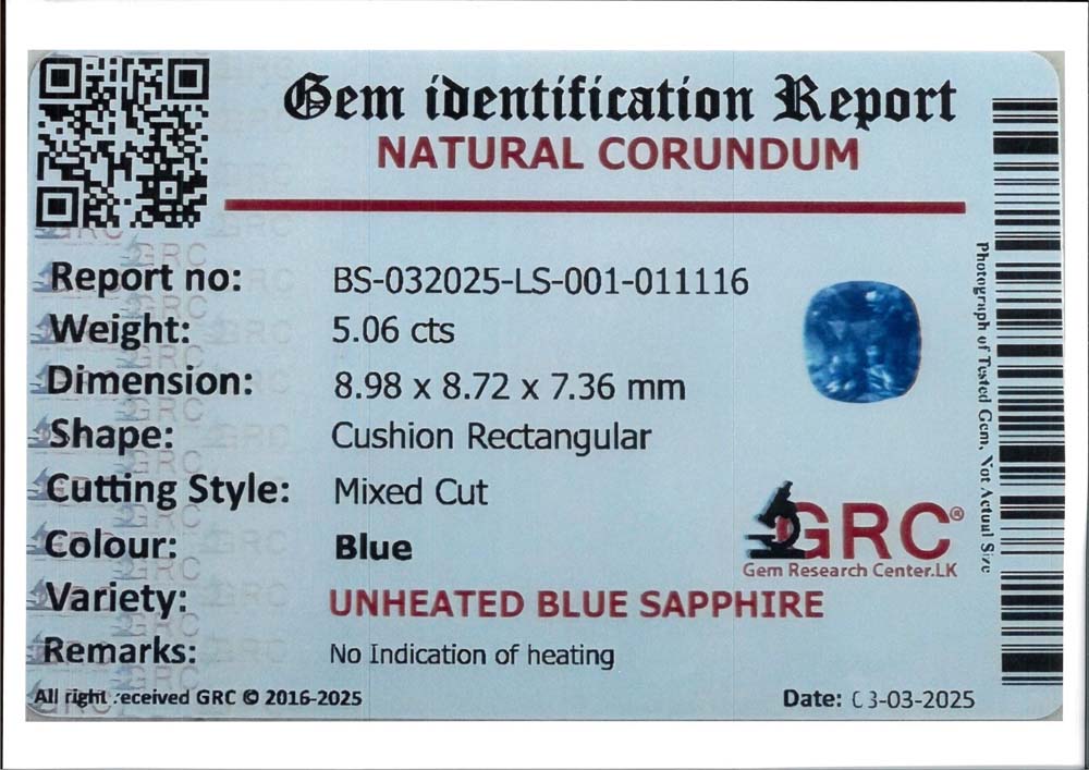 Zaffiro naturale ct. 5,06 in taglio cuscino Zaffiro in taglio cuscino ct. 5,06, SENZA INDICAZIONE DI TRATTAMENTO TERMICO. Corredato di certificazione gemmologica Gem Identification Report.