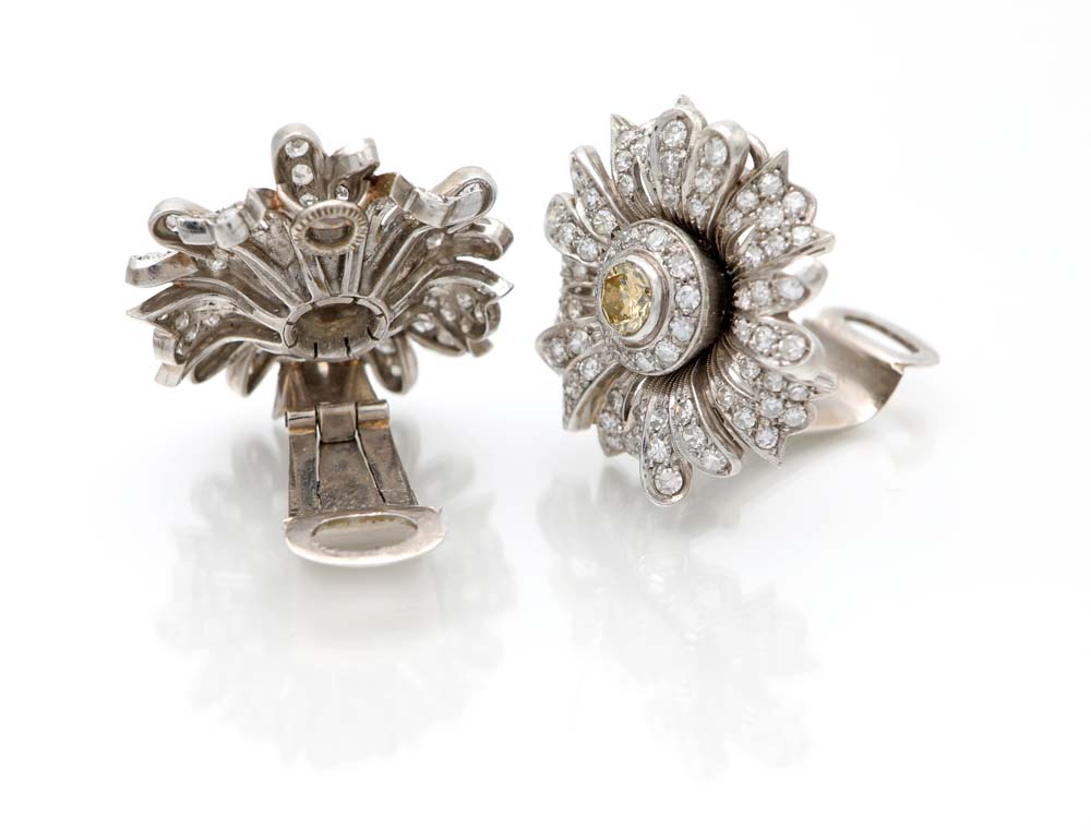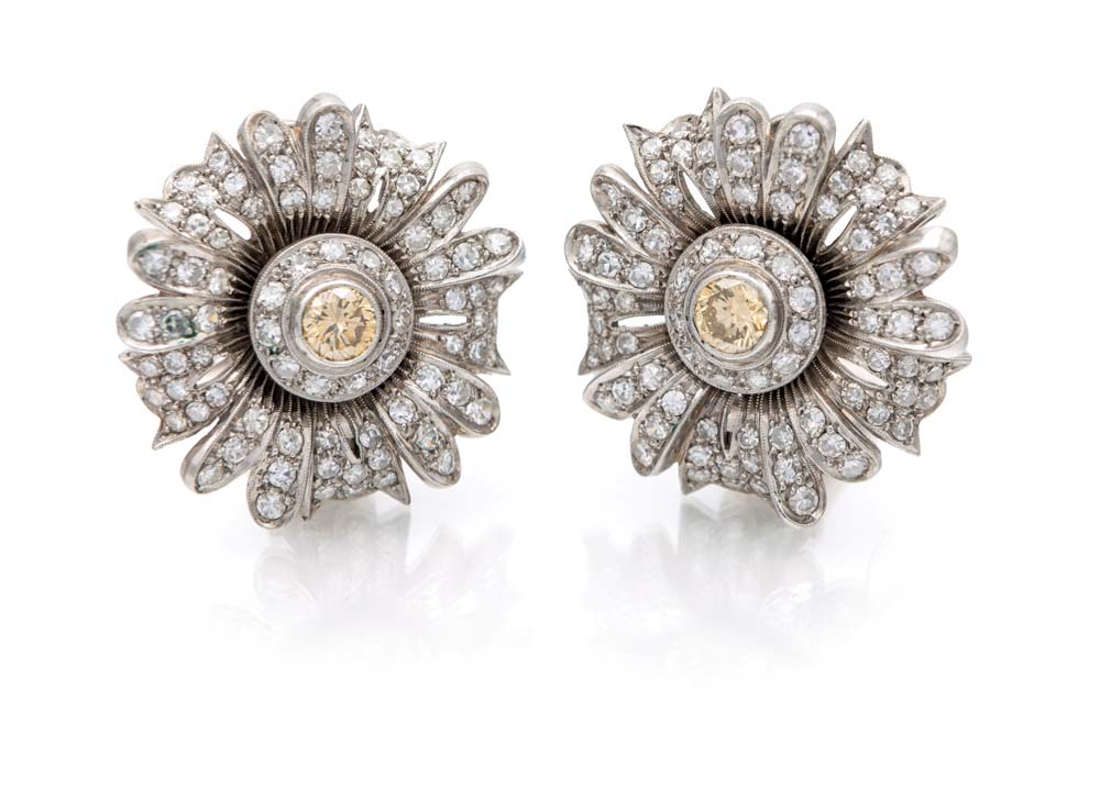 Oro bianco 750/1000 diamanti in taglio rotondo brillante carati 4, diamante solitario centrale fancy color naturale carati 0,80.