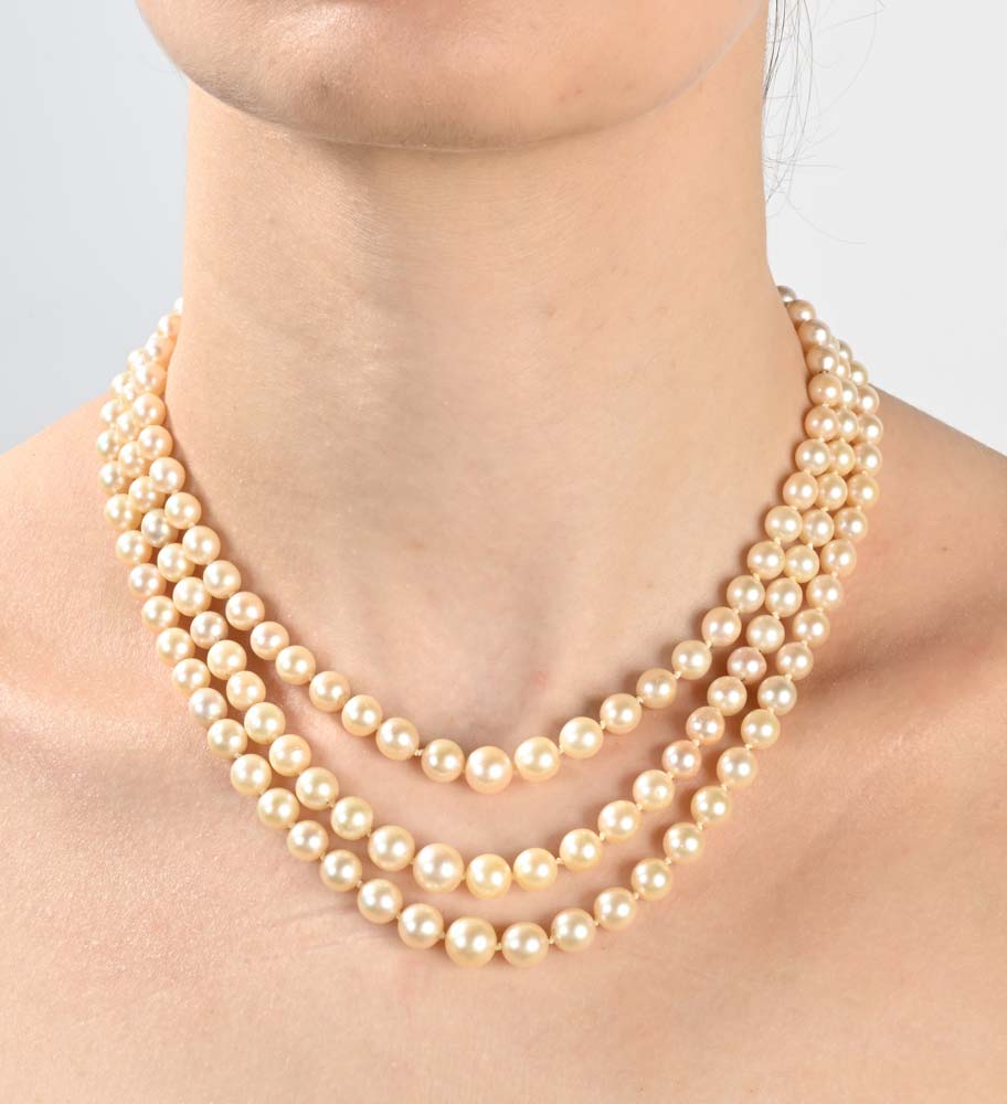 Collana di perle a tre fili con chiusura in oro, diamanti e pietra rossa cm. 41 Oro bianco 750/000. Perle da mm. 5 a mm. 9.