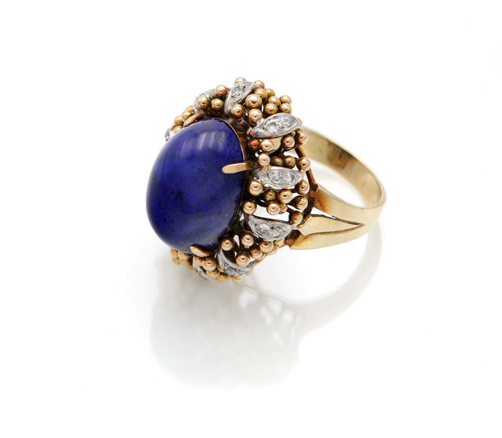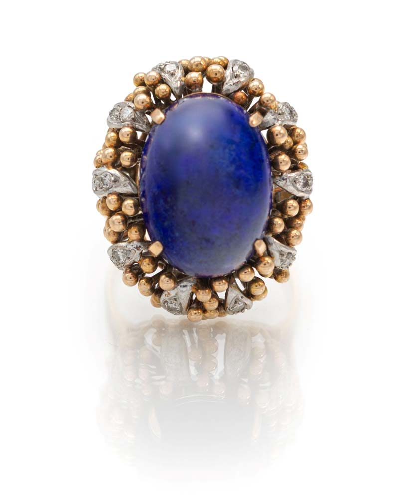 Anello a cupola in oro, lapislazzuli e brillanti Misura 19 Oro giallo 585/000. Peso complessivo gr. 13,60