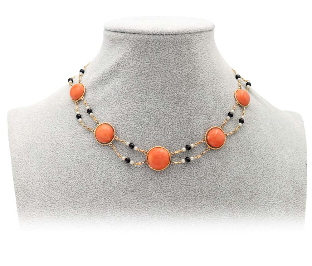 Collana in oro, perle, onice e corallo Lunghezza cm 38 Oro giallo 750/000. Peso complessivo gr. 20,50.