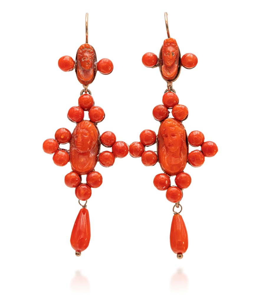 Coppia di orecchini in oro, argento, corallo Lunghezza cm 7 Oro a basso...