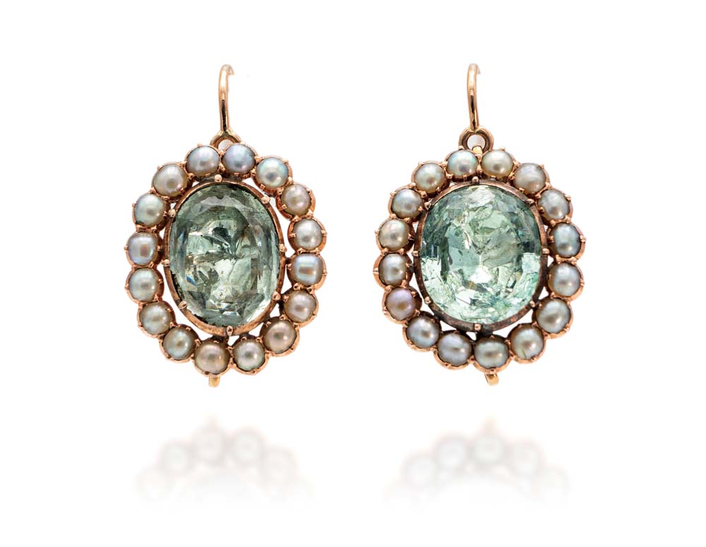 Coppia di orecchini pendenti in oro, acquamarine e microperle mm 22 x 20 Oro giallo 750/000. Peso complessivo gr. 7,80