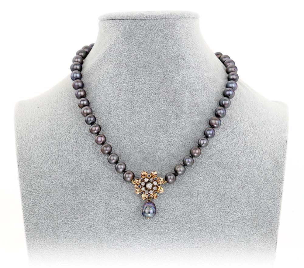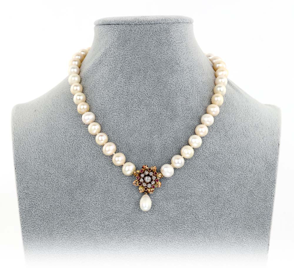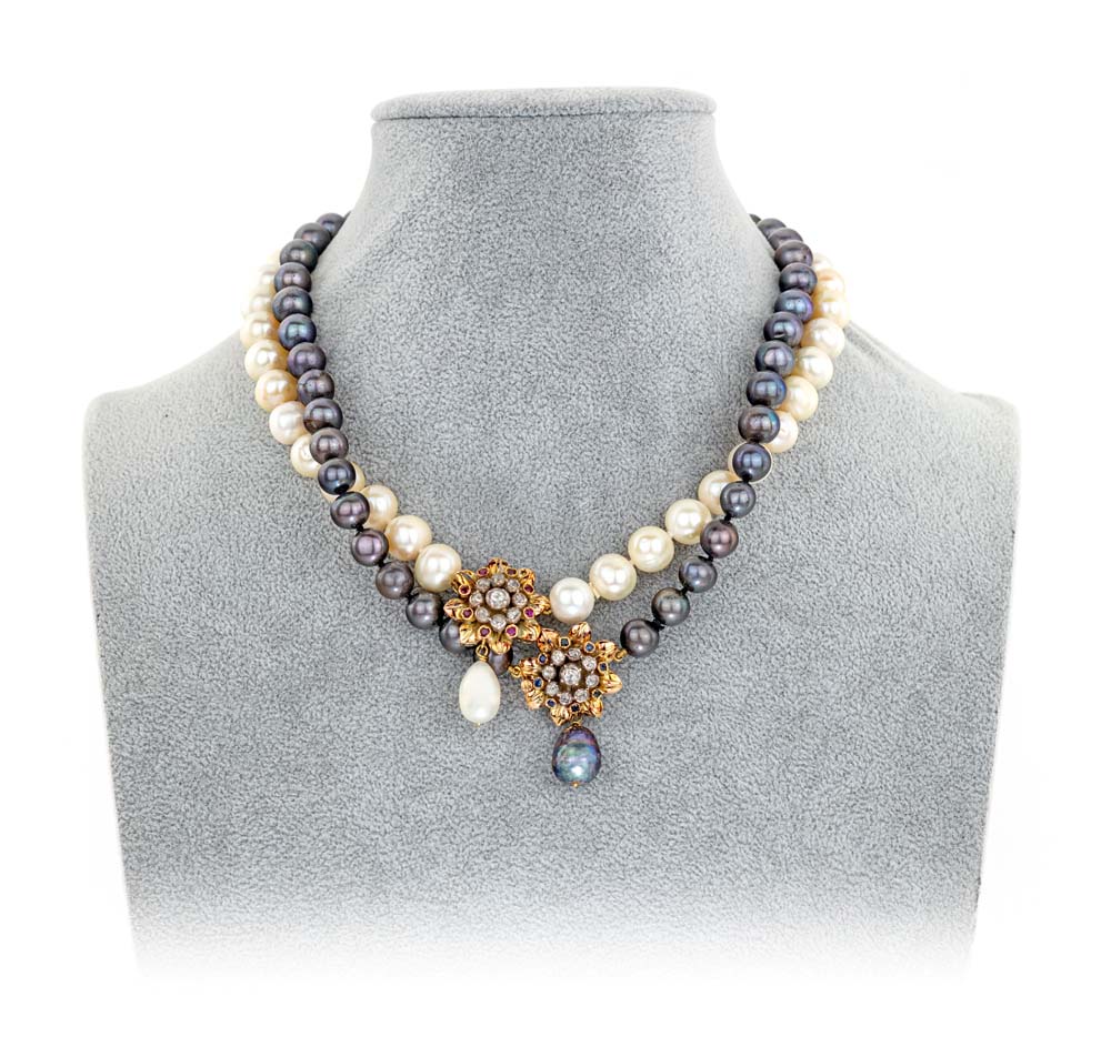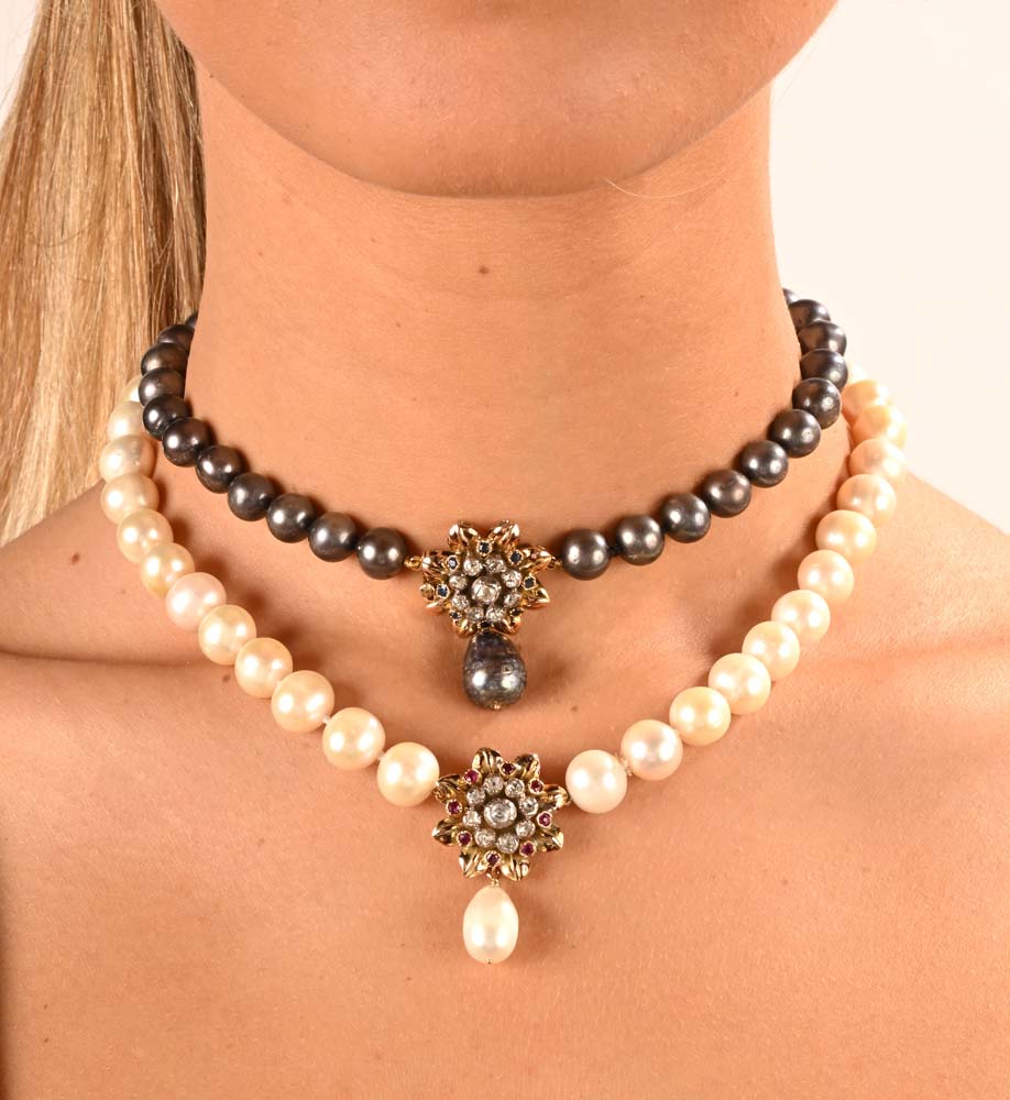 Coppia di collane in perle coltivate d'acqua dolce bianche e nere con chiusure in oro, diamanti, rubini e zaffiri Lunghezza cm 44 e 45,5.