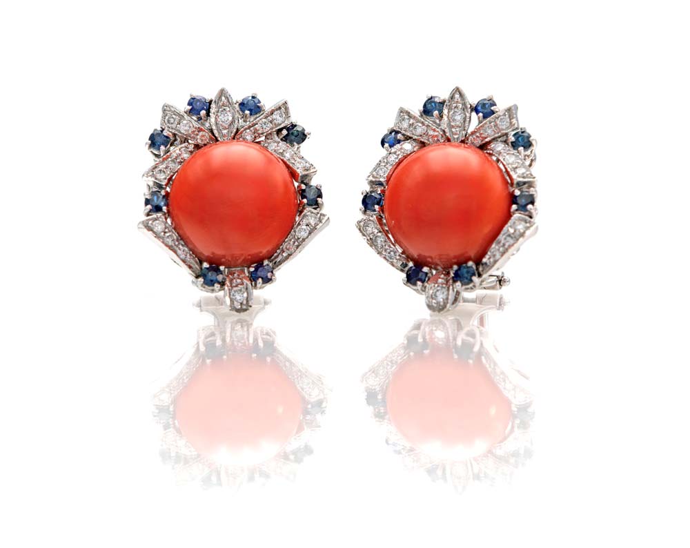 Coppia di orecchini in oro, corallo, diamanti e zaffiri Diametro cm 2 Oro bianco 750/000. Diamanti in taglio rotondo e zaffiri. Peso complessivo gr. 15,80.