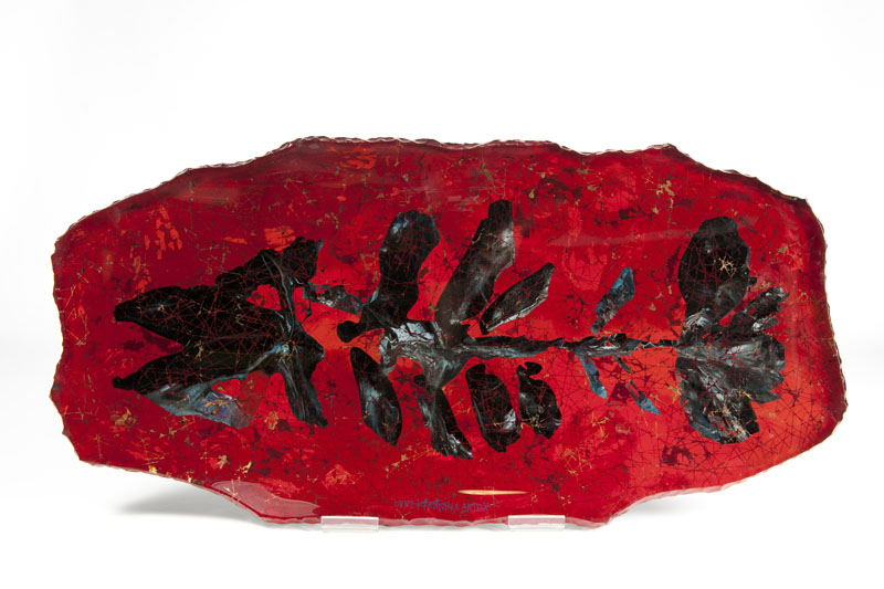 Duilio Barnabé (1914 - 1961) - Grande centrotavola in vetro curvato e scalpellato lungo i bordi, recante decorazione policroma astratta, retro-dipinta a smalto. Produzione Fontana Arte, Milano, 1955 ca. Firmato "Dubé * Fontana Arte*" (cm 71x35)