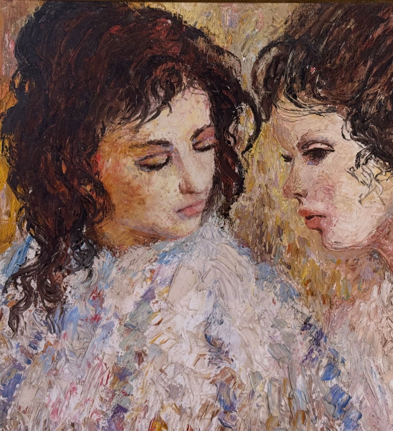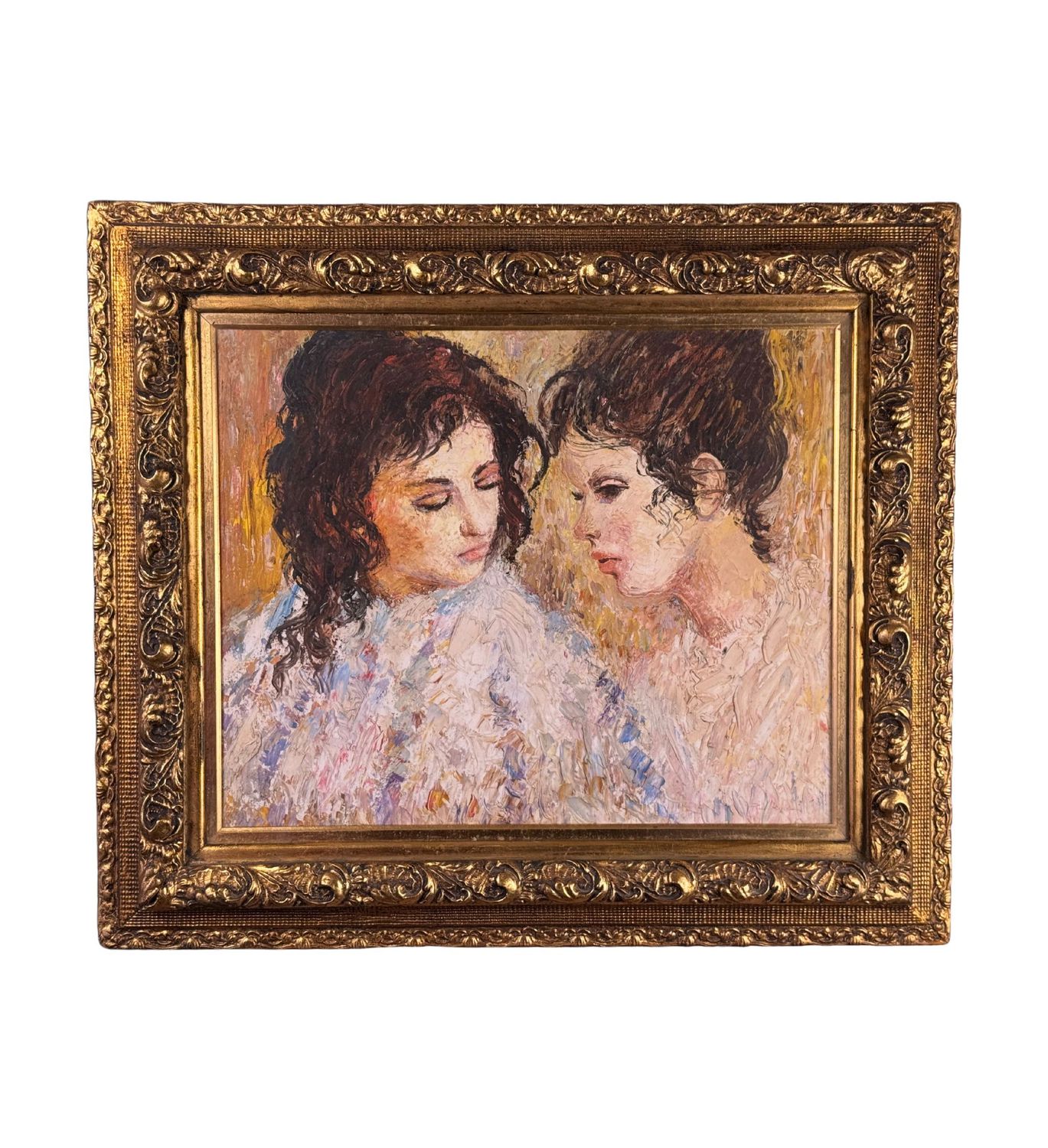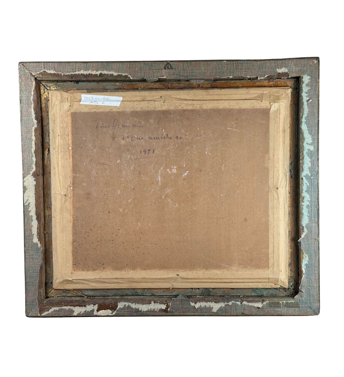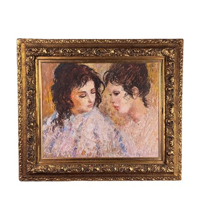 Dipinto olio su panello, periodo XX secolo, scuola Italiana, raffigurante Due amiche. Dimensioni compreso cornice: 75x65 cm. Dimensioni interno cornice: 55x45 cm. Reca firma in basso a destra Pino Armenio. Opera in buone condizioni. Ricca di materia pittorica e di eccellente qualità artistica.