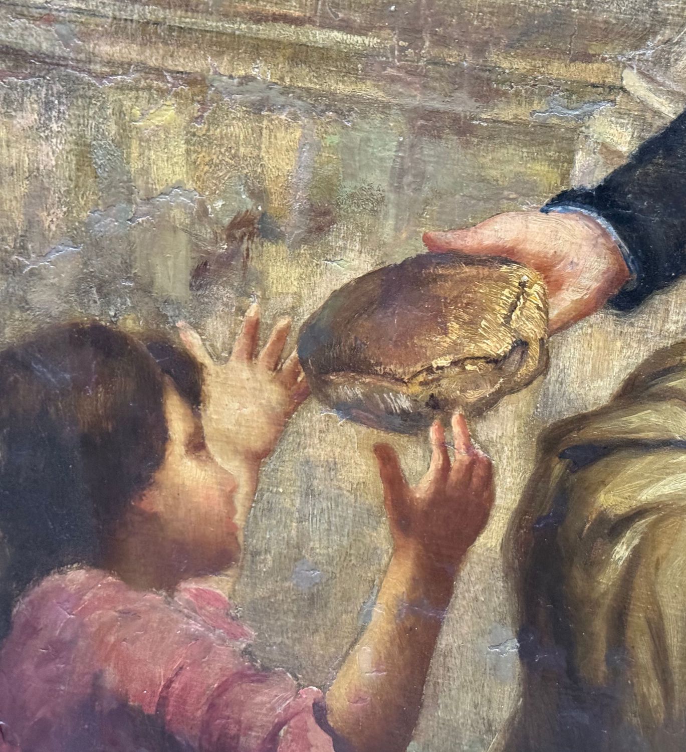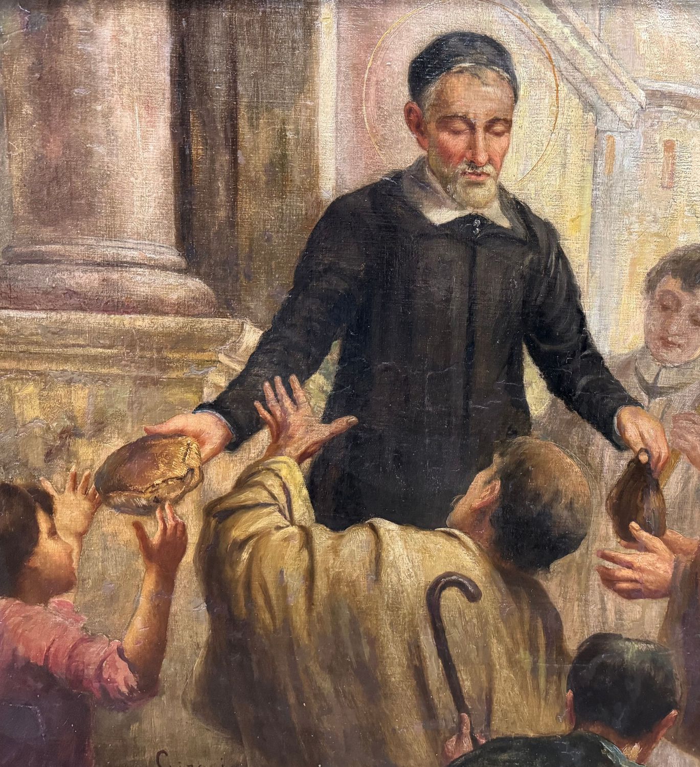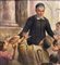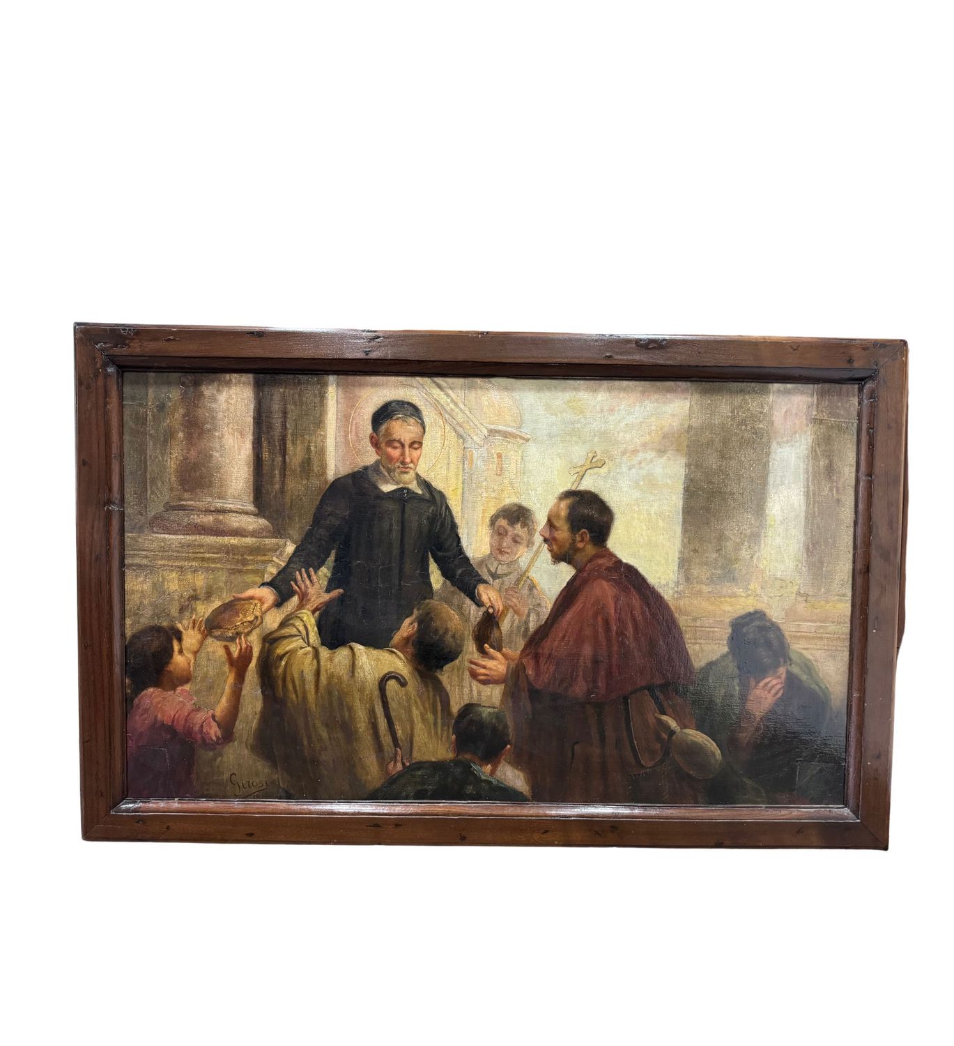 Dipinto olio su tela applicata su tavola, periodo inizio XX secolo scuola Italiana, raffigurante La predicazione di San Francesco di Sales, il santo dei poveri e degli afflitti. Dimensioni compreso cornice: 189x120 cm. Dimensioni interno cornice: 170x100 cm. Reca firma e data in basso a sinistra da Girosi 1919. Opera in discrete condizioni con sparsi punti di restauro.