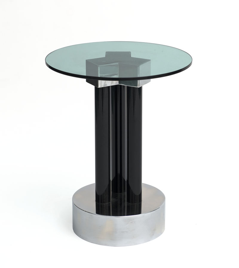 Ettore Sottsass (Innsbruck 1917 - Milano 2007) - Tavolino circolare con piano in cristallo, base in acciaio lucidato, sostegno composto da tre tubolari in metallo verniciato. Edizione limitata e numerata Clio Calvi e Rudy Volpi, 2001. Reca etichetta della galleria firmata a pennarello “Ettore Sottsass 2001” e numerata 7/10. (h cm 56, d cm 45)