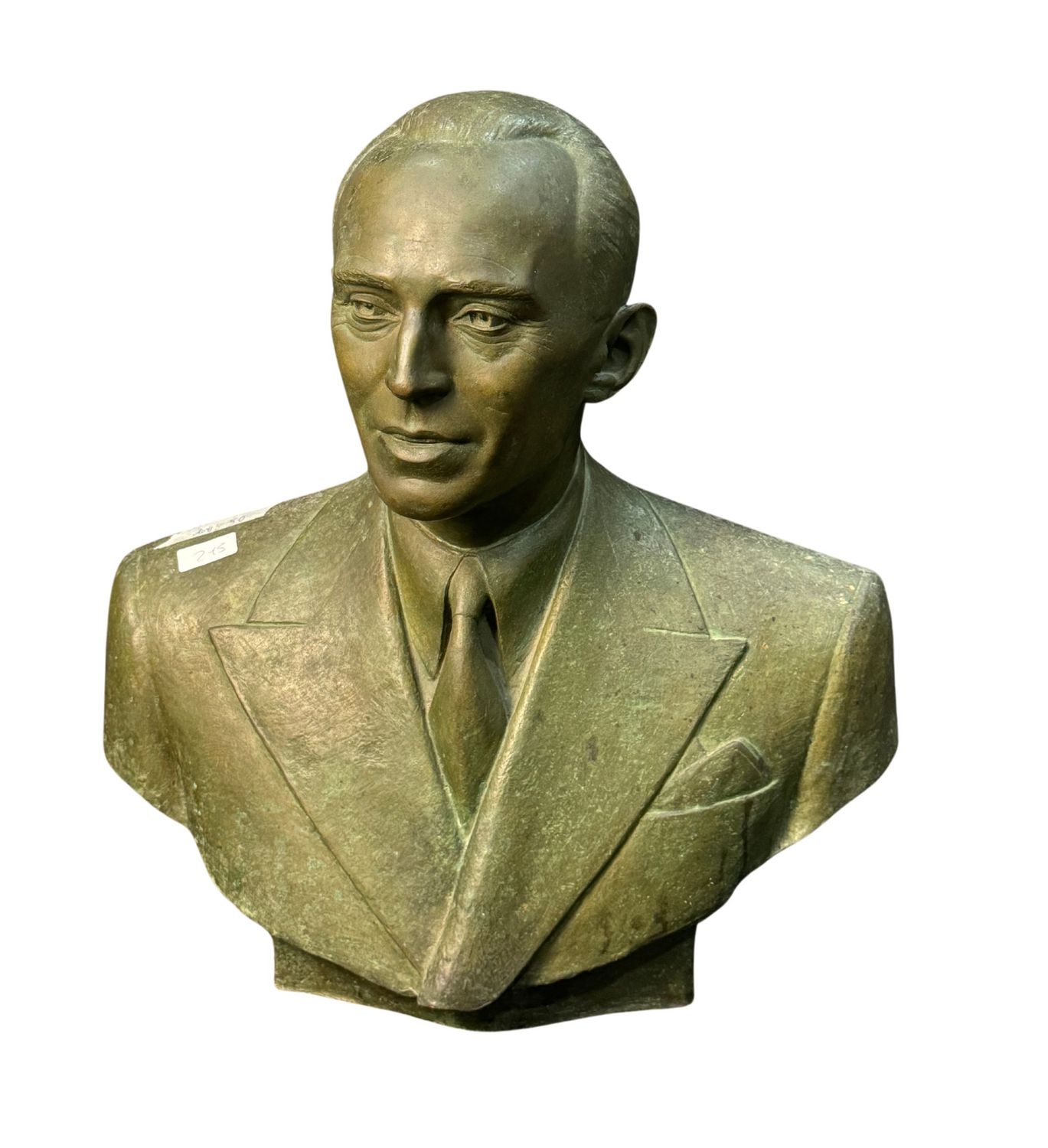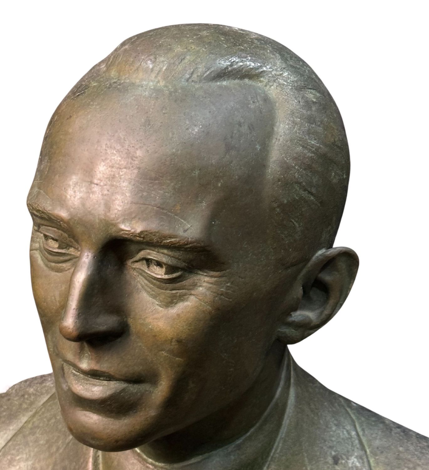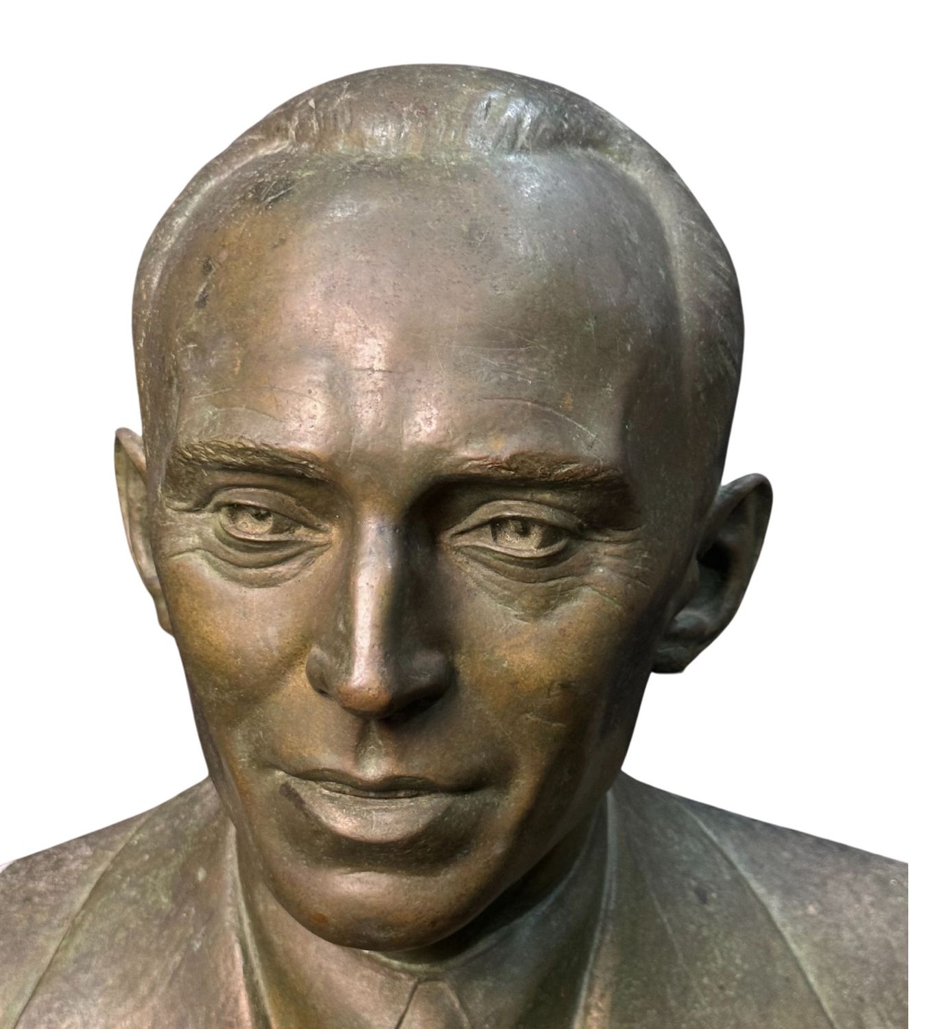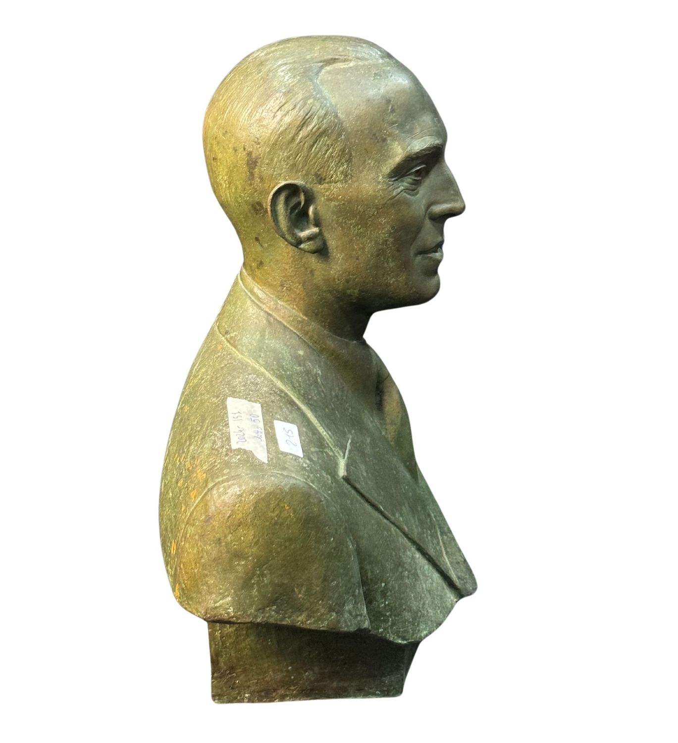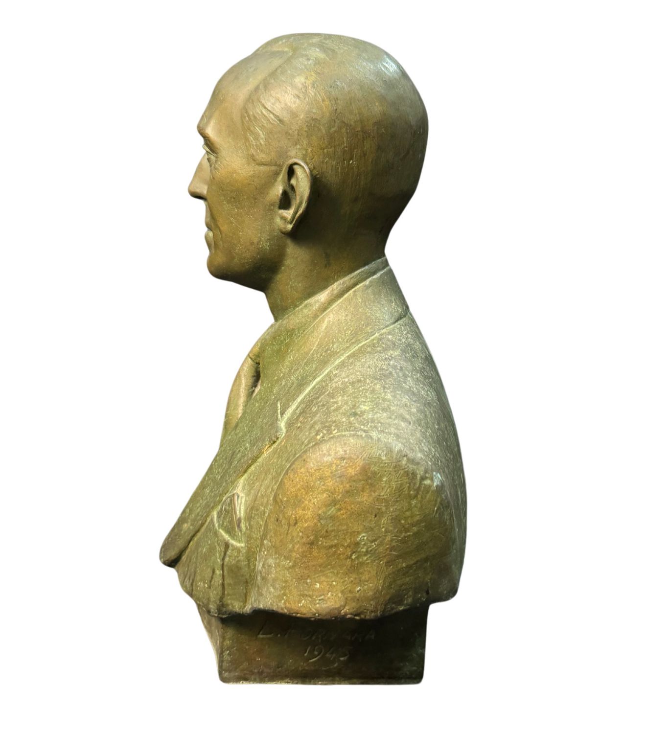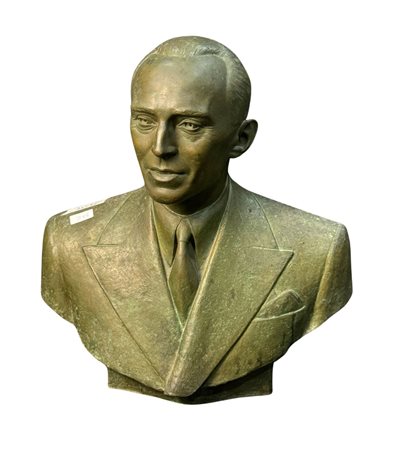 Scultura in bronzo, patinato a cera persa, periodo XX secolo, raffigurante busto di personaggio maschile. Reca firma L. Fornara 1945. Dimensioni: 52x52x27 cm. Opera in buone condizioni.