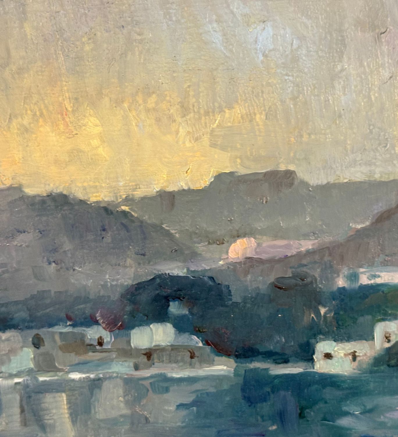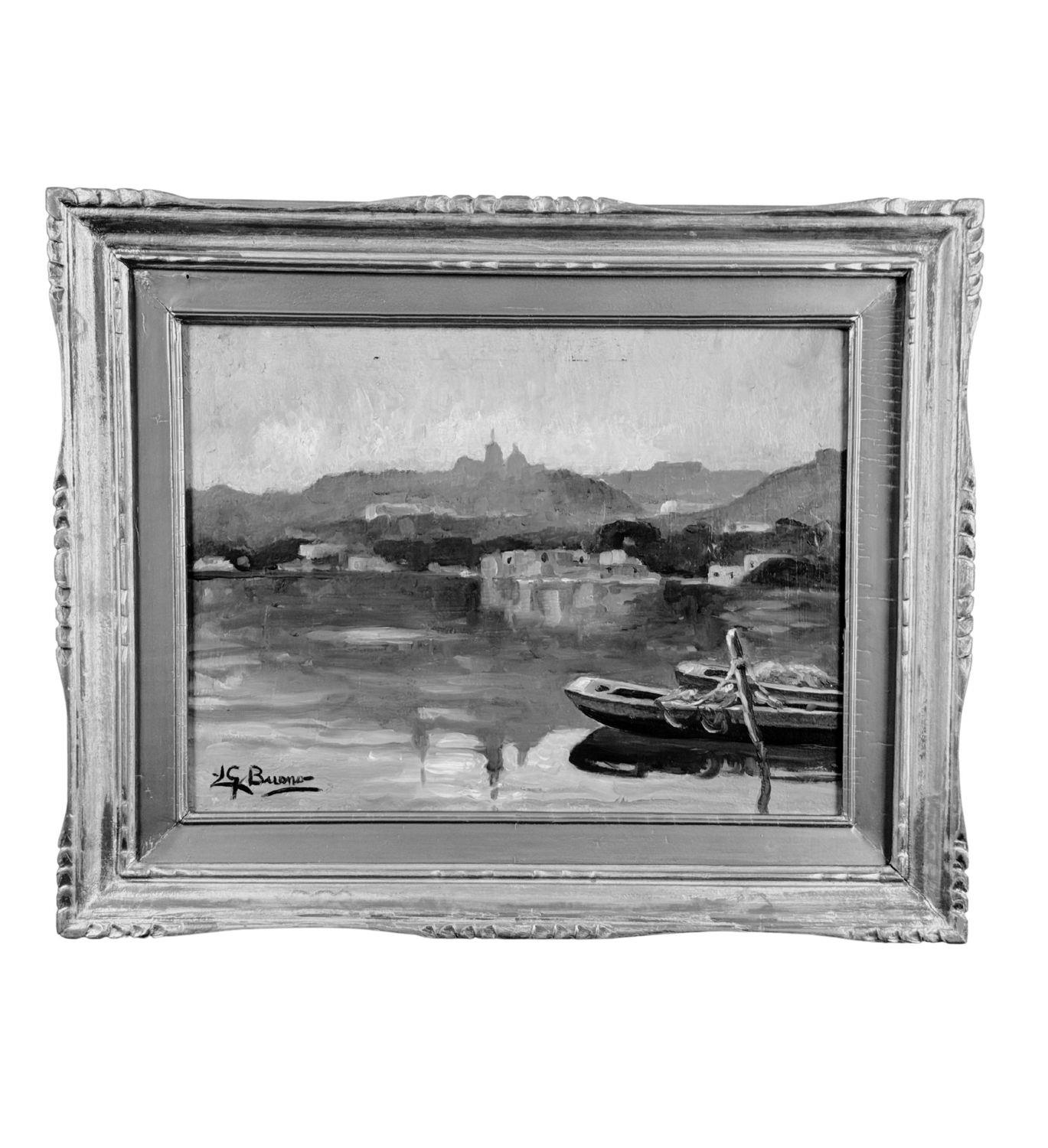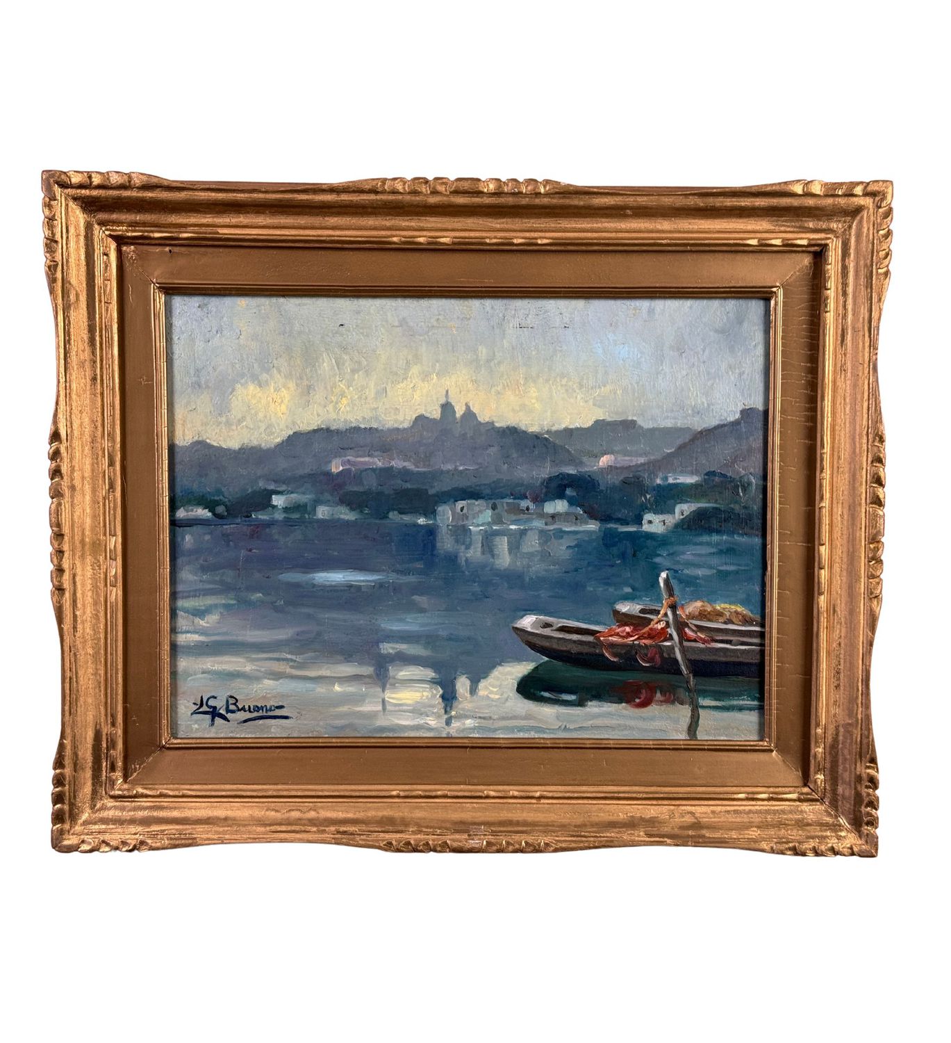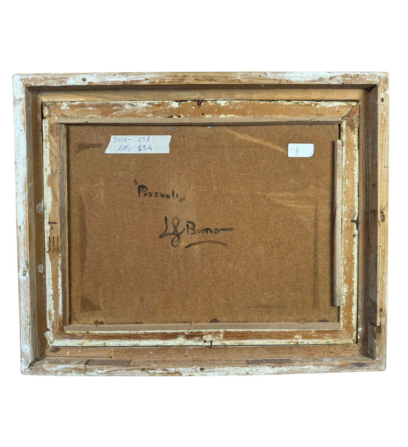 Dipinto olio su pannello, periodo XX secolo scuola Italiana, raffigurante Pozzuoli. Dimensioni compreso cornice: 53x43 cm. Dimensioni interno cornice: 30x40 cm. Reca firma in basso a sinistra da Leon Giuseppe Buono (1888 - 1976). Opera in buone condizioni.