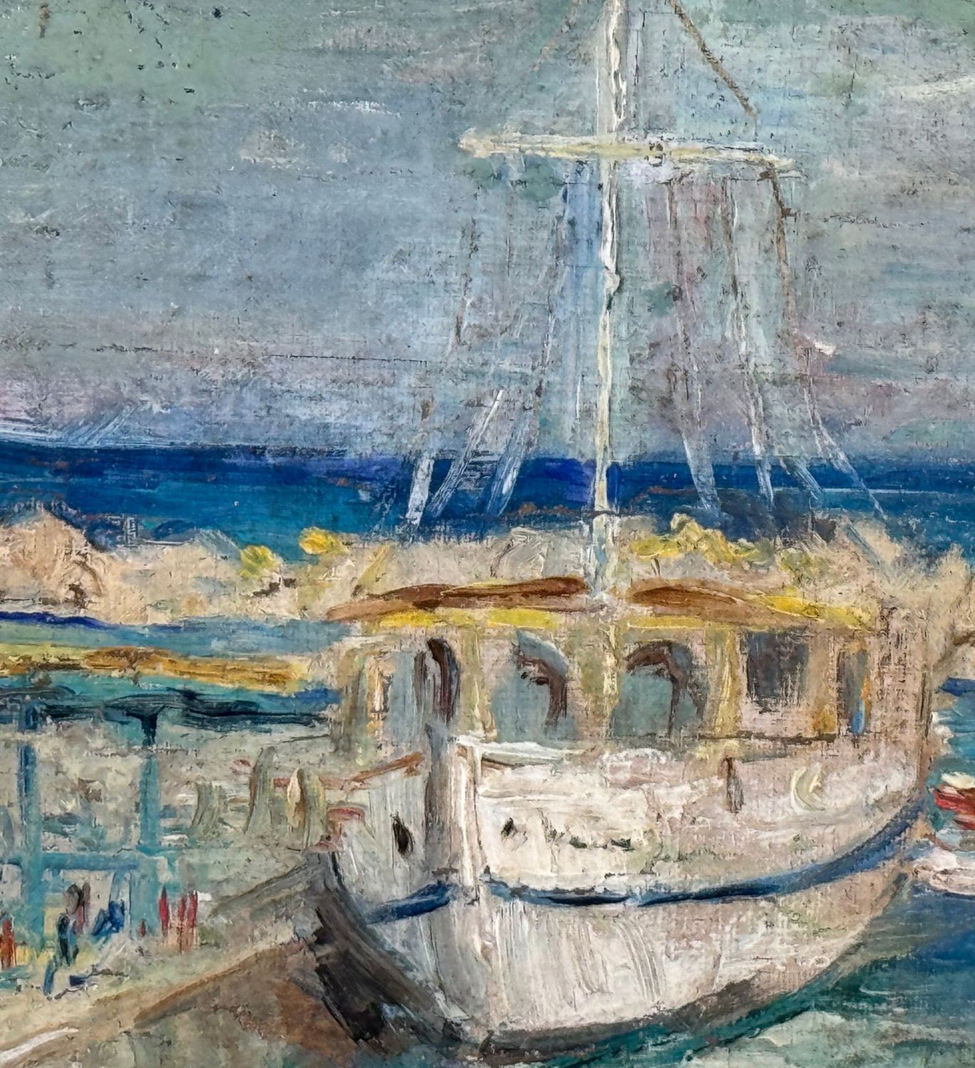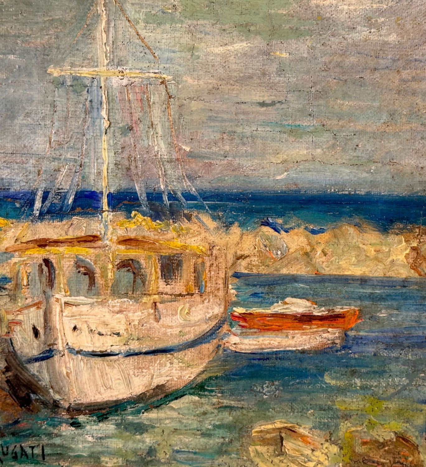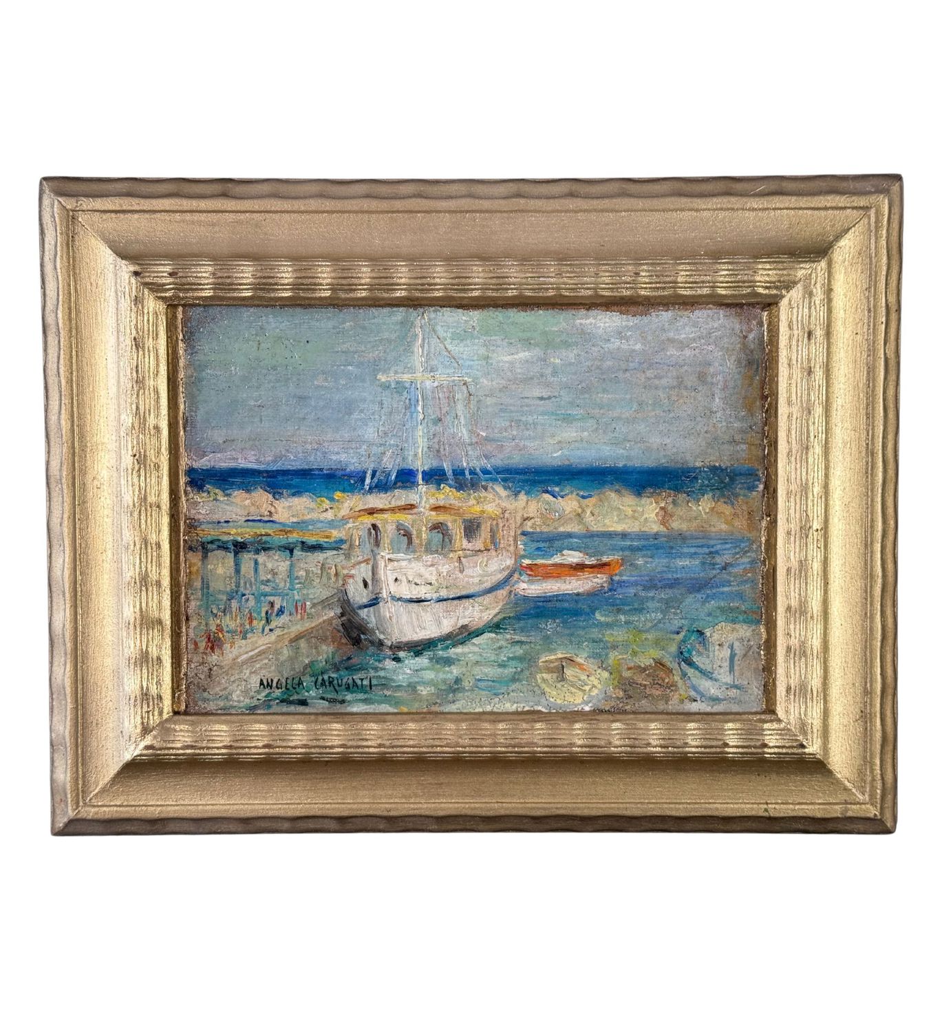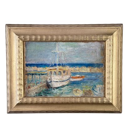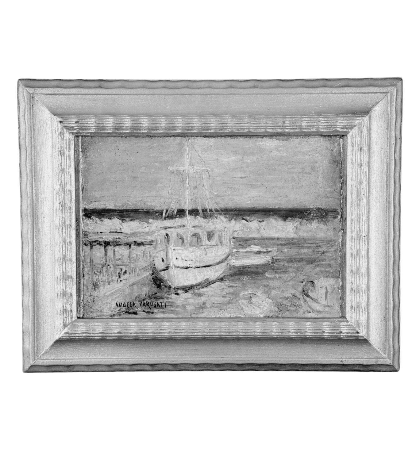 Dipinto olio su cartoncino, periodo XX secolo scuola Italiana, raffigurante Scena portuale con barche. Dimensioni compreso cornice: 41x32 cm. Dimensioni interno cornice: 27,5x20 cm. Reca firma in basso a sinistra da Angela Carugati. Opera in buone condizioni.