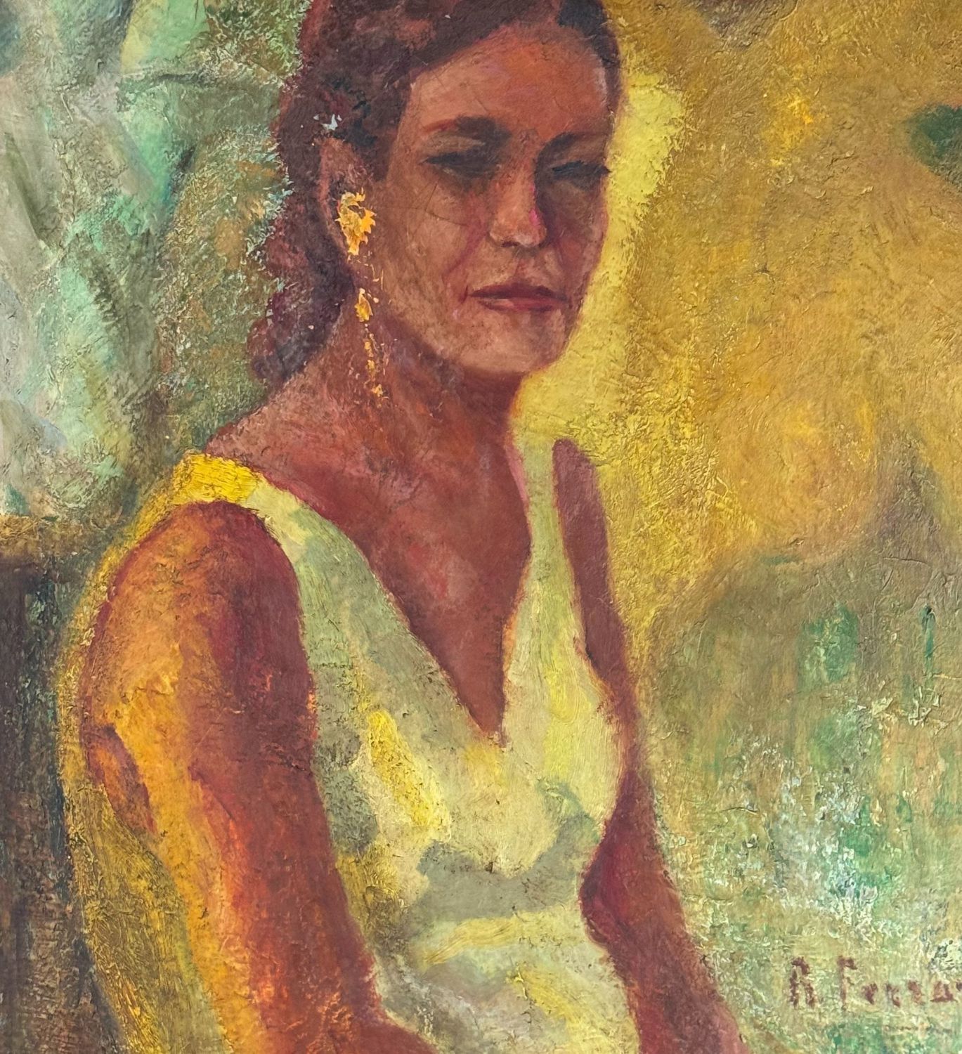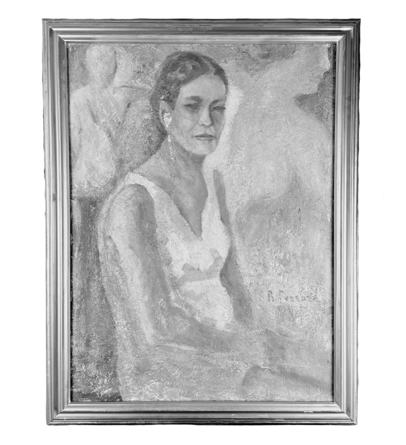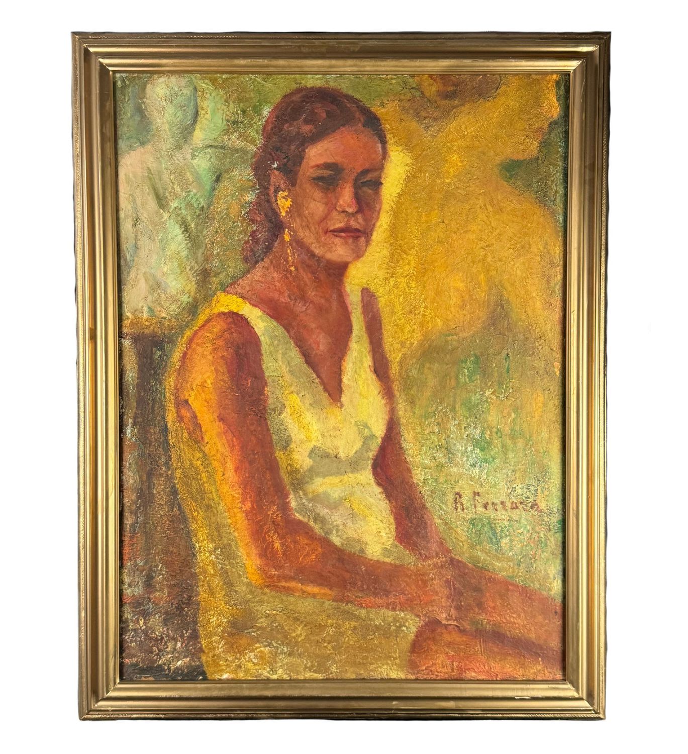 Dipinto olio su tela, periodo XX secolo, raffigurante Ritratto di donna. Dimensioni compreso cornice: 72x93 cm. Dimensioni interno cornice: 61x82 cm. Reca firma in basso a destra R. Ferrara. Opera in buone condizioni.