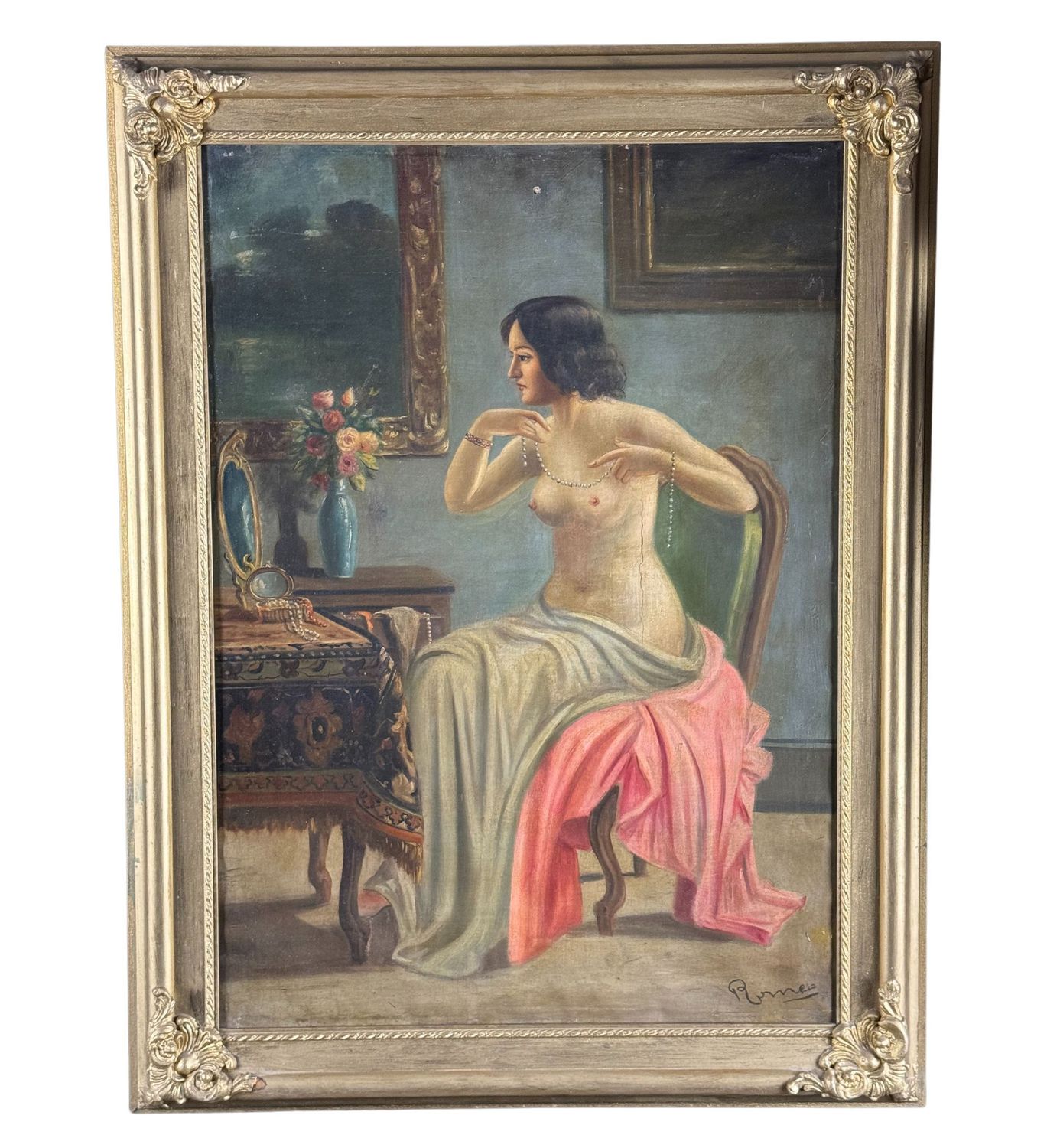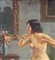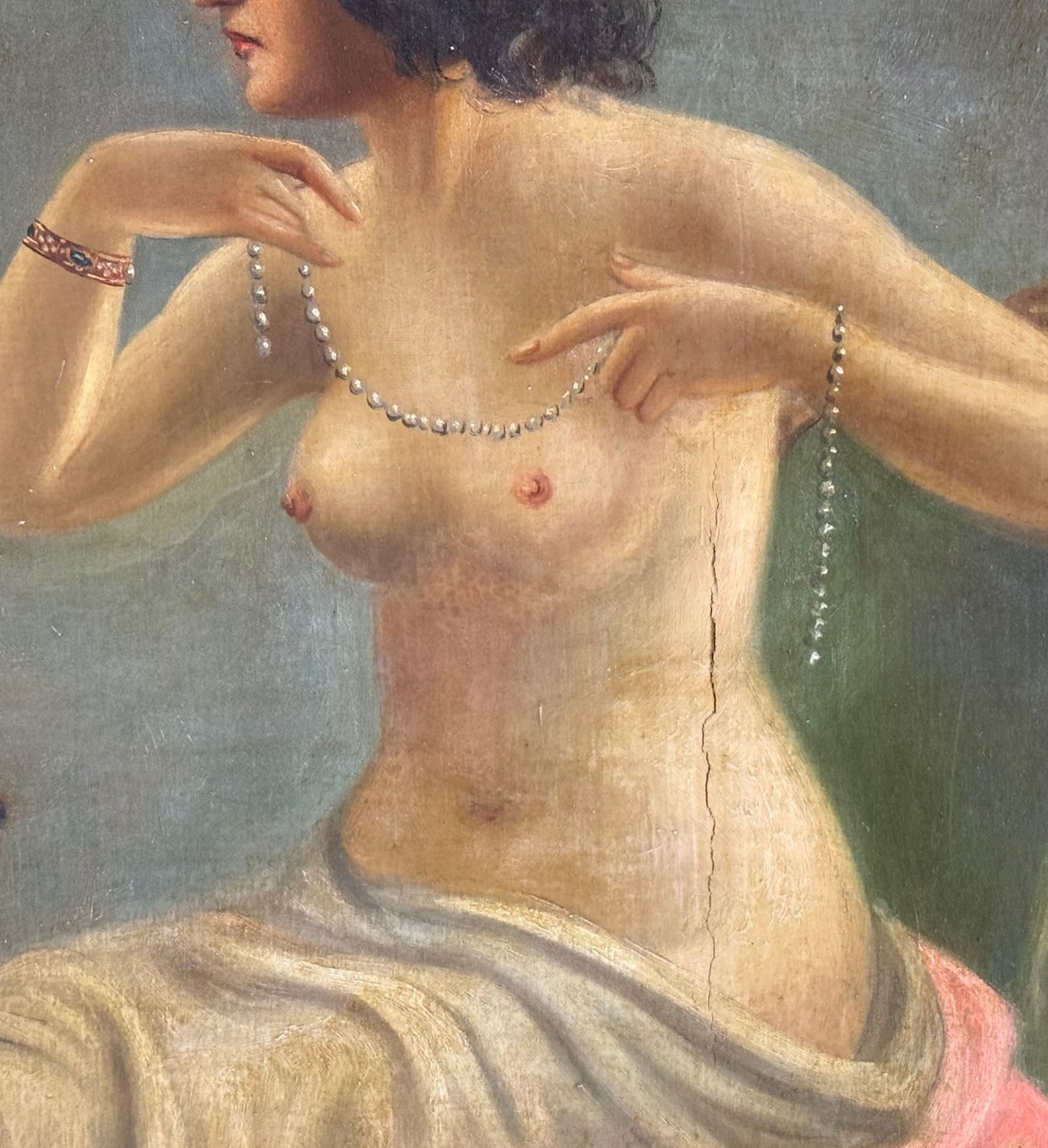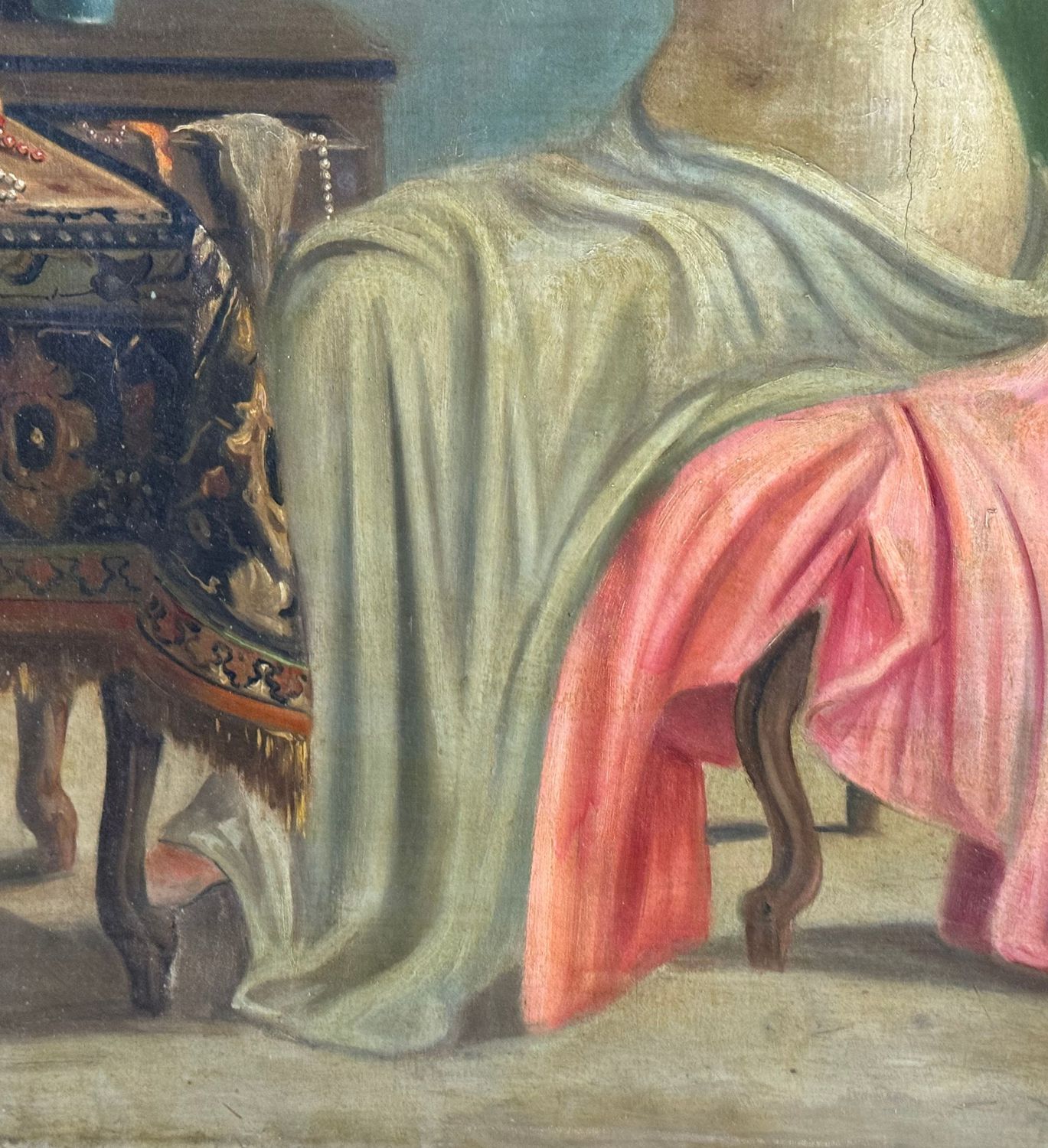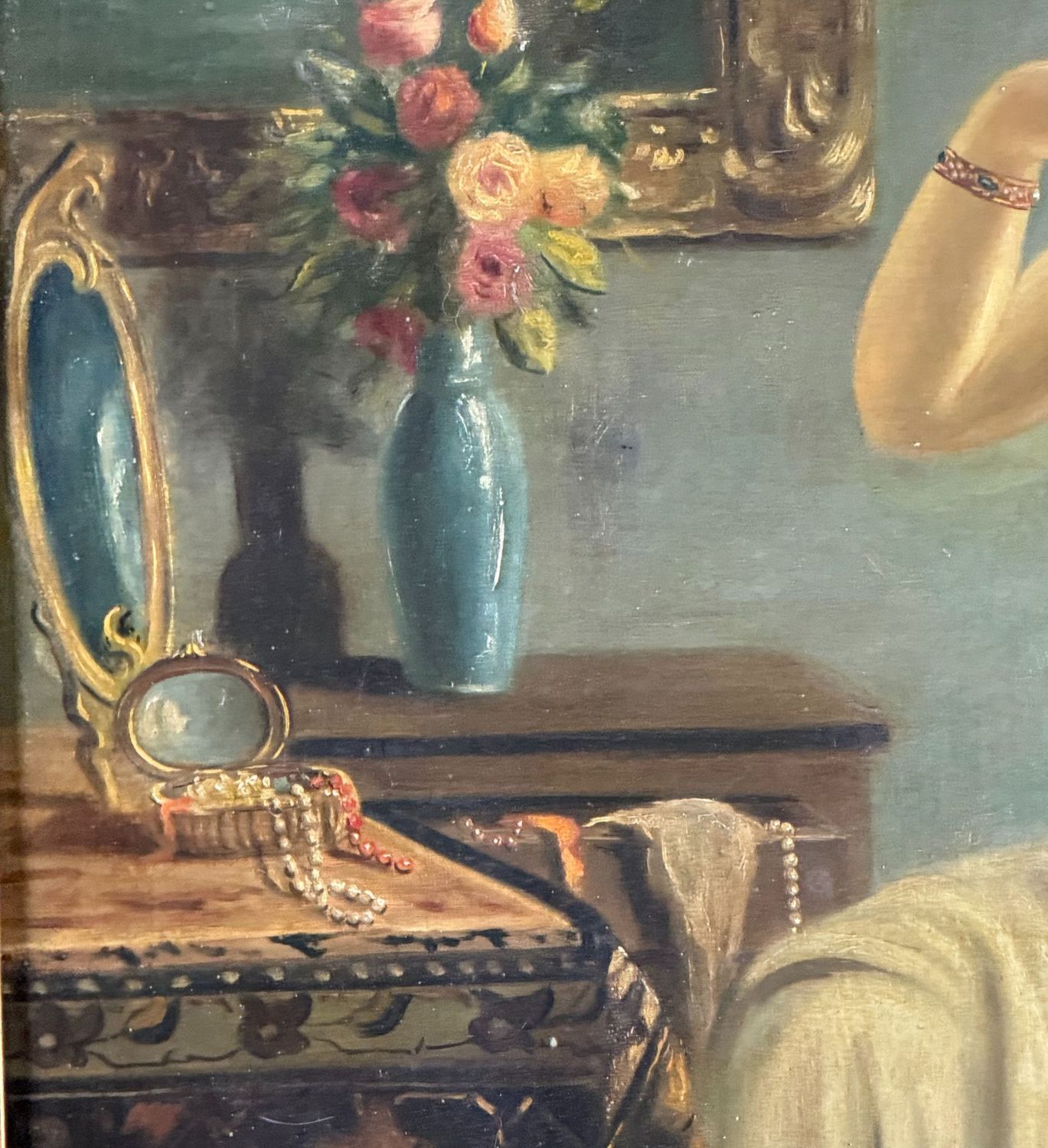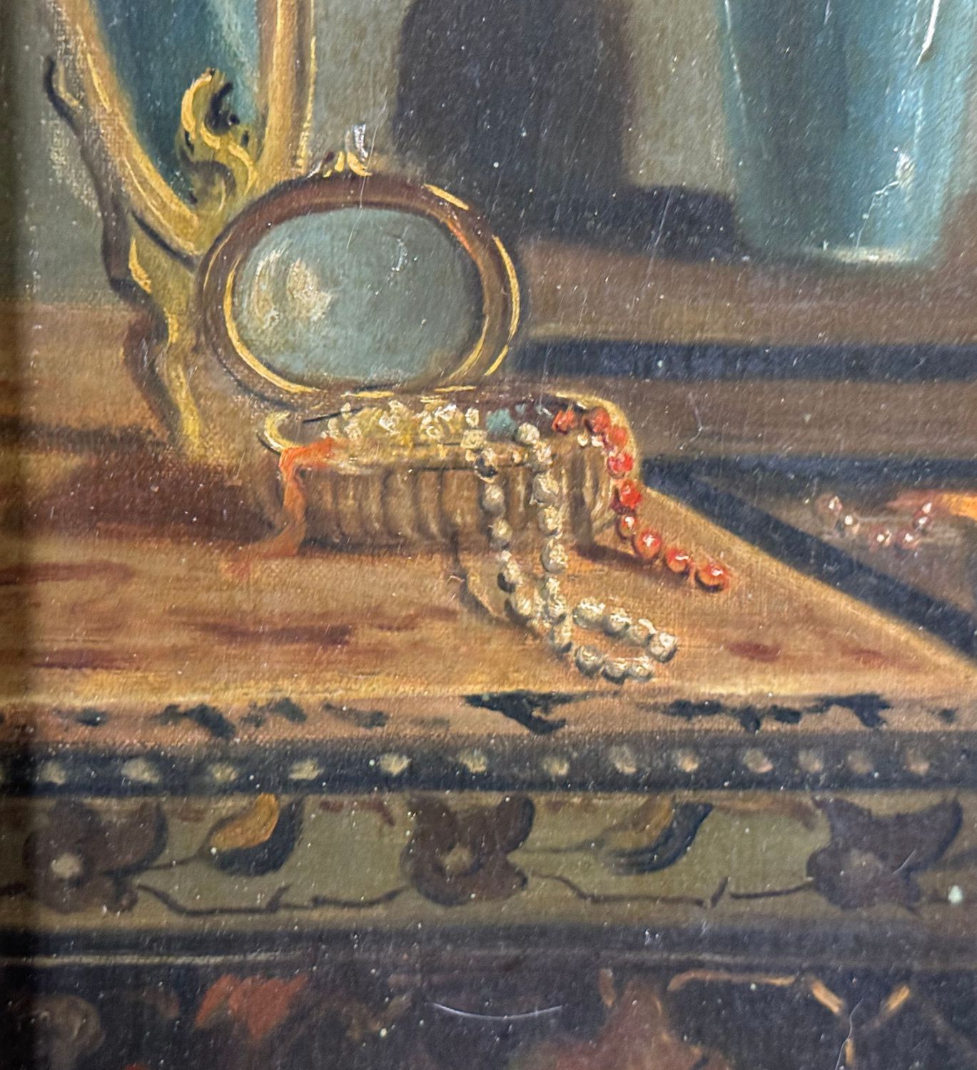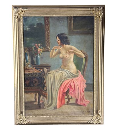 Dipinto olio su tela, periodo XIX/XX secolo scuola Italiana, raffigurante Donna mentre si specchia. Dimensioni compreso cornice: 64x85 cm. Dimensioni interno cornice: 50x70 cm. Reca firma in basso a destra da artista non identificato. Opera in buone condizioni. Da segnalare un taglio alla tela da riparare come da foto allegate.