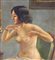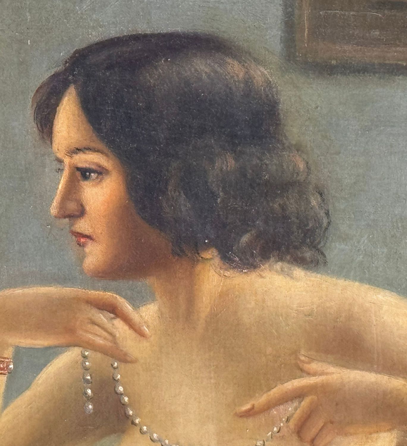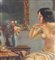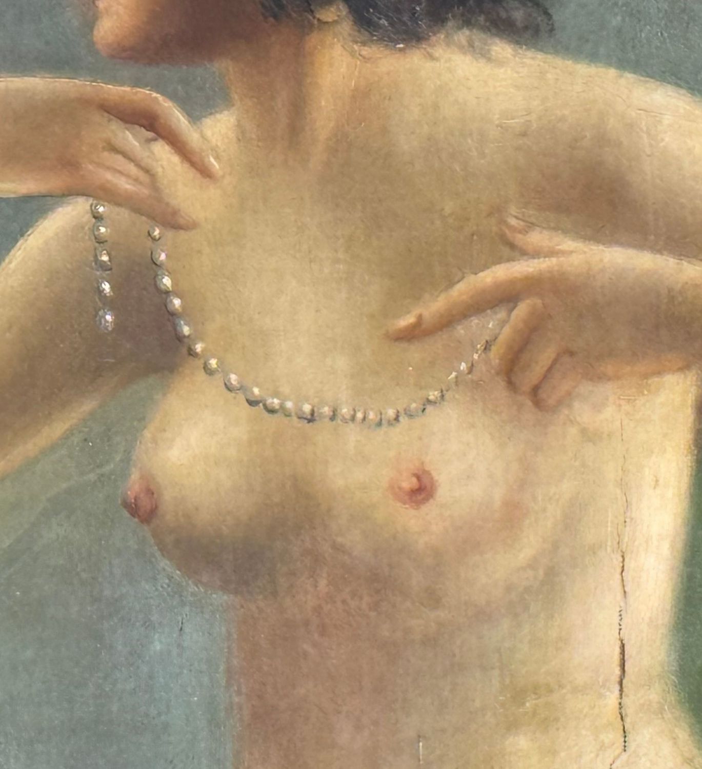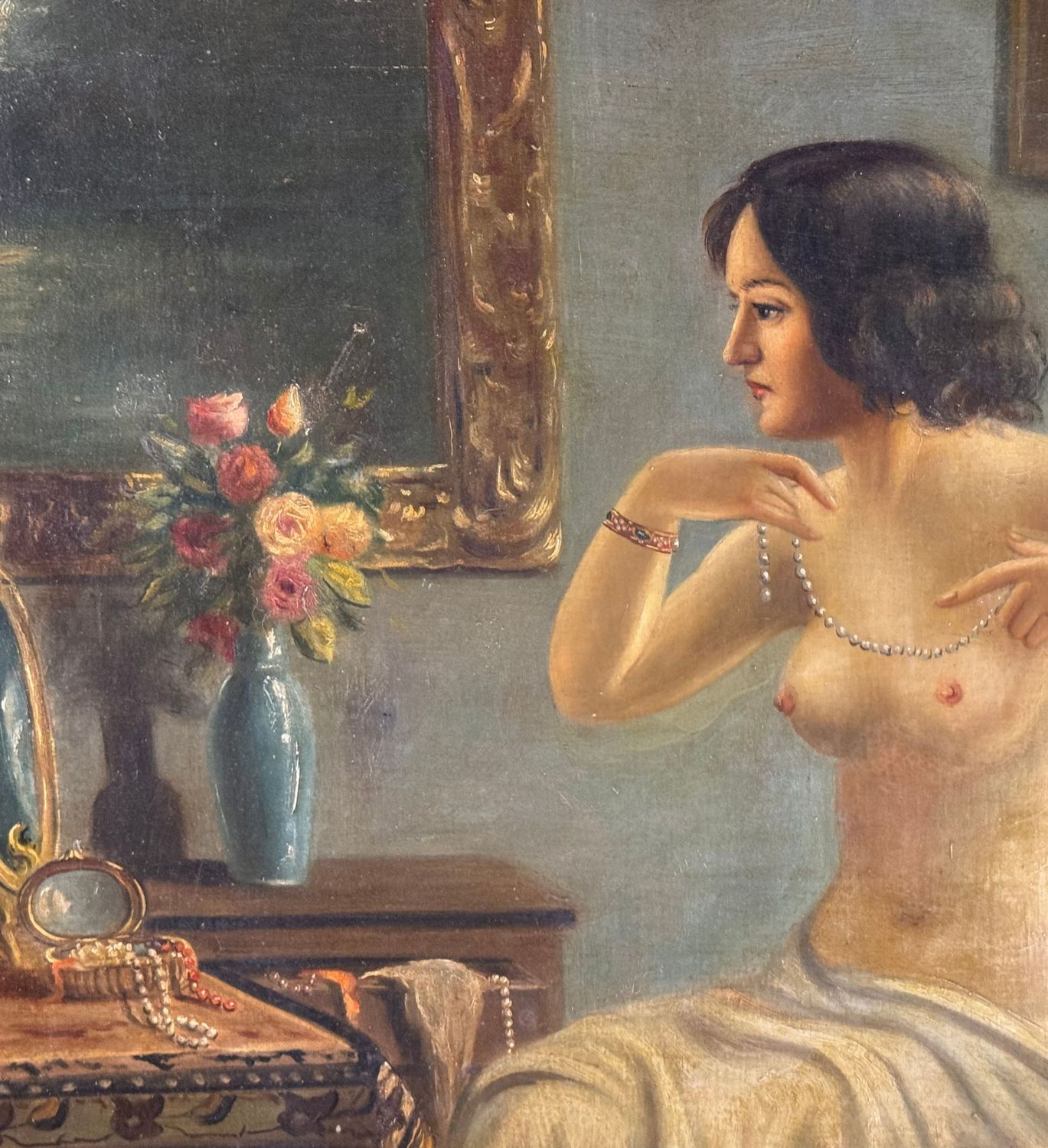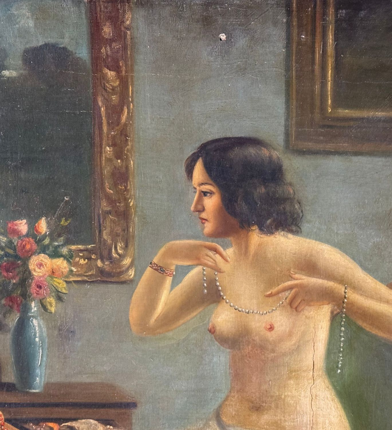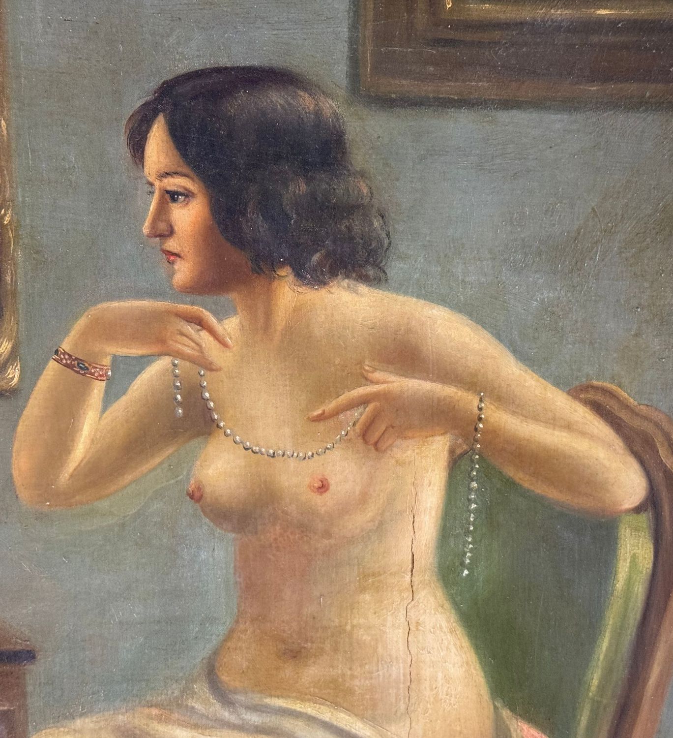 Dipinto olio su tela, periodo XIX/XX secolo scuola Italiana, raffigurante Donna mentre si specchia. Dimensioni compreso cornice: 64x85 cm. Dimensioni interno cornice: 50x70 cm. Reca firma in basso a destra da artista non identificato. Opera in buone condizioni. Da segnalare un taglio alla tela da riparare come da foto allegate.