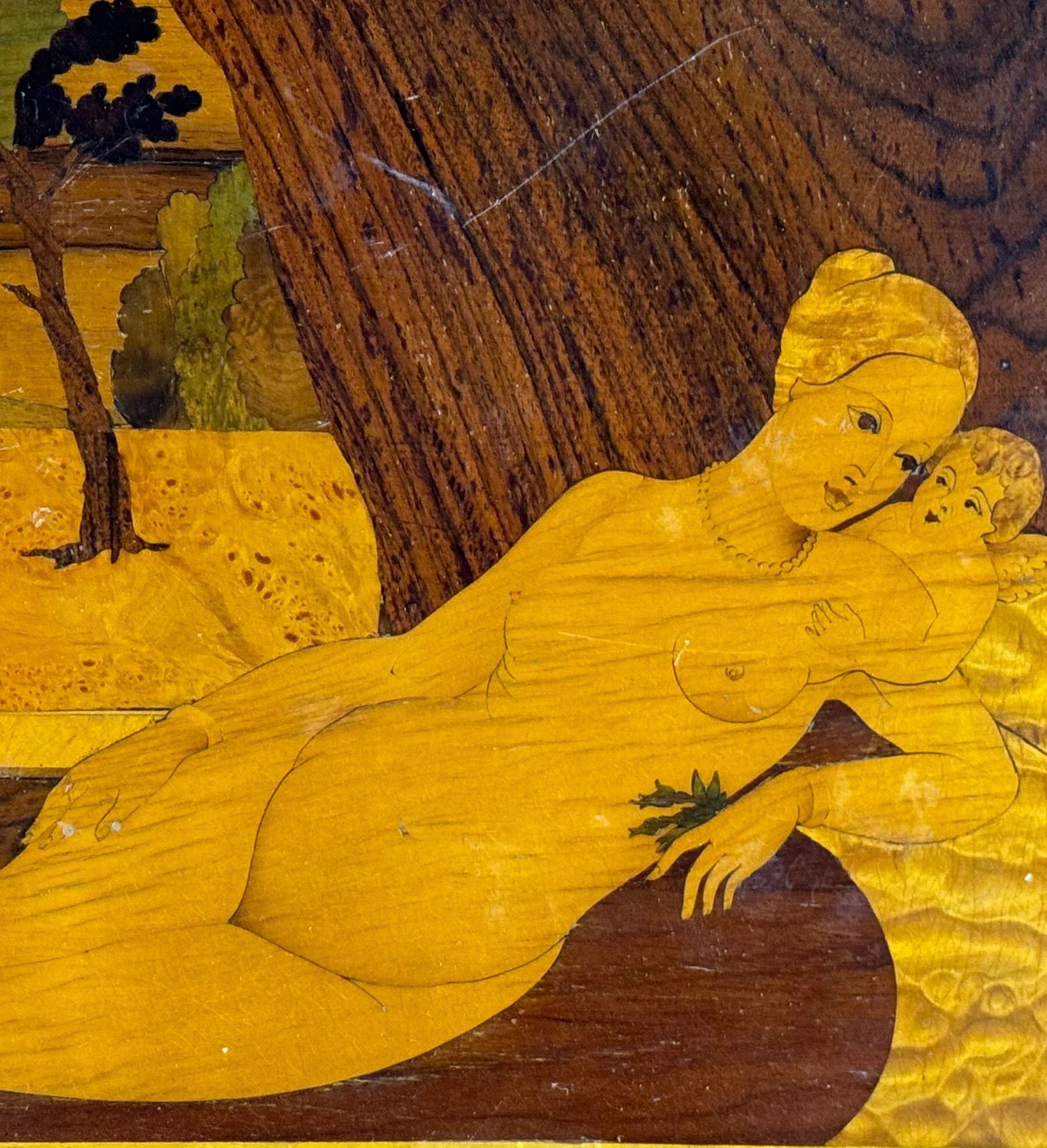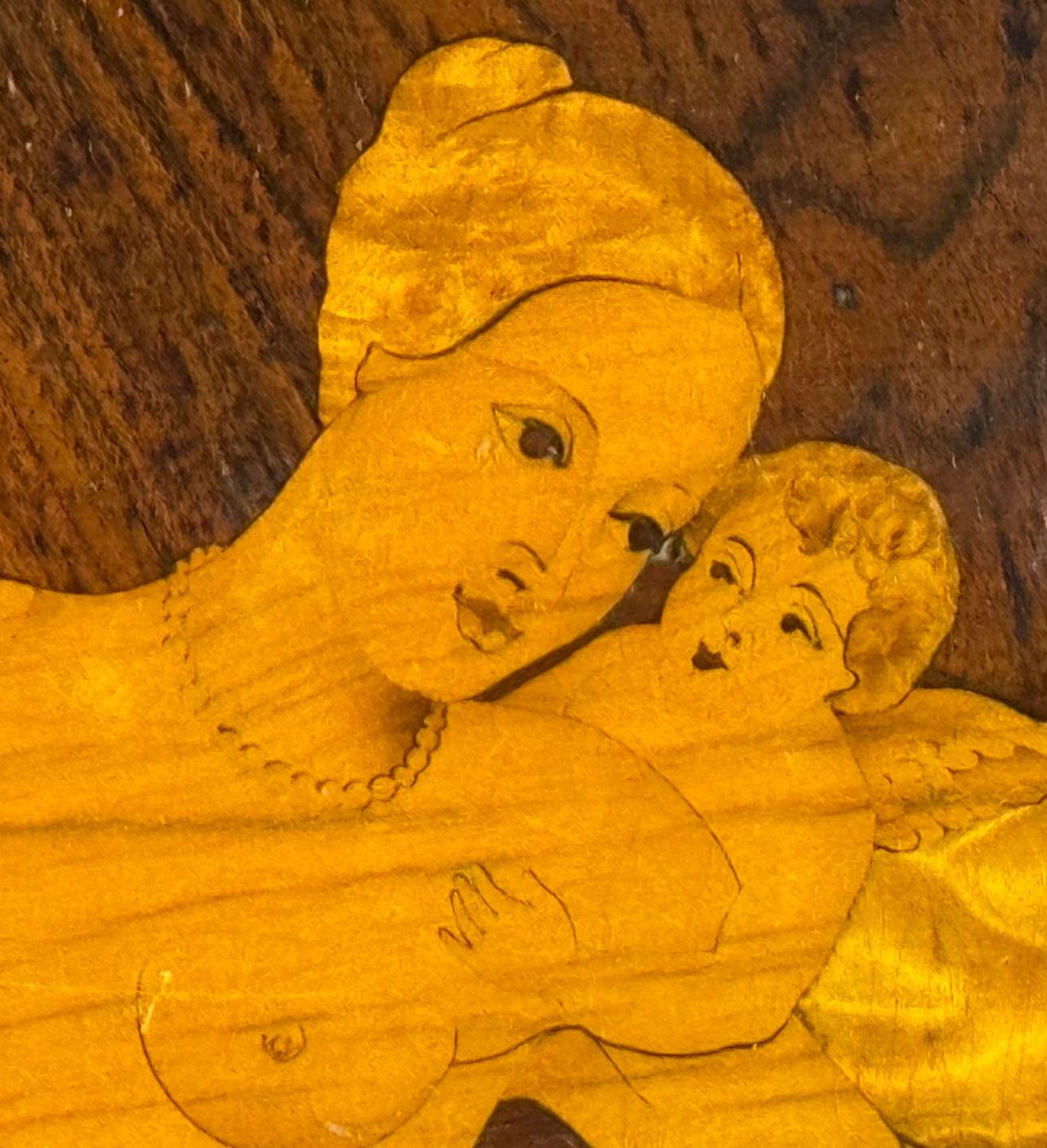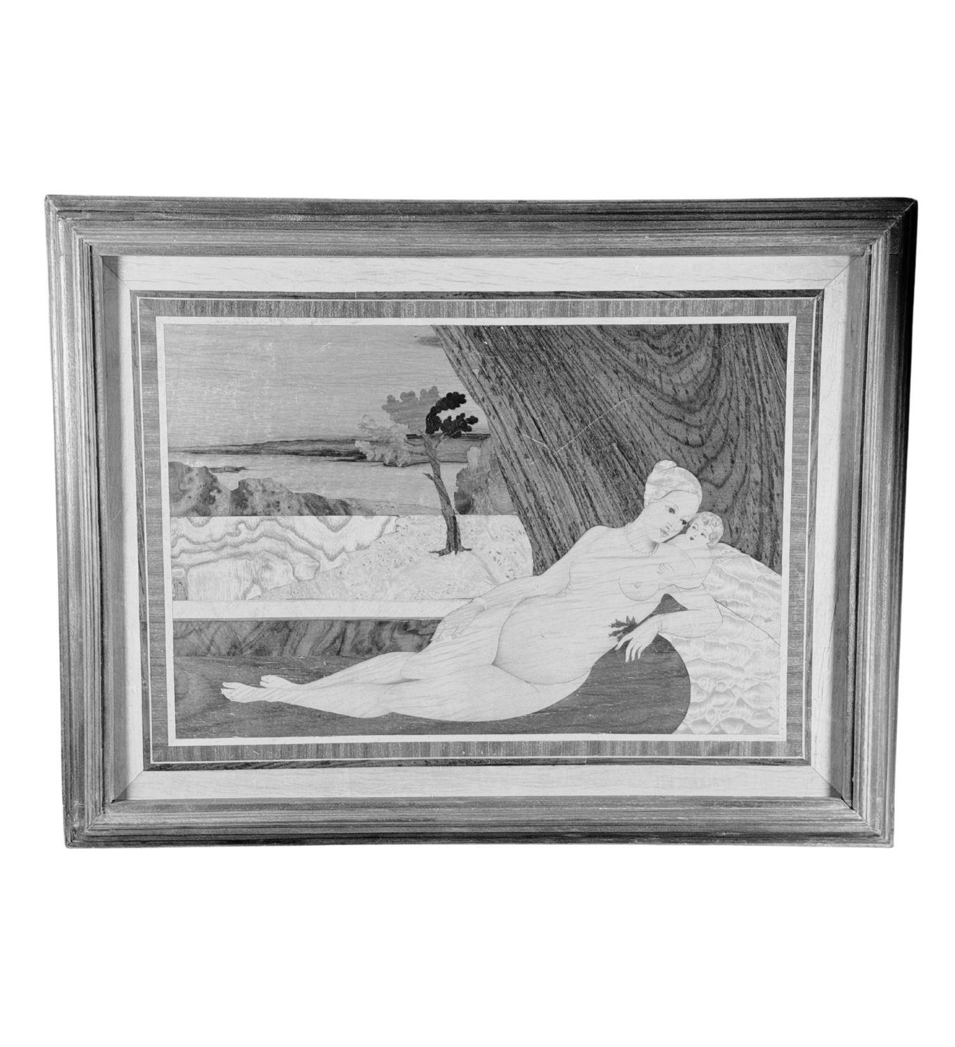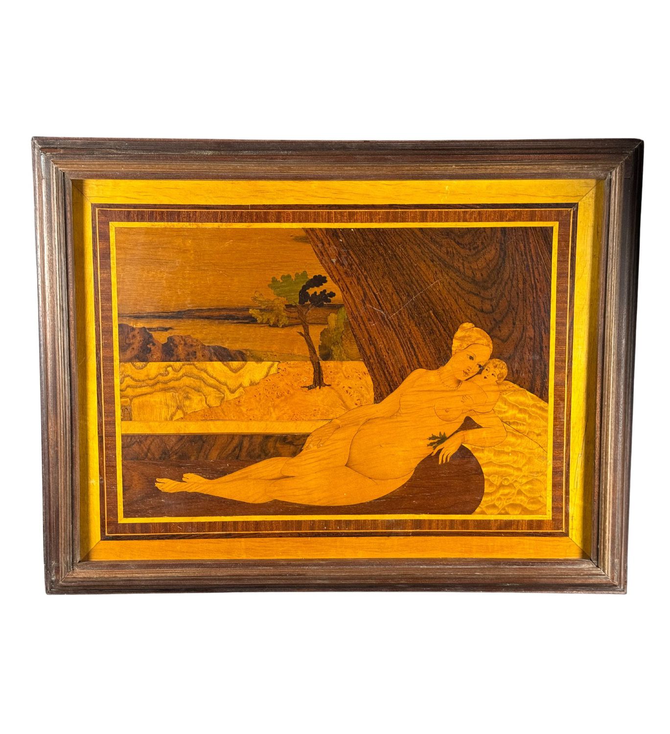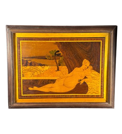 Pannello decorativo intarsiato a mano, lavoro Sorrentino periodo XX secolo scuola Italiana, raffigurante Scena materna con paesaggio. Dimensioni compreso cornice: 79x61 cm. Dimensioni interno cornice: 70x52 cm. Opera in buone condizioni.