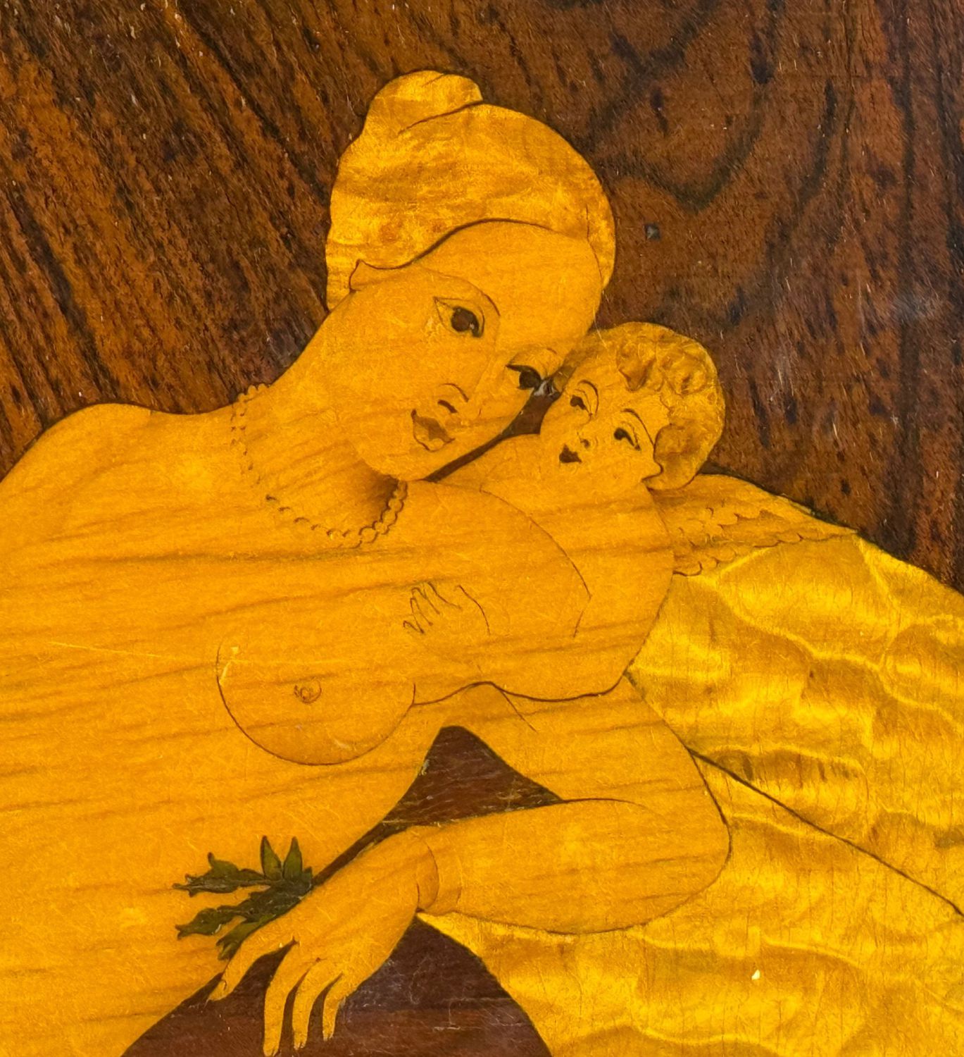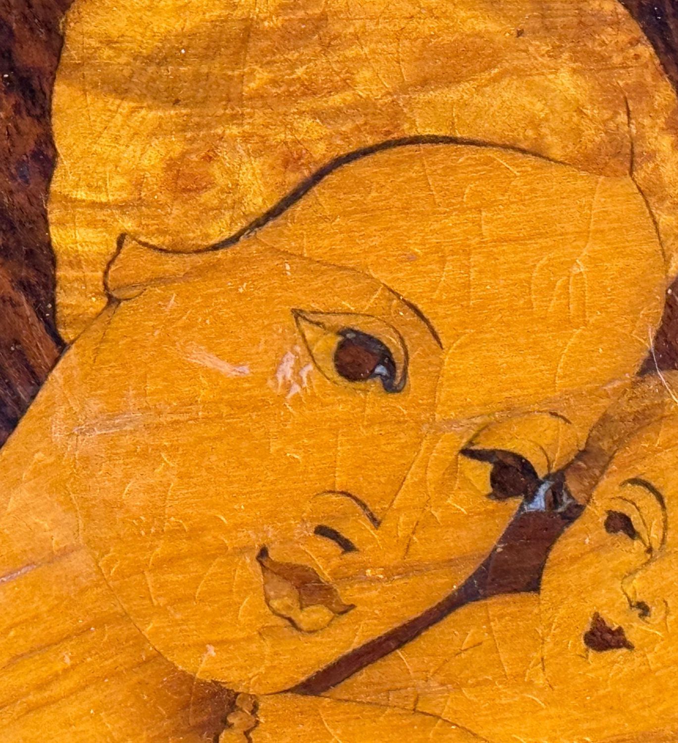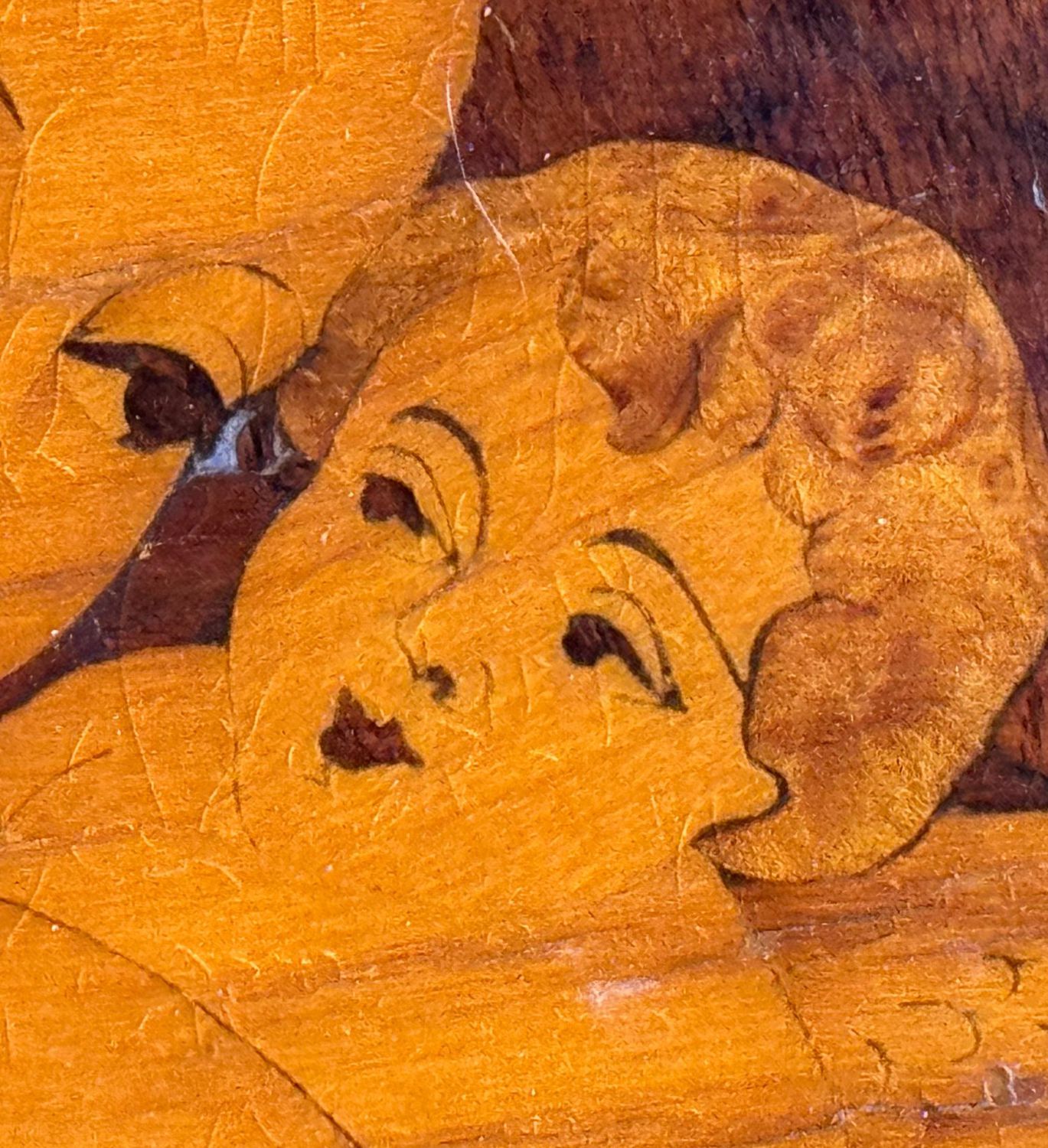 Pannello decorativo intarsiato a mano, lavoro Sorrentino periodo XX secolo scuola Italiana, raffigurante Scena materna con paesaggio. Dimensioni compreso cornice: 79x61 cm. Dimensioni interno cornice: 70x52 cm. Opera in buone condizioni.