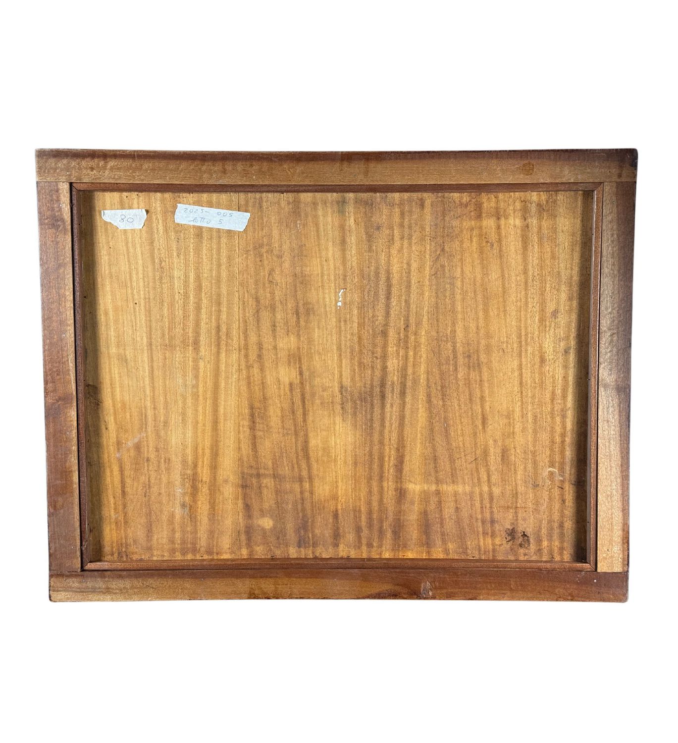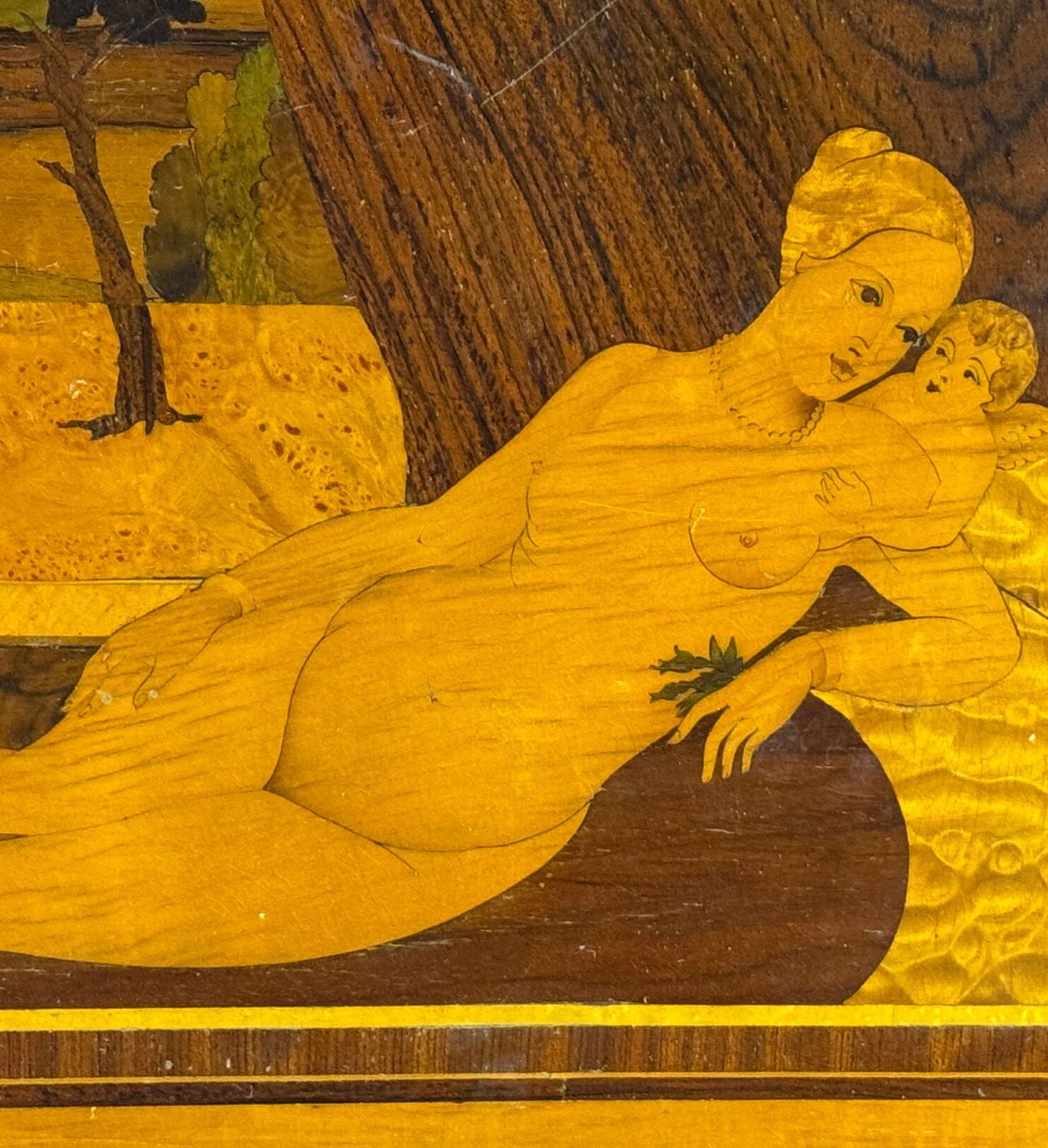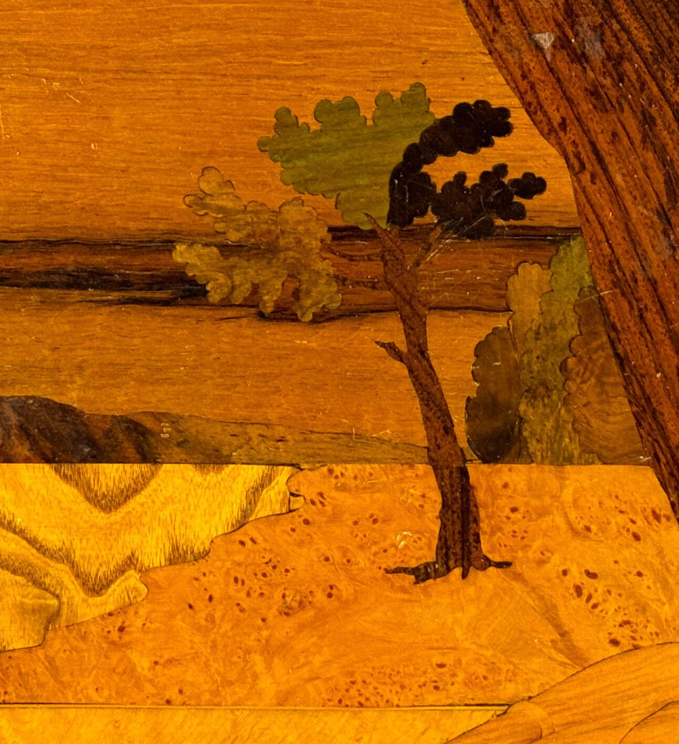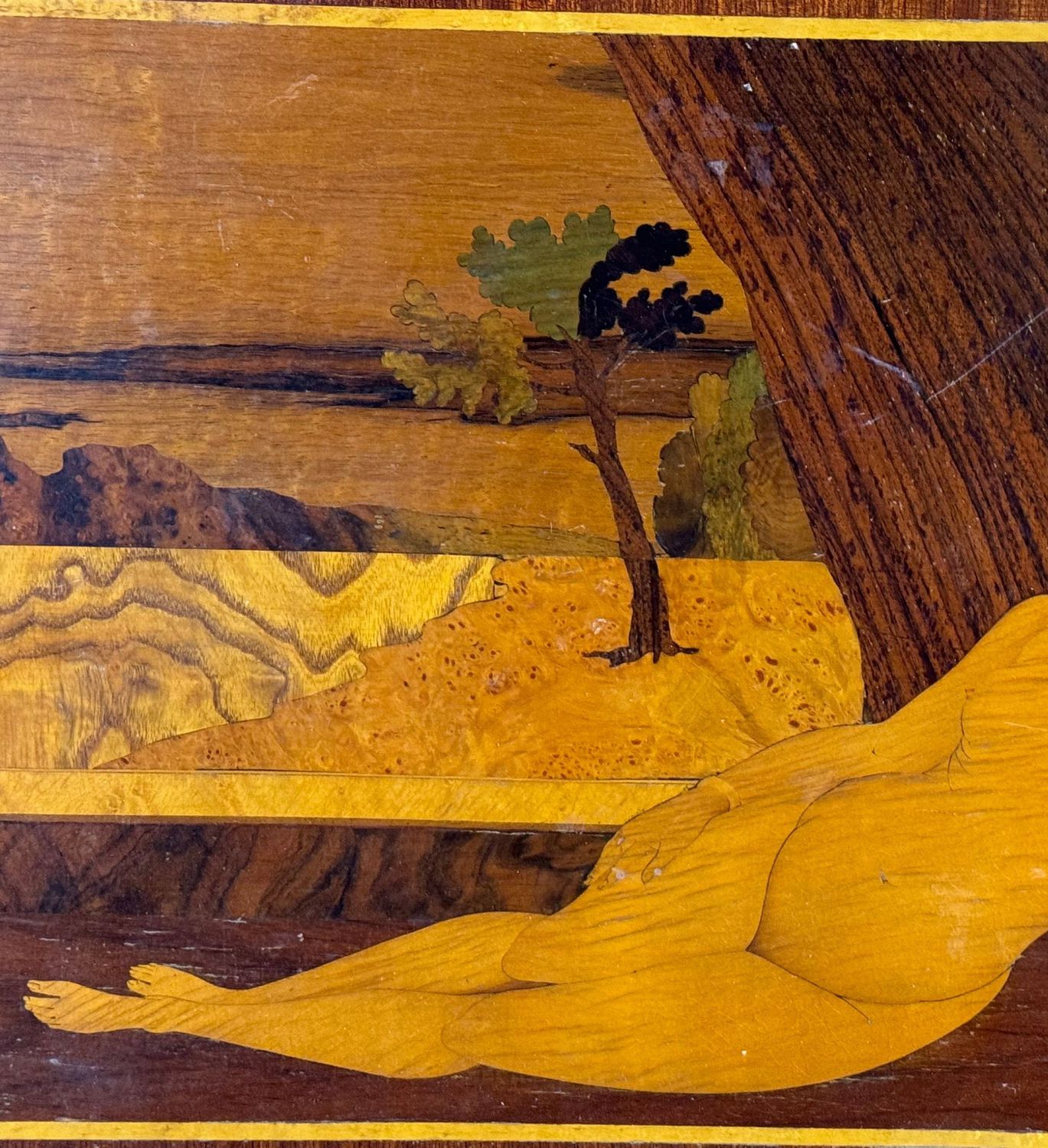 Pannello decorativo intarsiato a mano, lavoro Sorrentino periodo XX secolo scuola Italiana, raffigurante Scena materna con paesaggio. Dimensioni compreso cornice: 79x61 cm. Dimensioni interno cornice: 70x52 cm. Opera in buone condizioni.