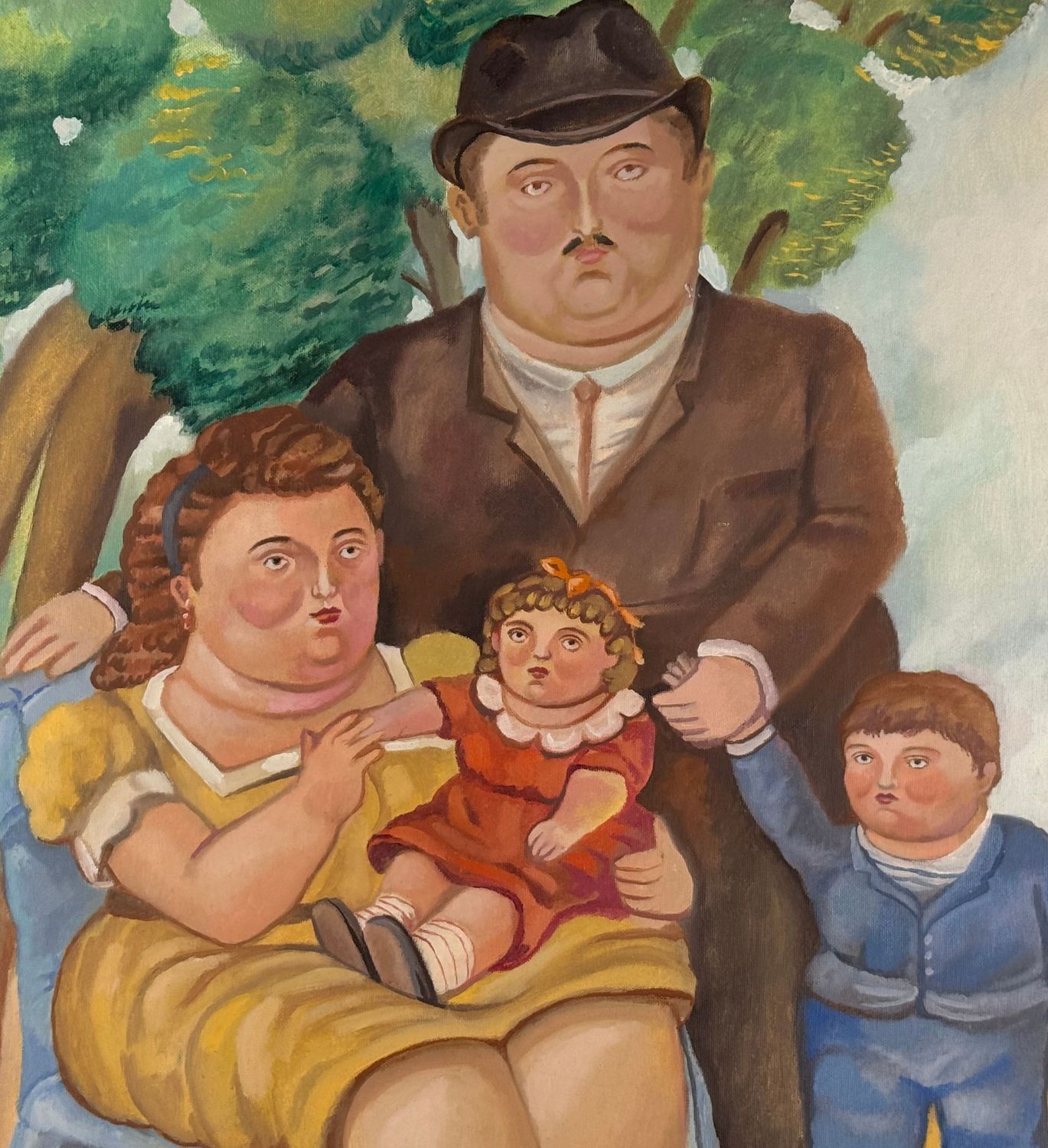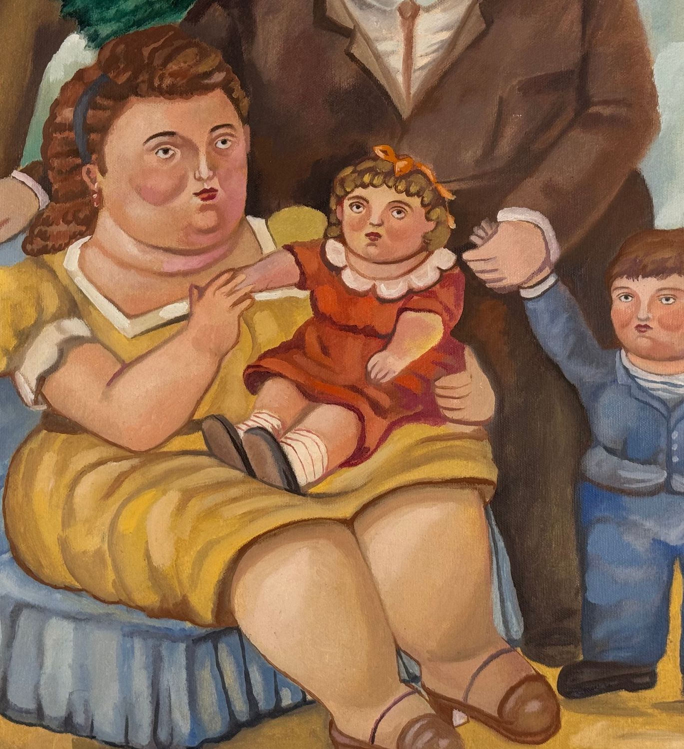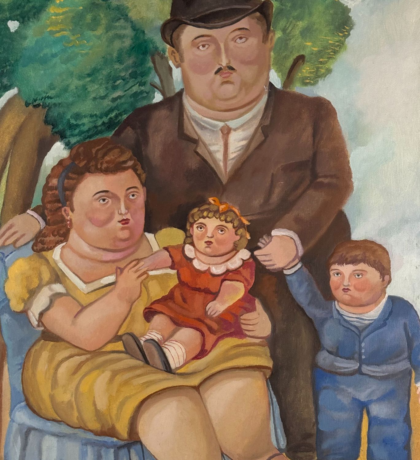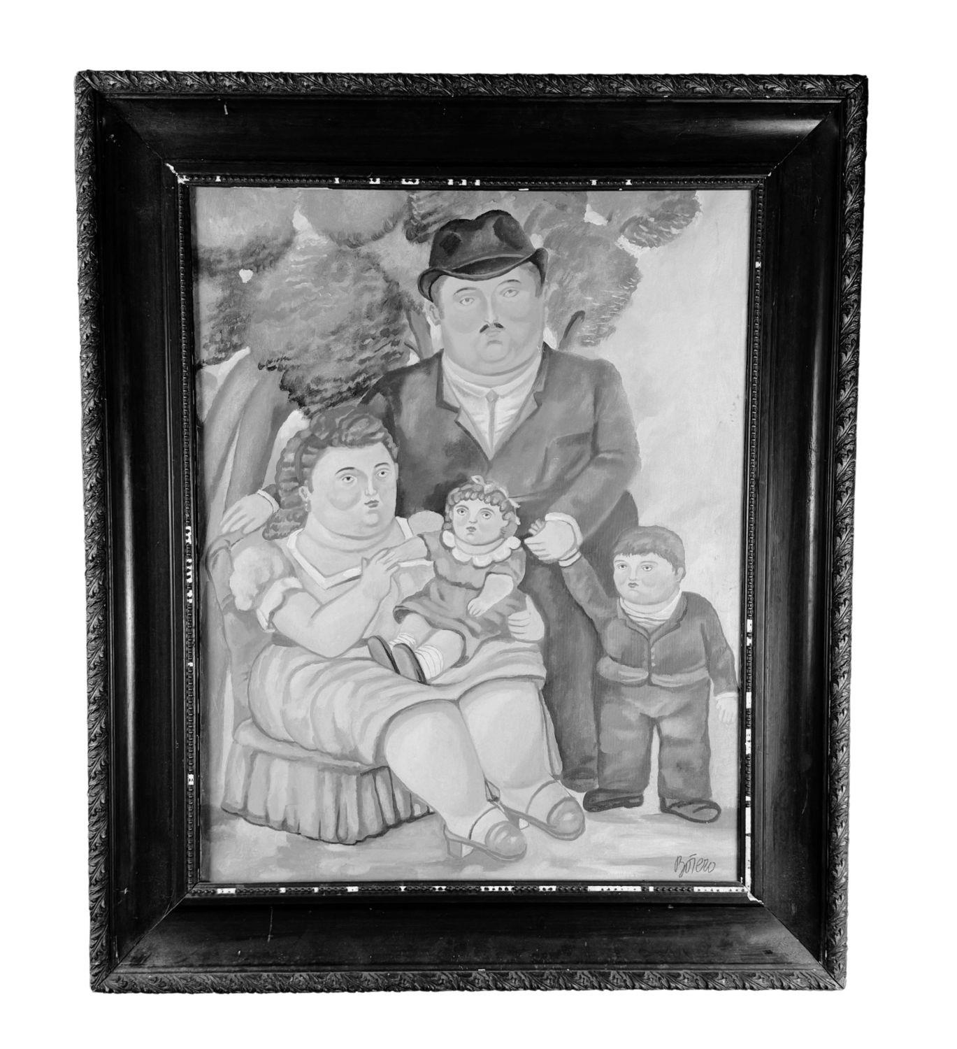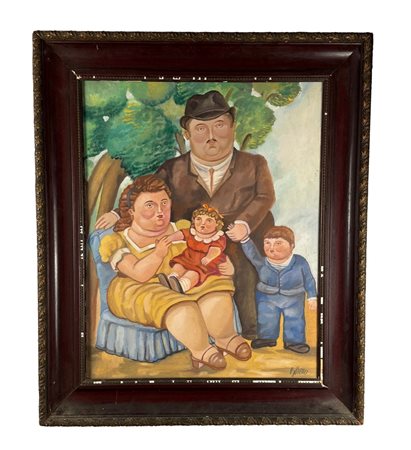 Dipinto olio su tela, periodo XX secolo scuola italiana, raffigurante Ritratto di famiglia. Opera omaggio a Botero (copia d'autore). Dimensioni compreso cornice: 74x88 cm. Dimensioni interno cornice: 54x70 cm. Da artista nonimo. Opera in buone condizioni.
