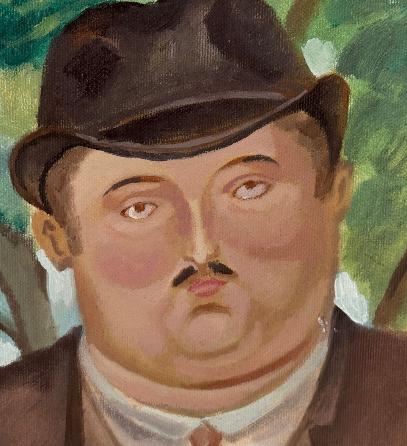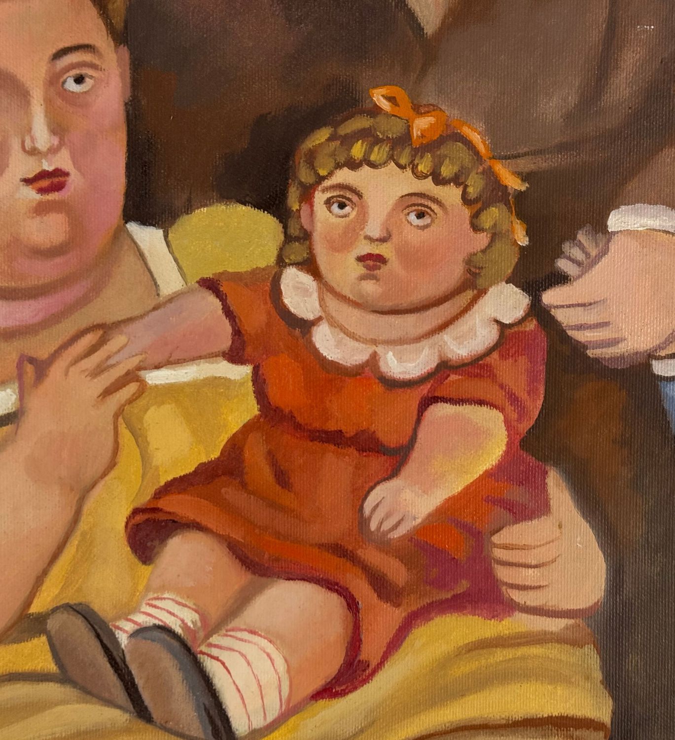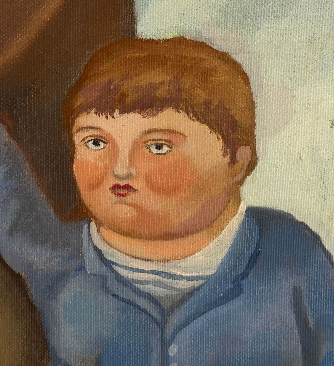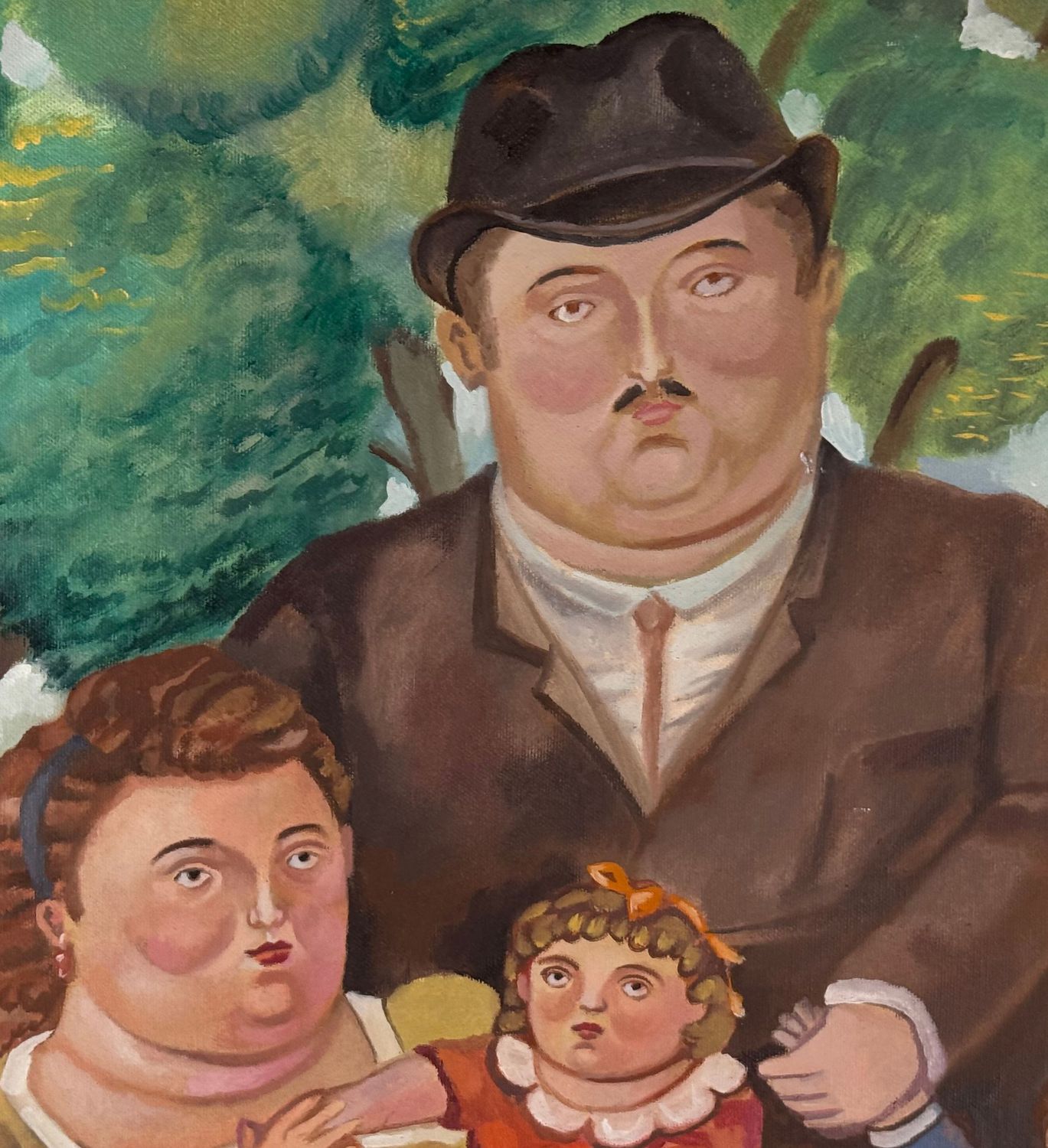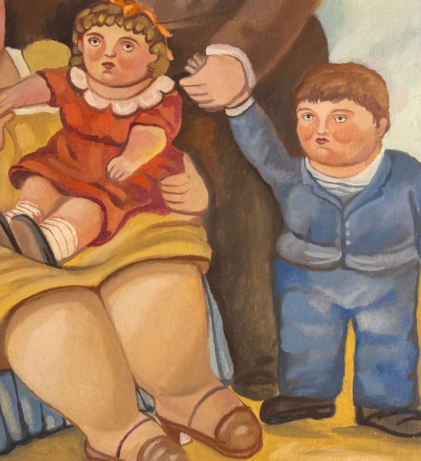 Dipinto olio su tela, periodo XX secolo scuola italiana, raffigurante Ritratto di famiglia. Opera omaggio a Botero (copia d'autore). Dimensioni compreso cornice: 74x88 cm. Dimensioni interno cornice: 54x70 cm. Da artista nonimo. Opera in buone condizioni.