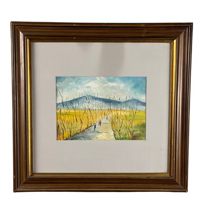 Dipinto olio su tavola, periodo XX secolo scuola Italiana, raffigurante Paesaggio. Dimensioni compreso cornice: 50x48 cm. Dimensioni interno cornice: 26x18 cm. Reca firma in basso a destra S. Cannata. Opera in buone condizioni.