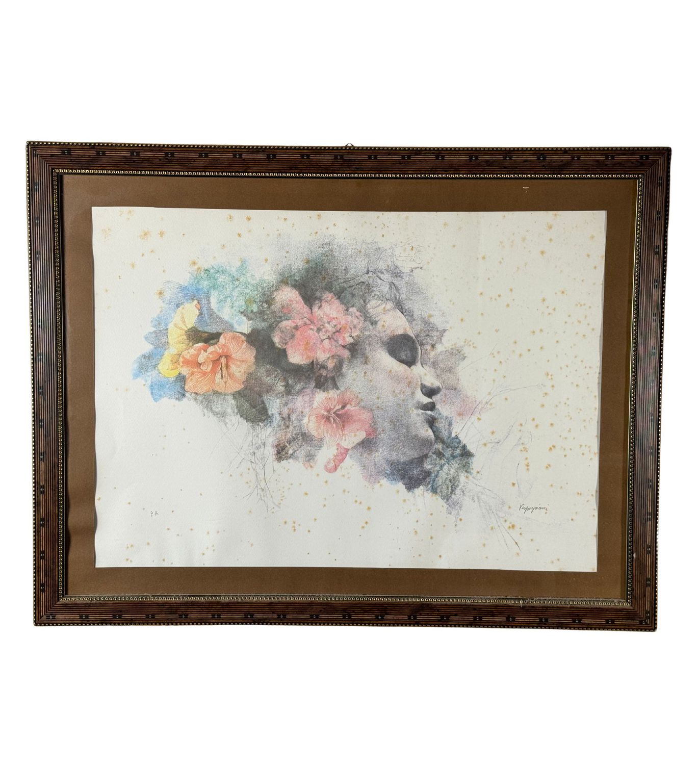 Prova d'autore, stampa acquerellata, periodo XX secolo scuola Italiana, raffigurante Donna e fiori. Dimensioni compreso cornice: 80x61 cm. Dimensioni interno cornice: 65x45 cm. Reca firma in basso a destra Renzo Vespignani. Opera in buone condizioni con lievi segni di vissuto come da foto allegate.