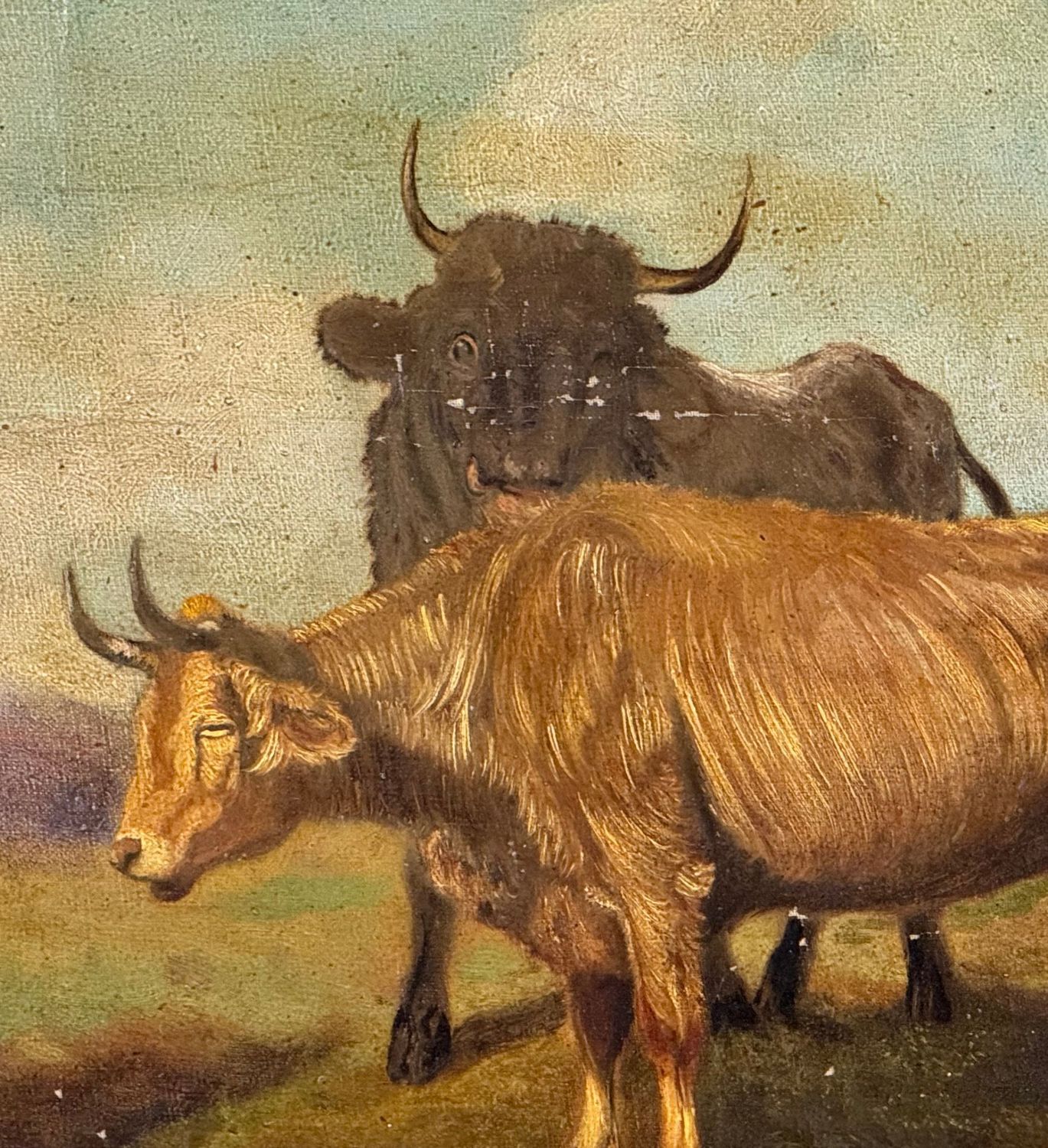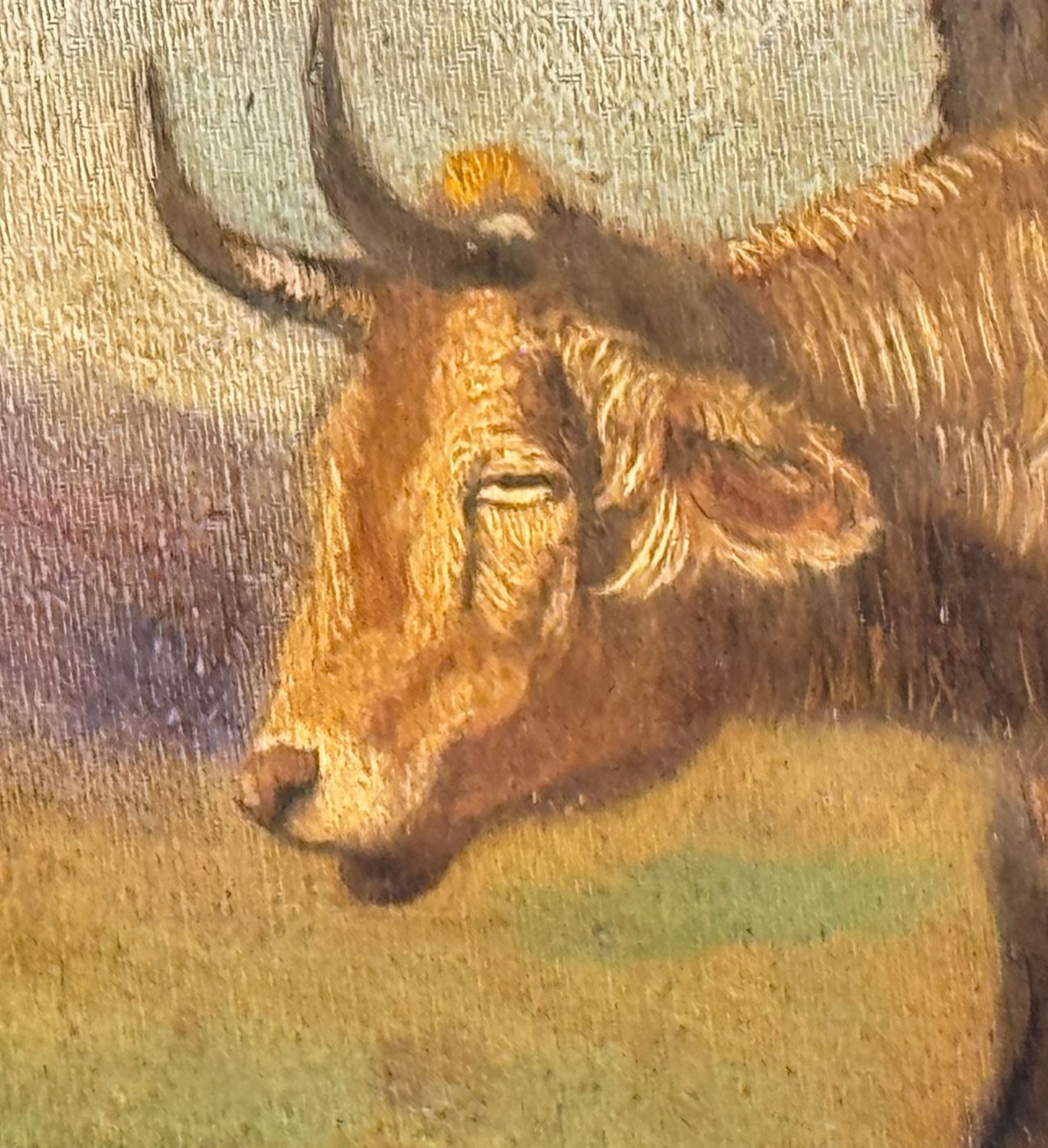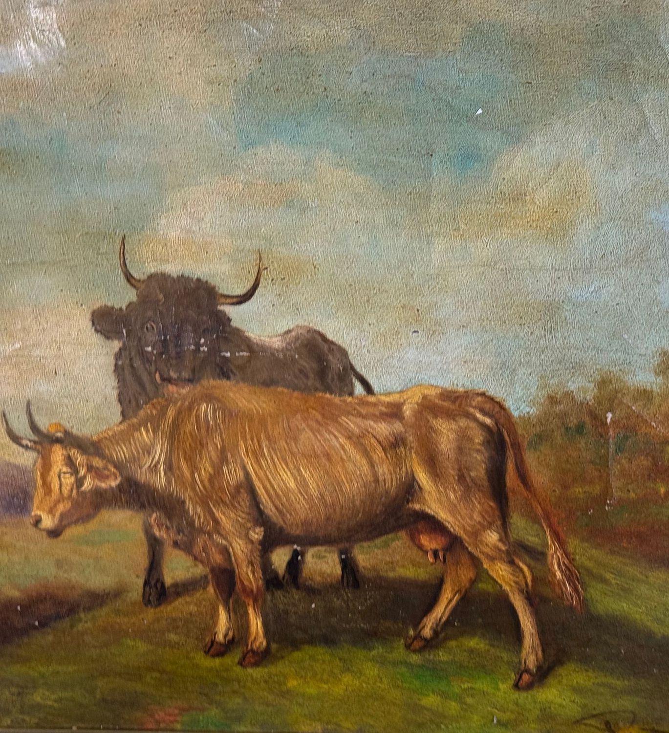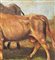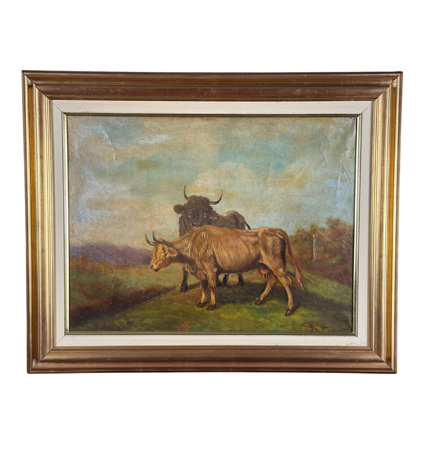 Dipinto olio su tela applicata su cartoncino, periodo XIX/XX secolo scuola Italiana, raffigurante Bestiame. Dimensioni compreso cornice: 62x50 cm. Dimensioni interno cornice: 48x37 cm. Reca firma in basso a destra artista non identificato. Opera in discrete condizioni come da foto allegate.