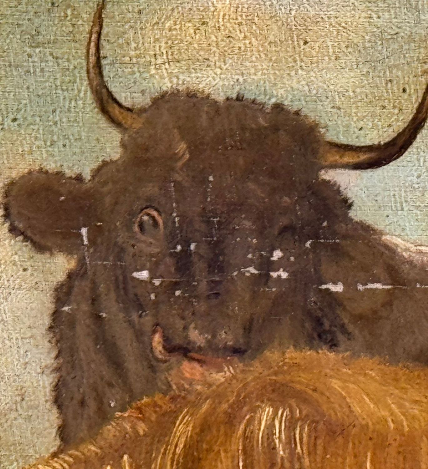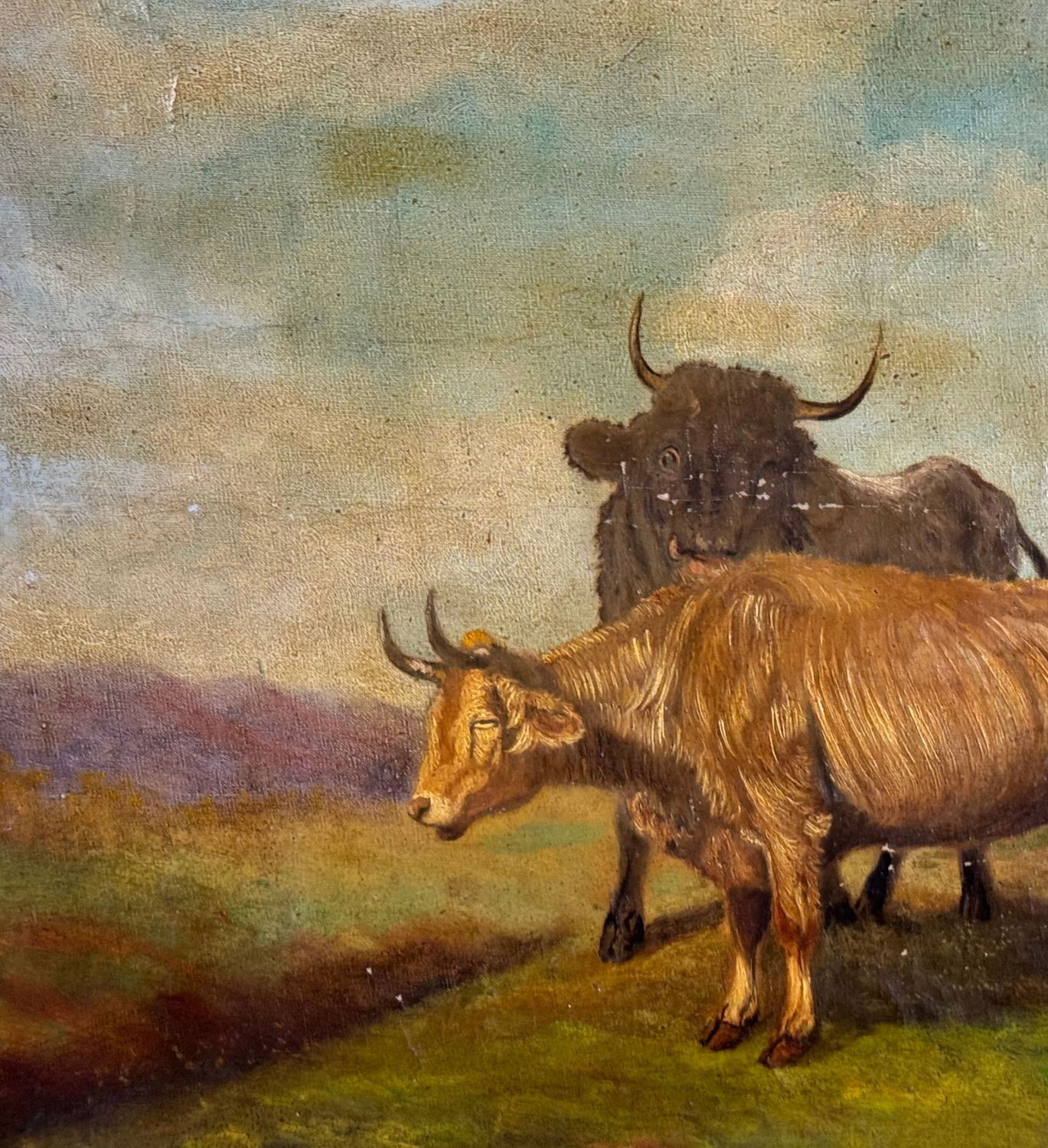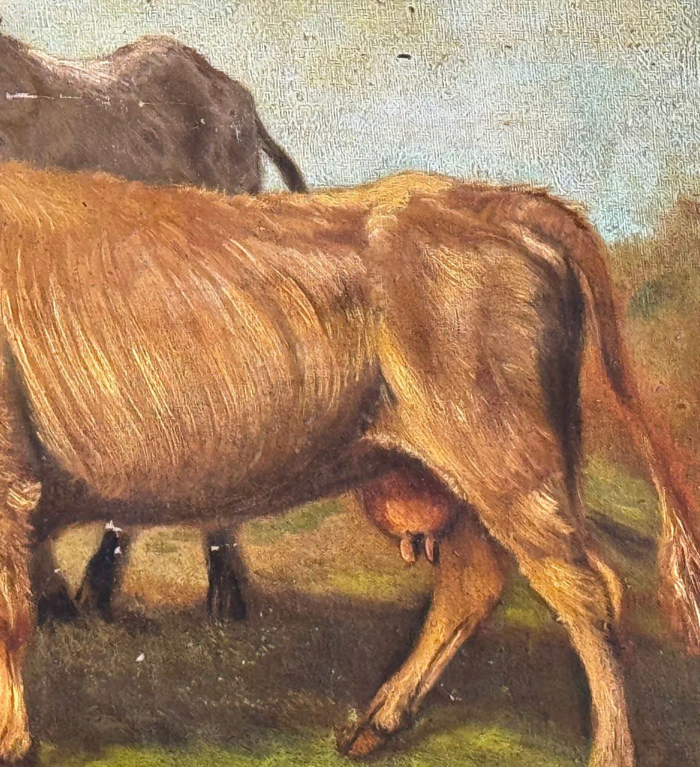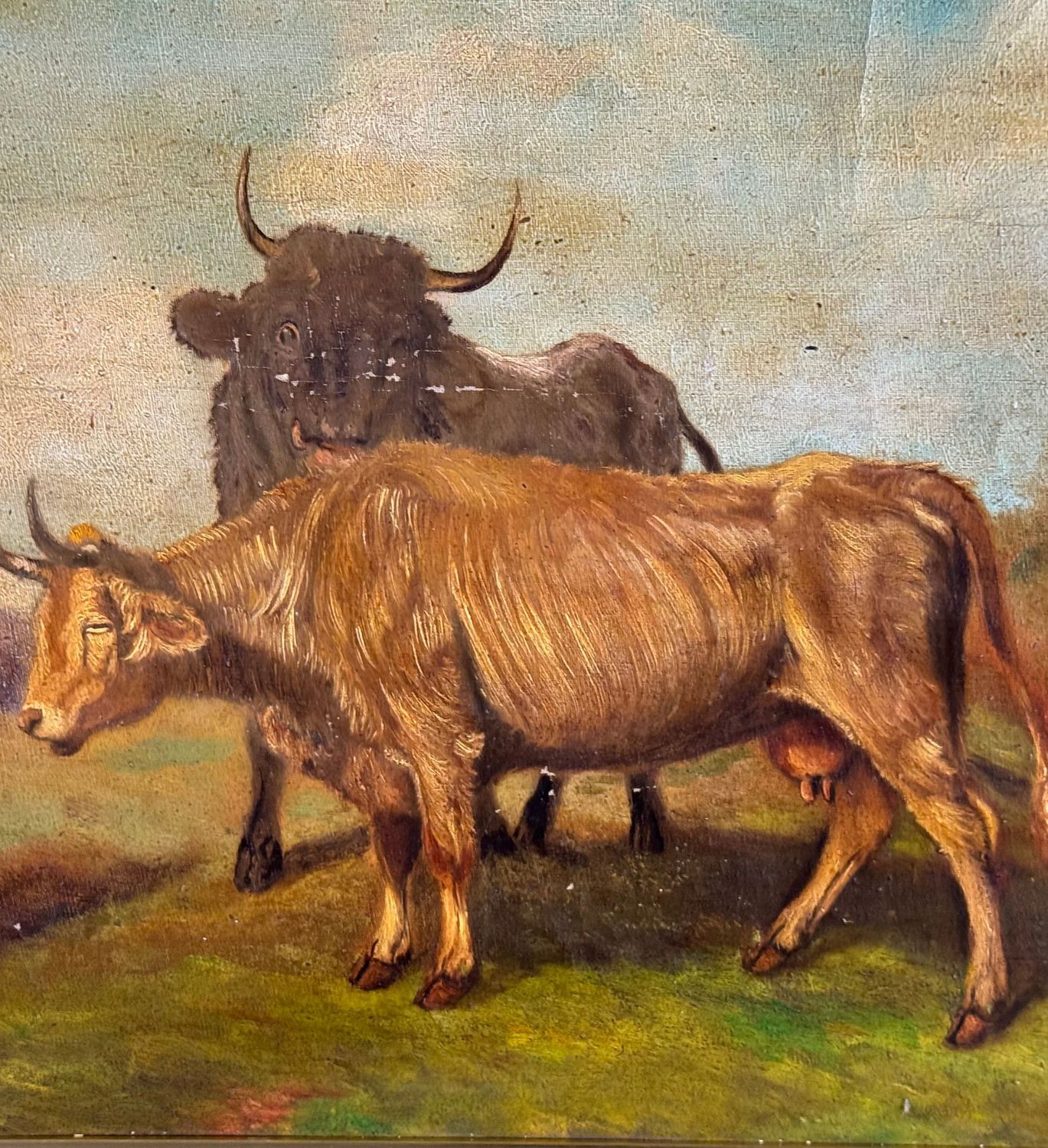 Dipinto olio su tela applicata su cartoncino, periodo XIX/XX secolo scuola Italiana, raffigurante Bestiame. Dimensioni compreso cornice: 62x50 cm. Dimensioni interno cornice: 48x37 cm. Reca firma in basso a destra artista non identificato. Opera in discrete condizioni come da foto allegate.