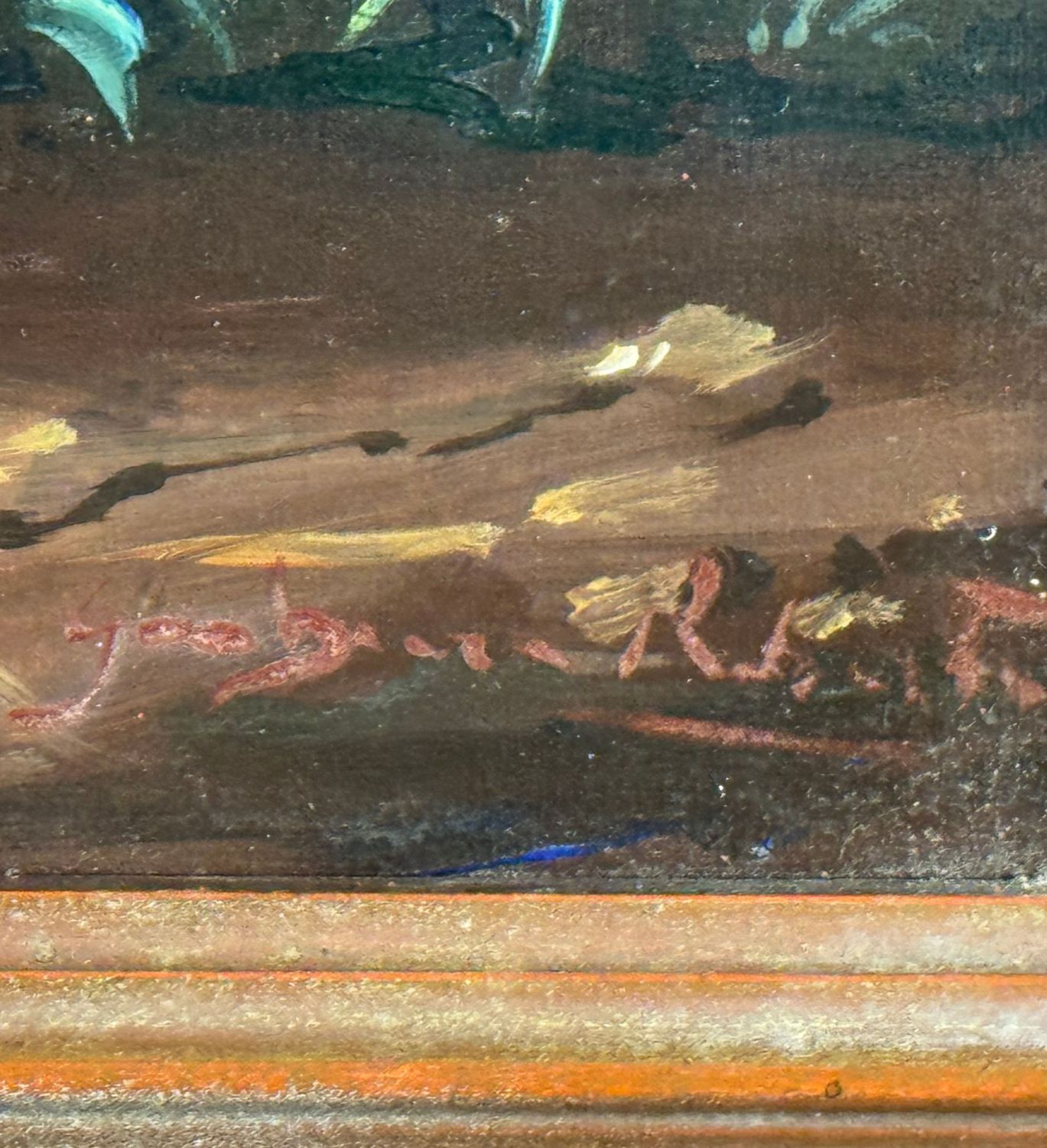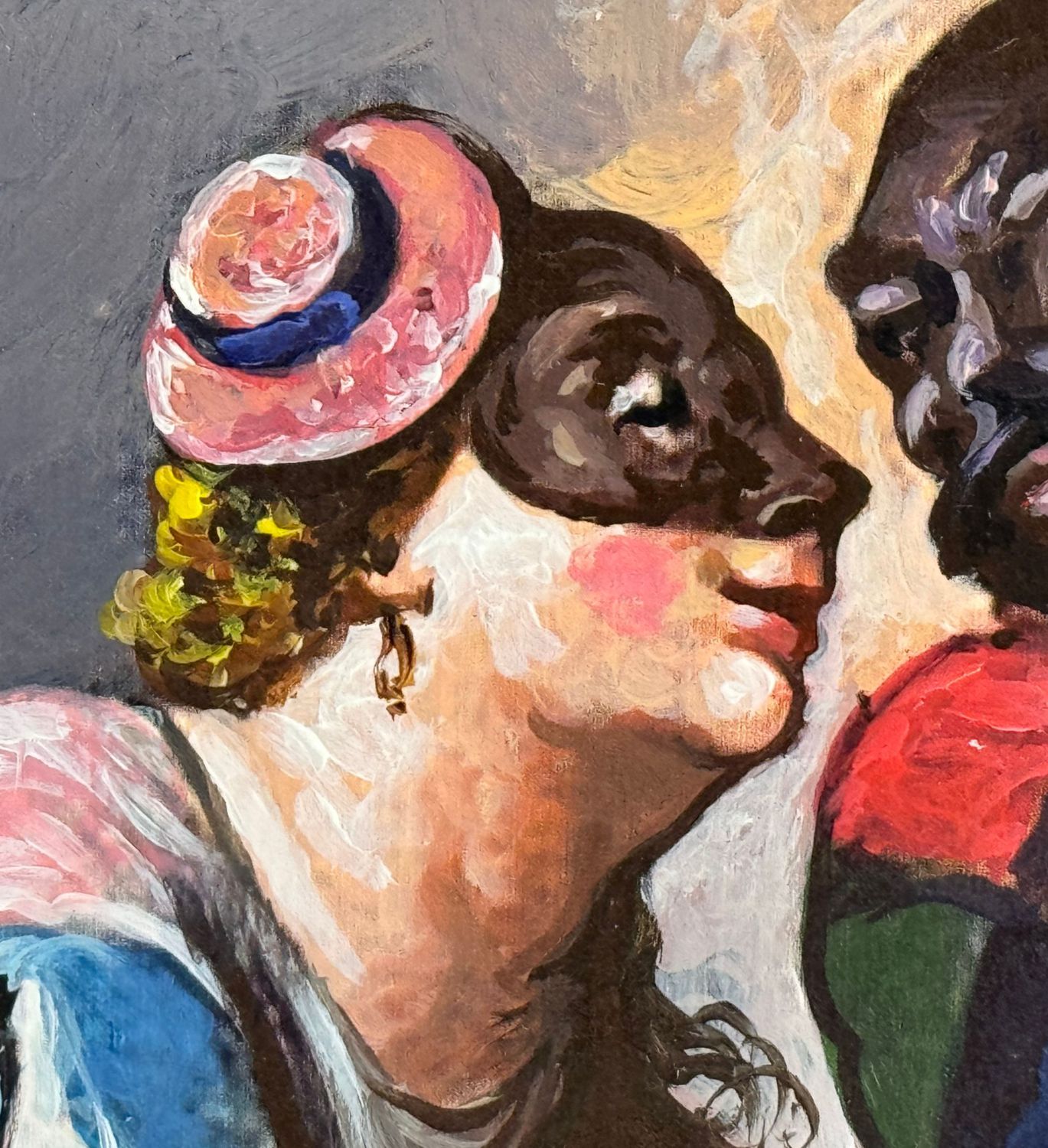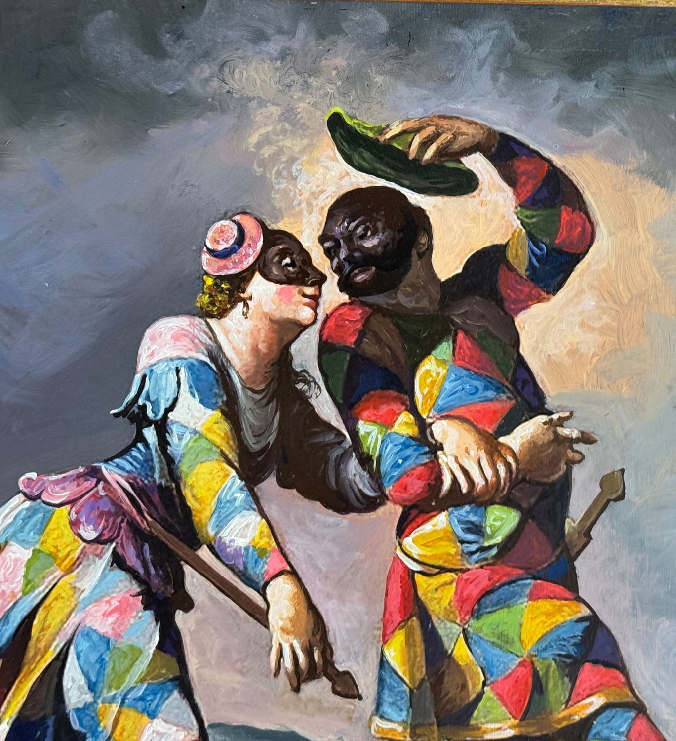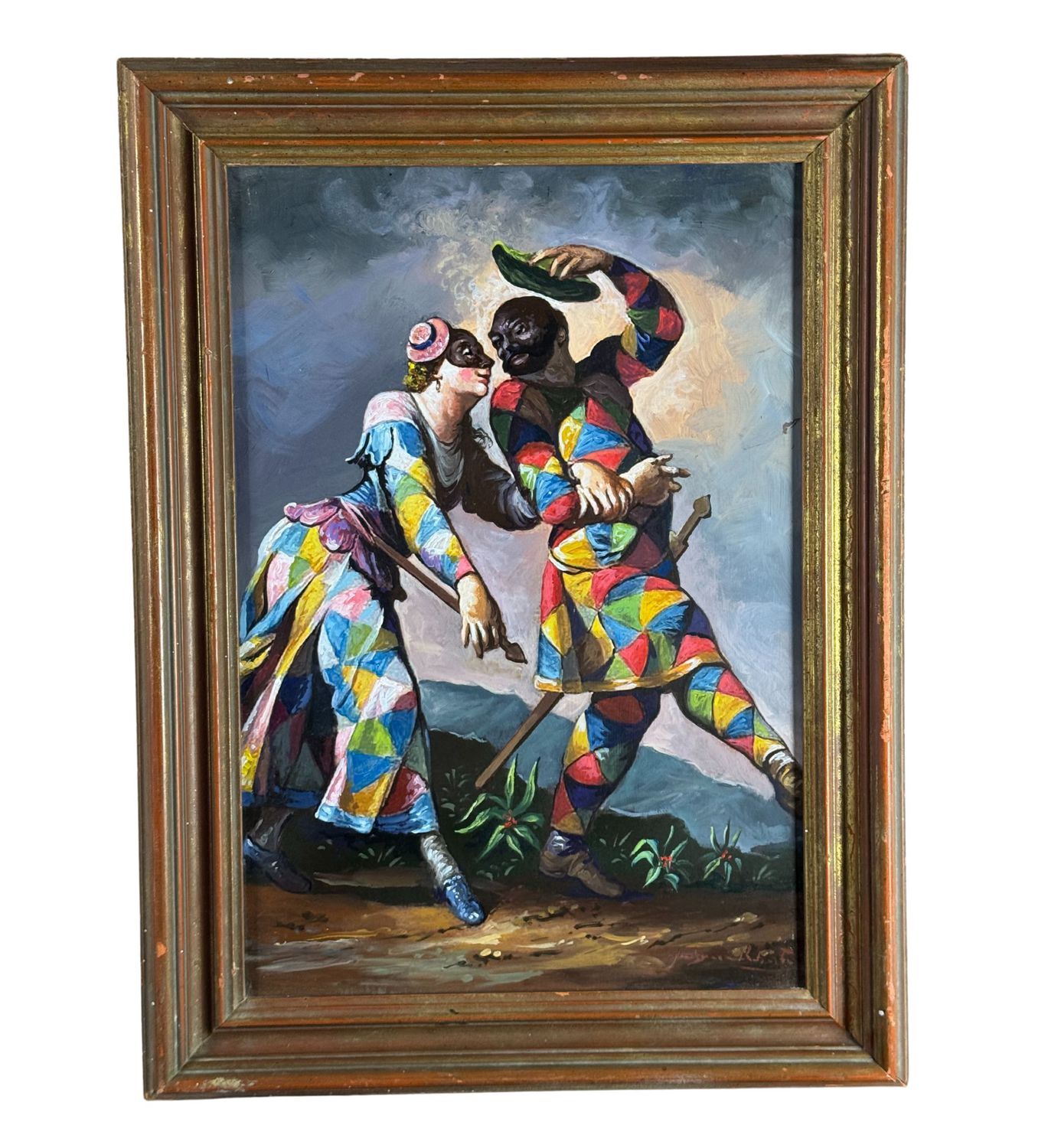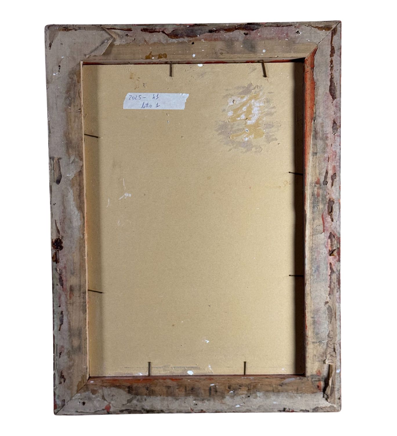 Dipinto olio su cartoncino, periodo XX secolo scuola Italiana, raffigurante Due personaggi in costume. Tratto da un lavoro di Giovanni Domenico Ferretti. Dimensioni compreso cornice: 46x61 cm. Dimensioni interno cornice: 35x50 cm. Reca firma in basso a destra artista non identificato. Opera in buone condizioni.
