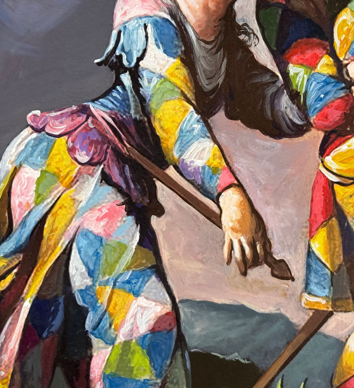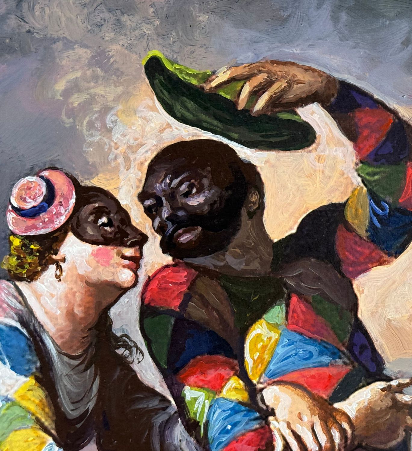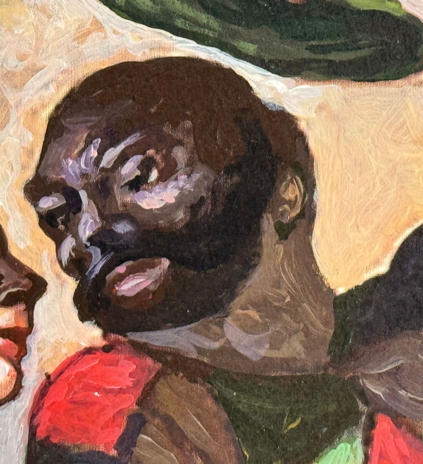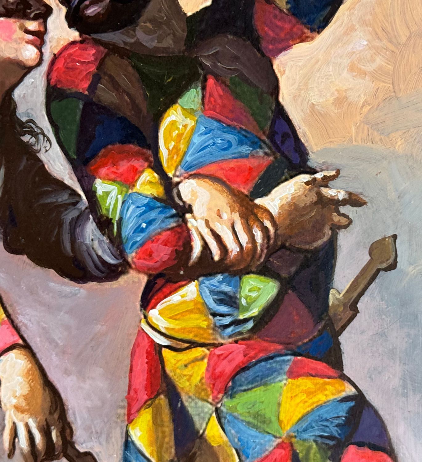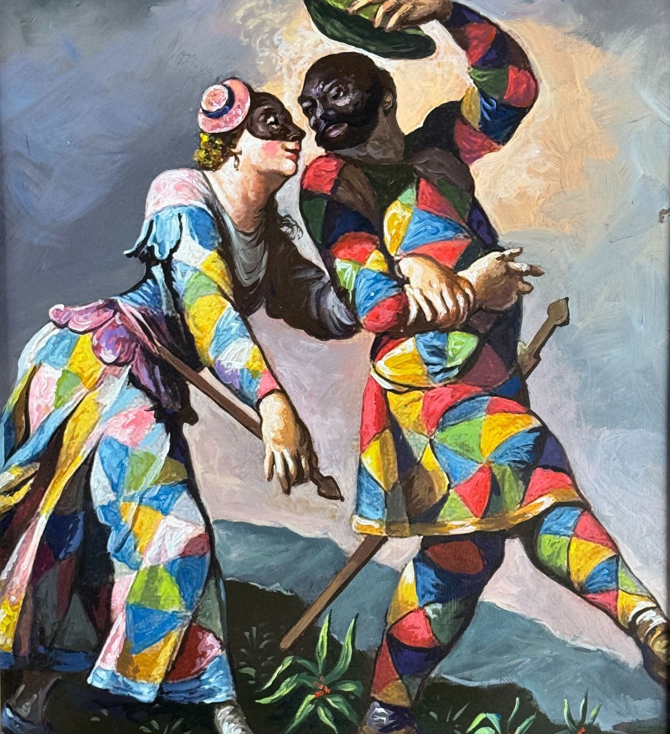 Dipinto olio su cartoncino, periodo XX secolo scuola Italiana, raffigurante Due personaggi in costume. Tratto da un lavoro di Giovanni Domenico Ferretti. Dimensioni compreso cornice: 46x61 cm. Dimensioni interno cornice: 35x50 cm. Reca firma in basso a destra artista non identificato. Opera in buone condizioni.
