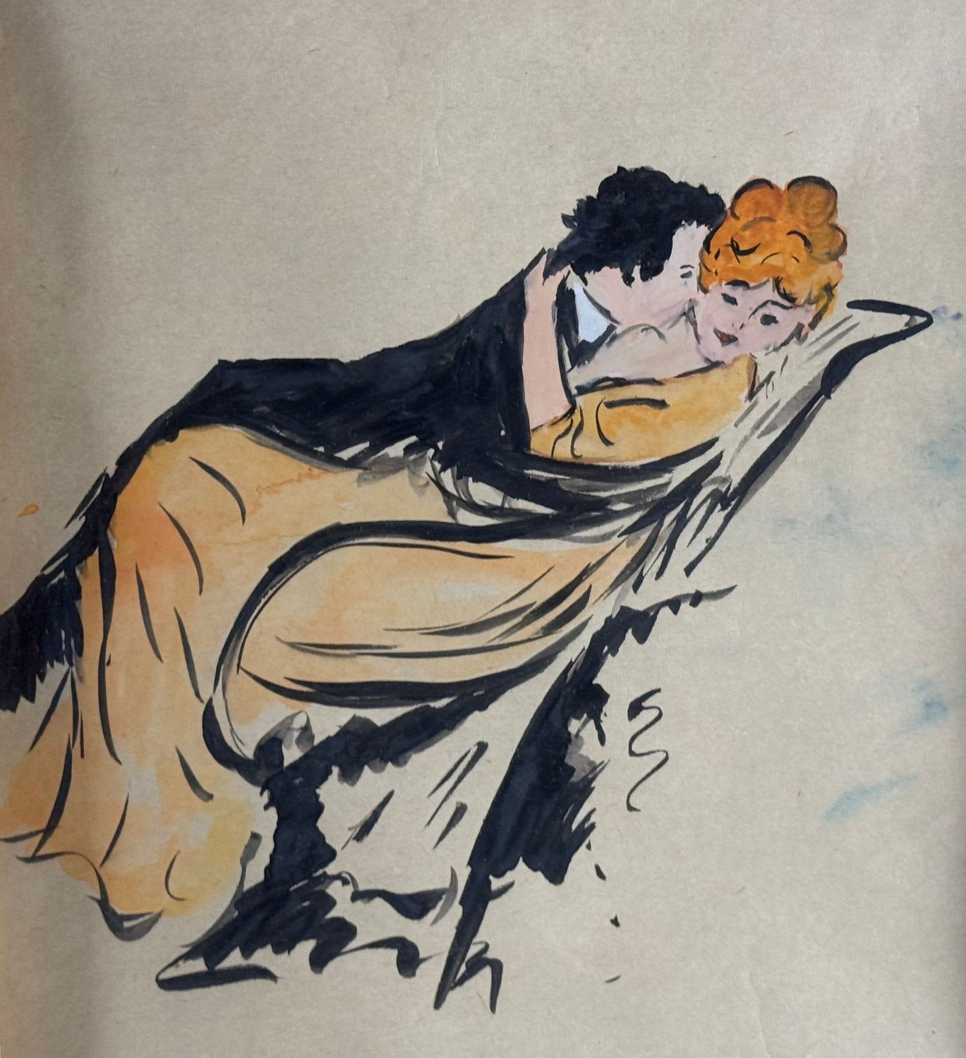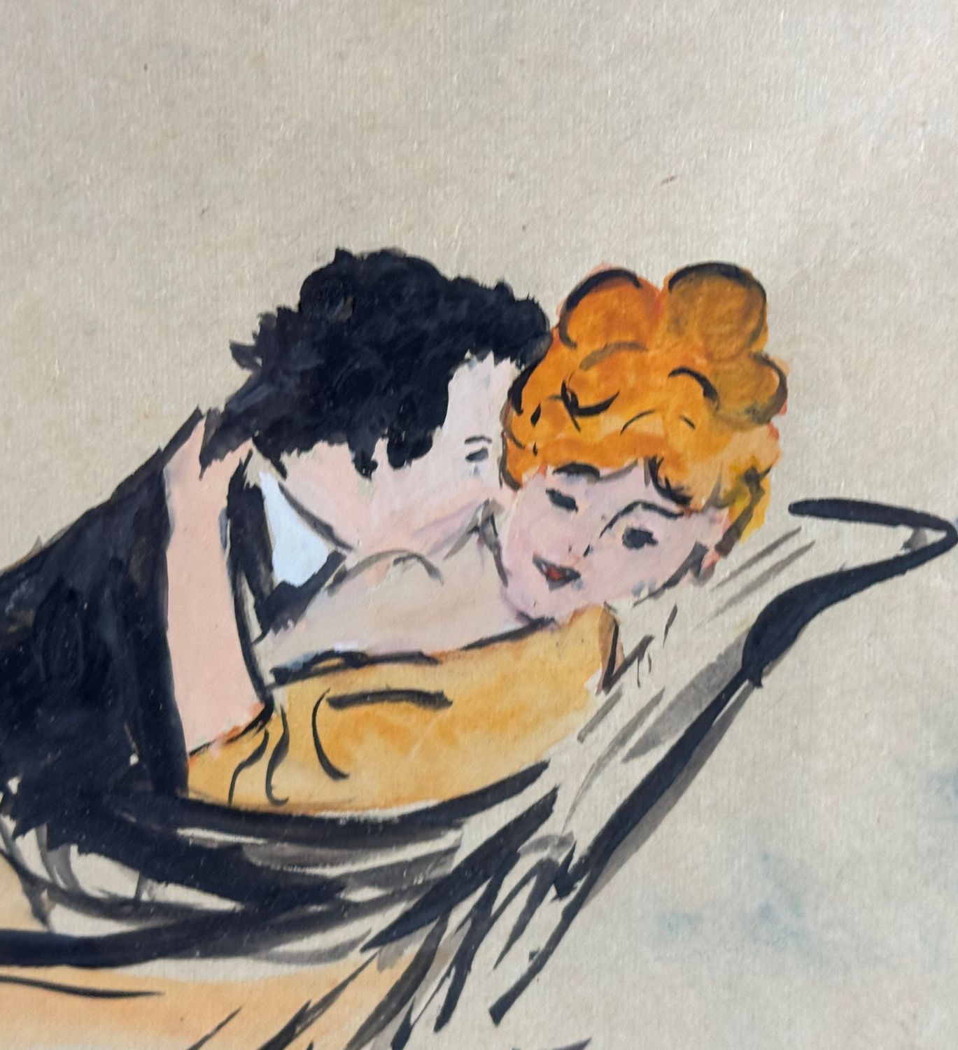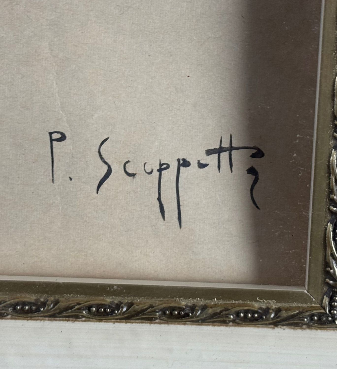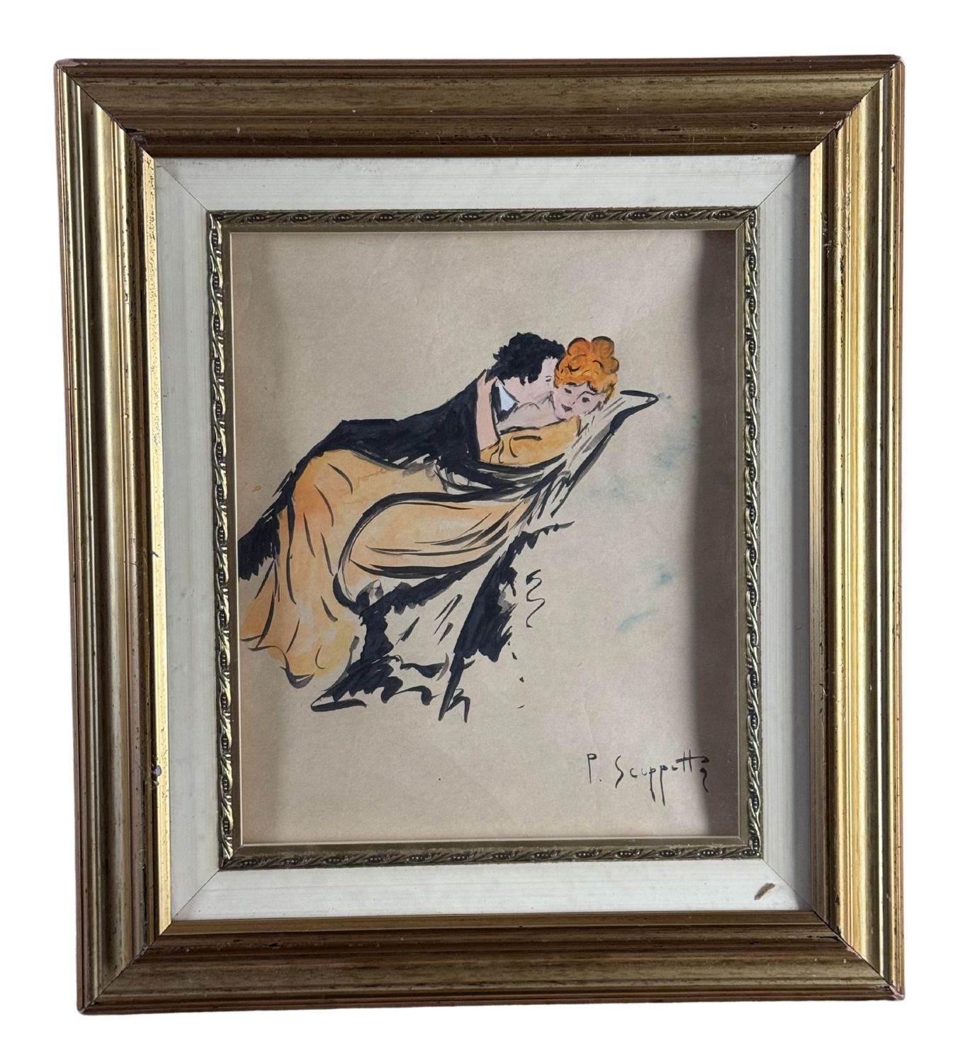 Dipinto acquerello su carta, periodo XX secolo scuola Italiana, omaggio a Pietro Scoppetta, raffigurante Scena galante. Dimensioni compreso cornice: 38x44 cm. Dimensioni interno cornice: 24x30 cm. Reca frima sul retro artista non identificato. Opera in buone condizioni.