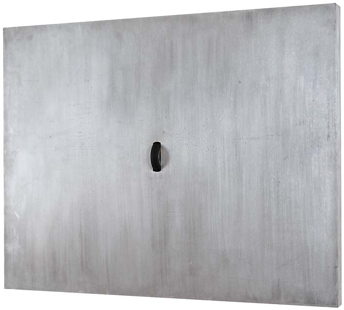 ONGARO ATHOS Eraclea (Ve) 1947 Rotella 1971 assemblaggio su acciaio satinato 75x94x6 cm esposizioni Galleria Katia Genova - etichetta al retro