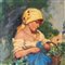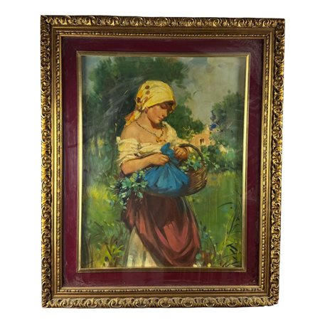 Dipinto olio su tela, periodo XX secolo scuola Italiana, raffigurante La venditrice di fiori. Dimensioni interno cornice: 60x75 cm. Dimensioni compreso cornice: 82x99 cm. Reca firma in basso a sinistra da artista non identificato. Opera in buone condizioni.