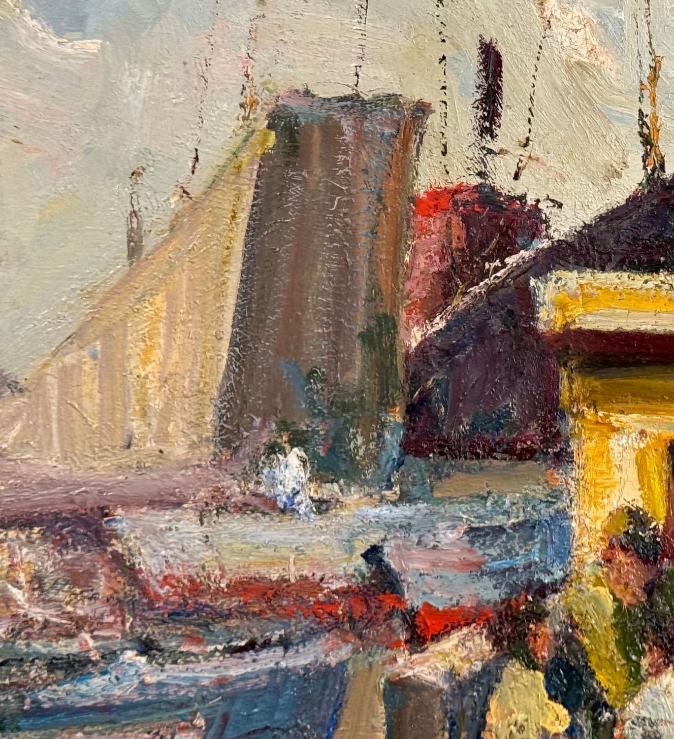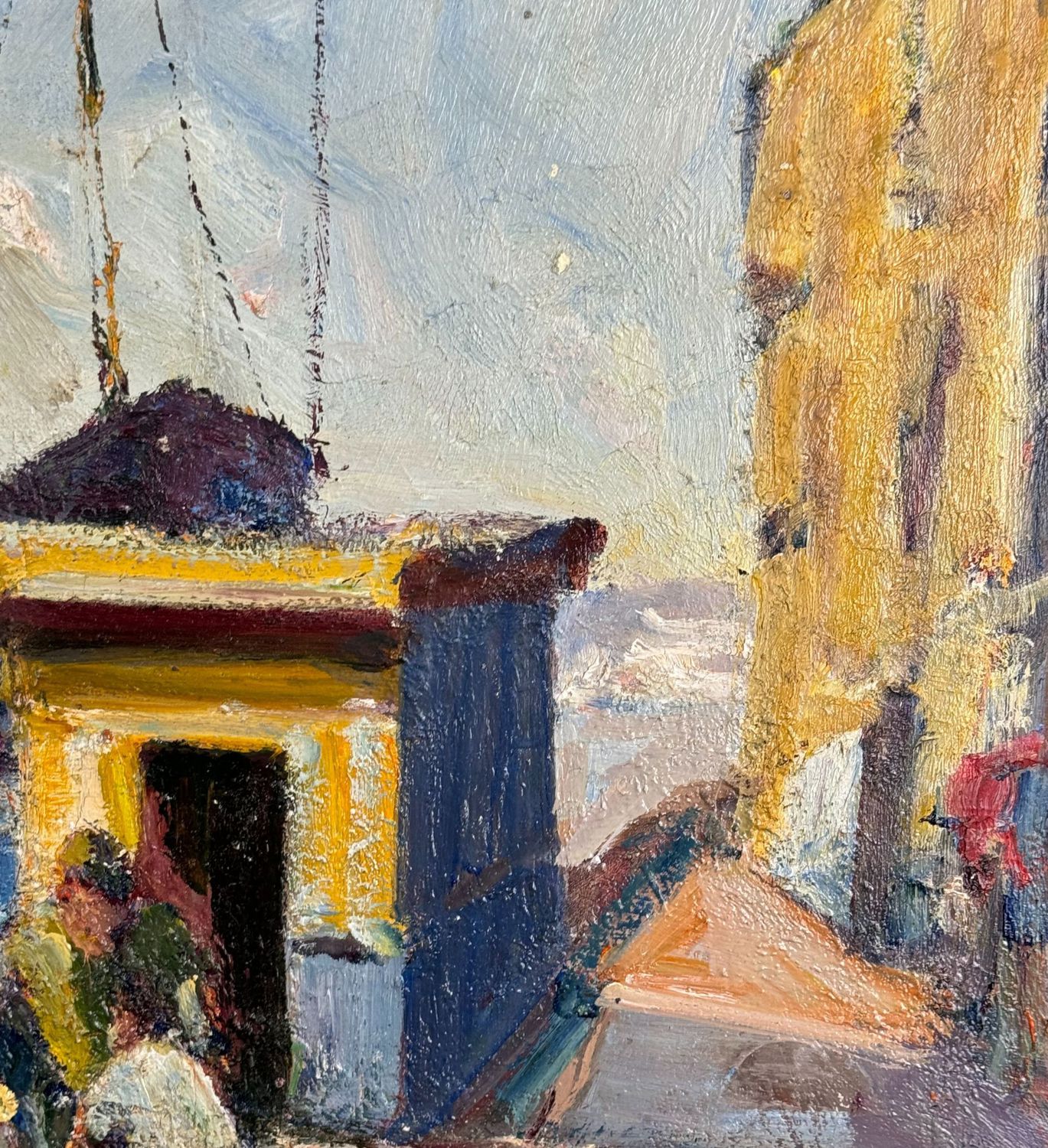 Dipinto olio su pannello, periodo XX secolo scuola italiana, raffigurante Marina a Pozzuoli con personaggi. Dimensioni: 50x40 cm. Reca firma in basso a destra da artista non identificato. Opera in buone condizioni.