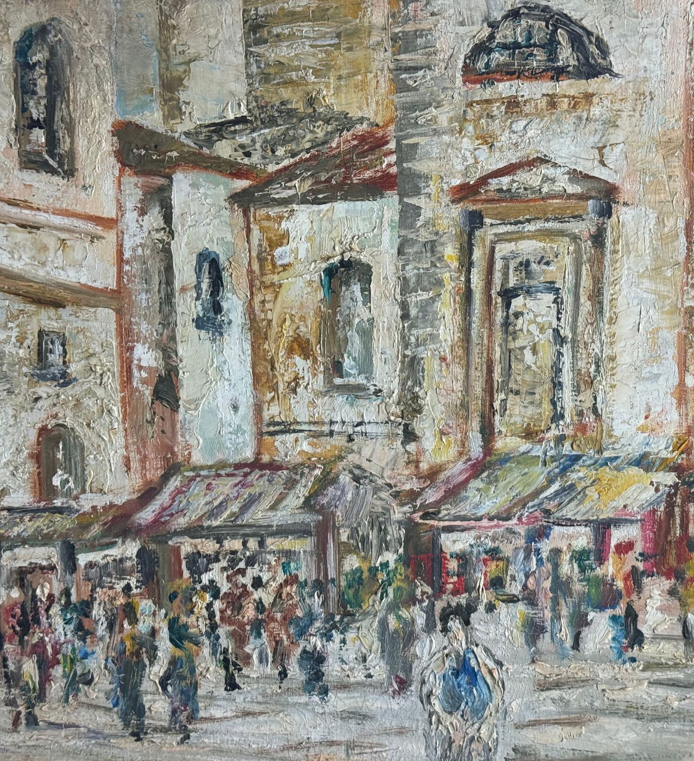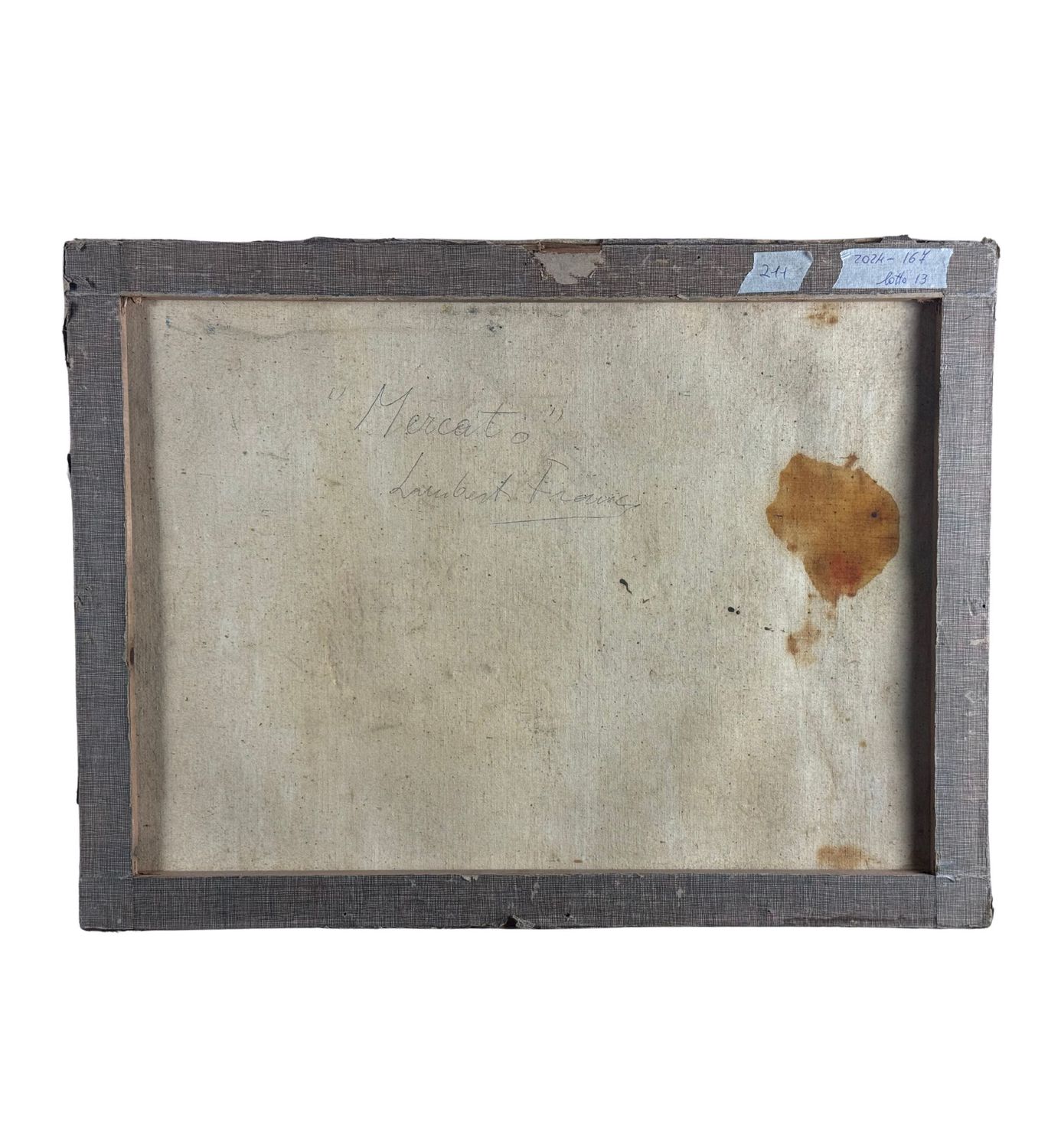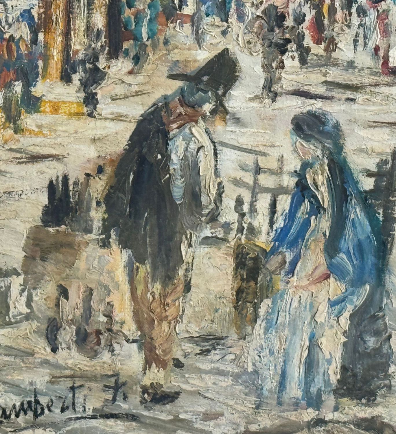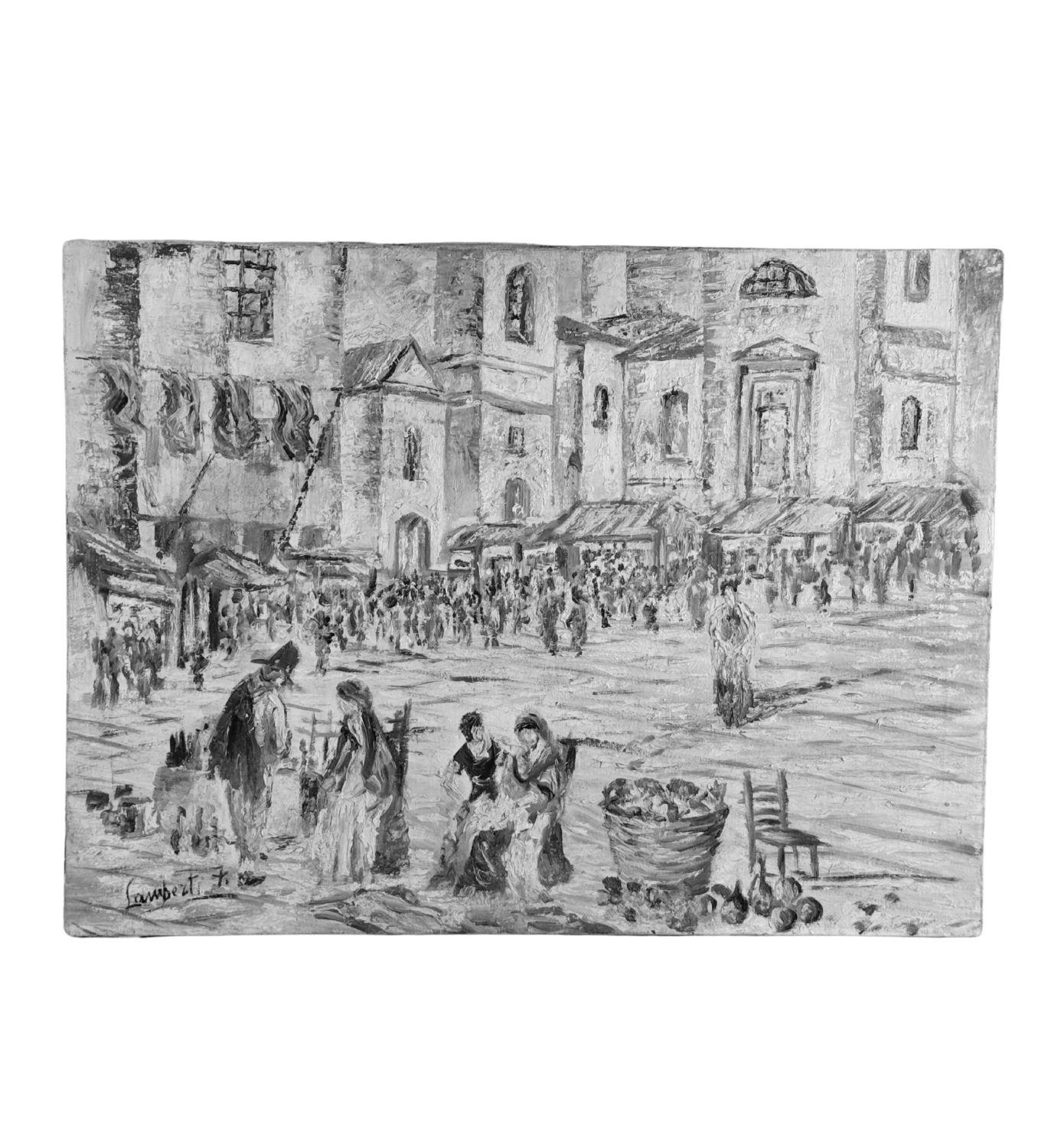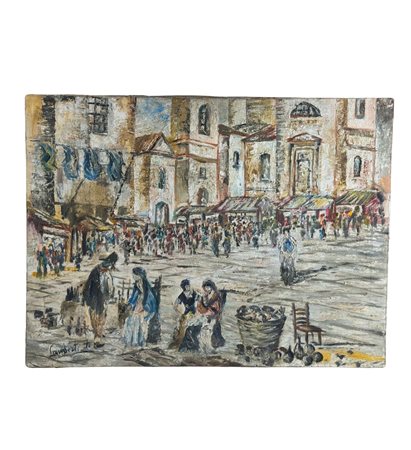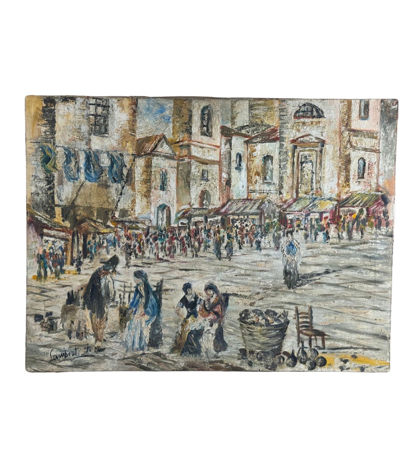 Dipinto olio su tela, periodo XX secolo scuola Italiana, raffigurante Mercato. Dimensioni: 60x45 cm. Reca firma in basso a sinistra da Lamberti Franco. Opera in buone condizioni.