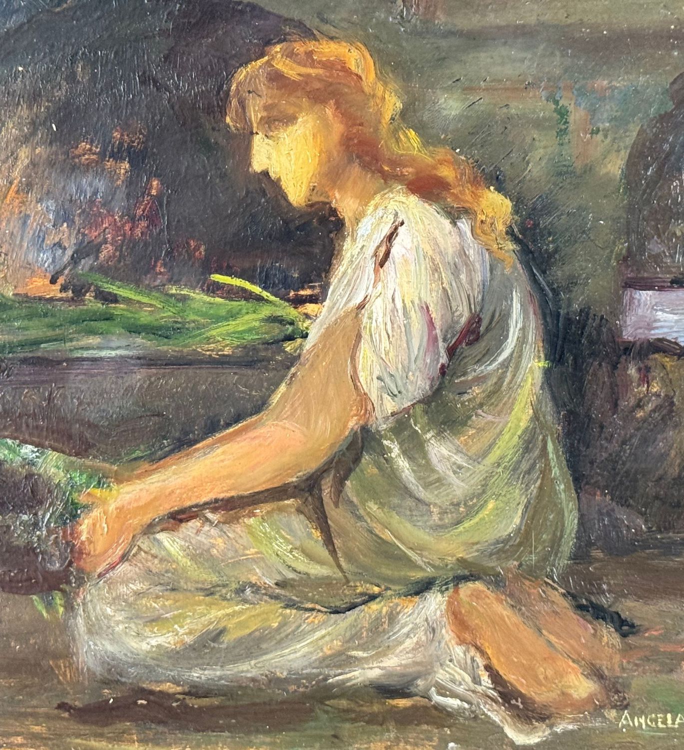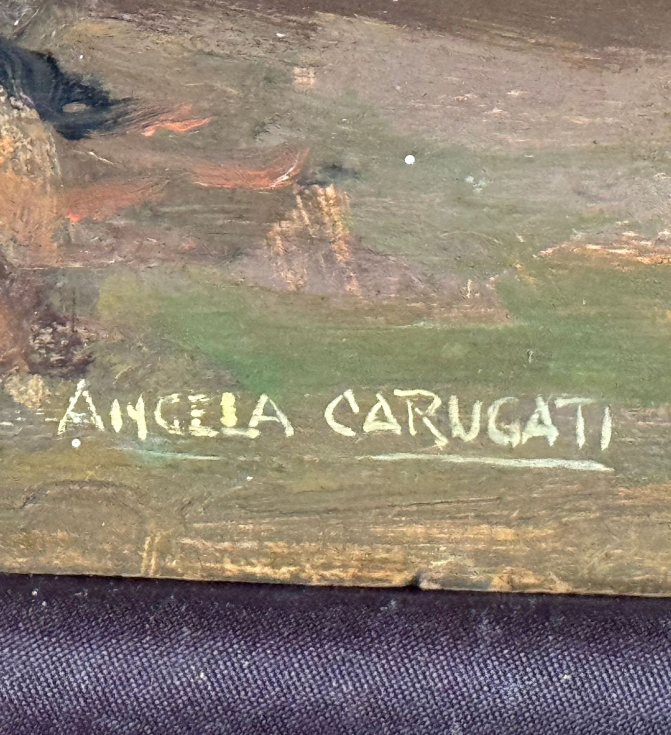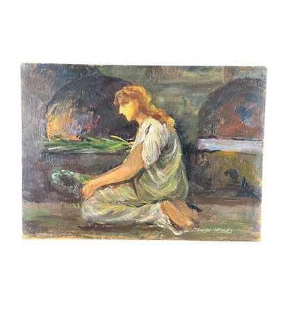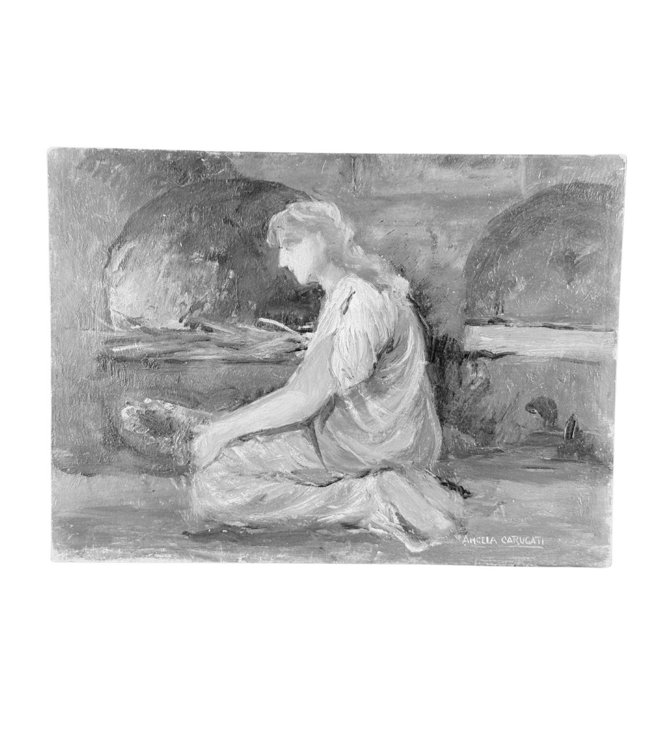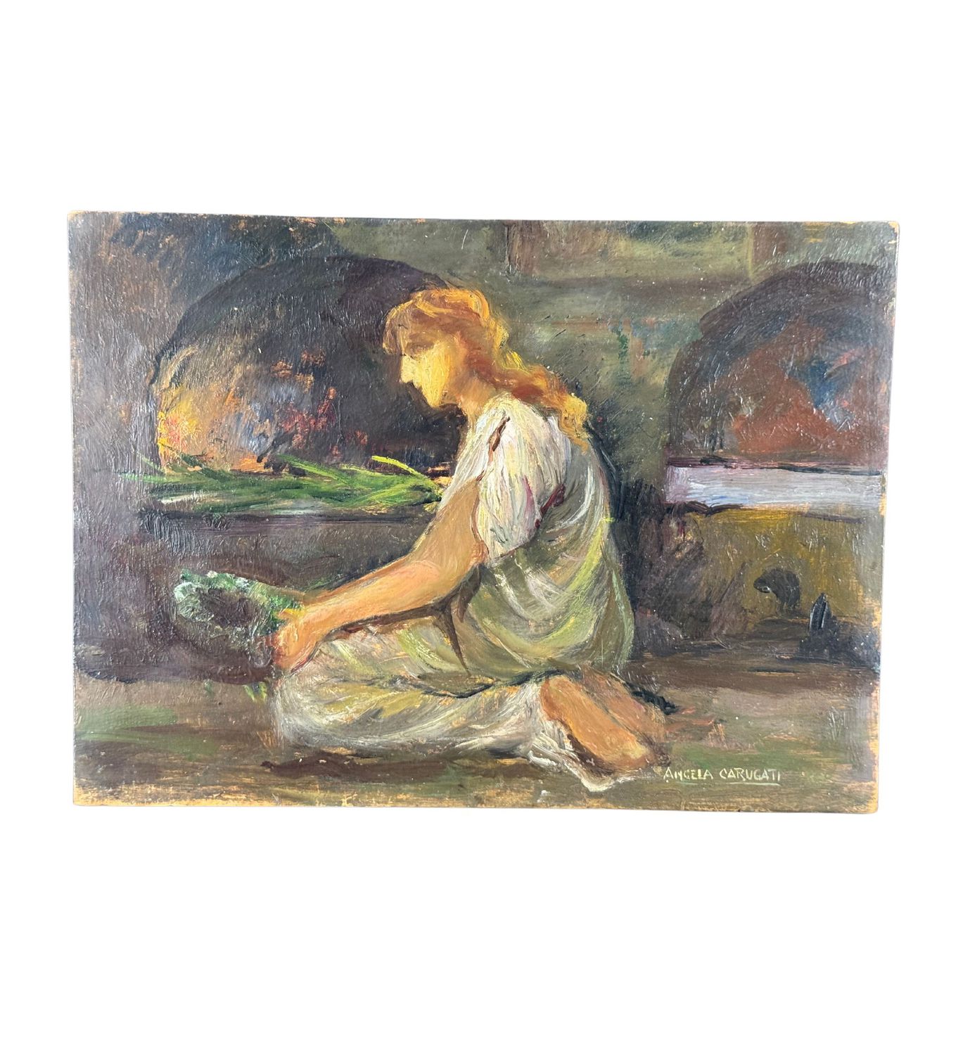 Dipinto olio su tavola, periodo XX secolo scuola Italiana, raffigurante Ritratto di donna al camino. Dimensioni: 33x24 cm. Reca firma in basso a destra da Angela Carugati. Opera in buone condizioni.